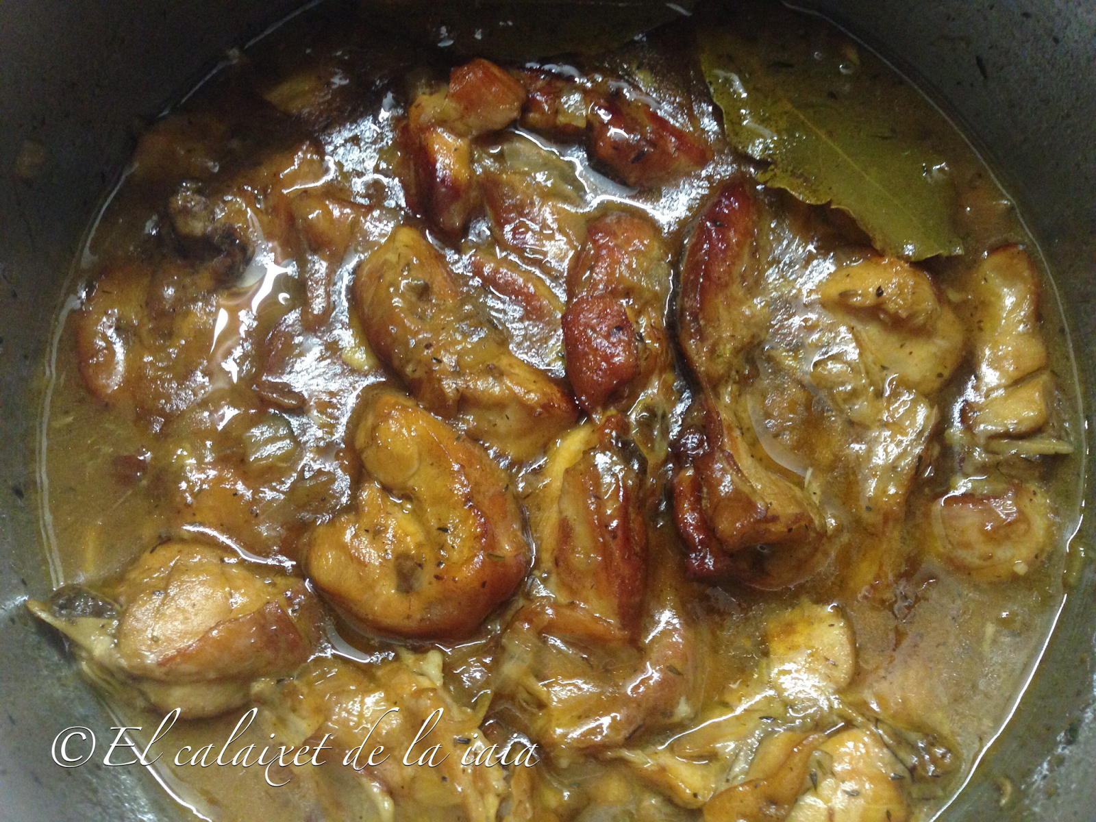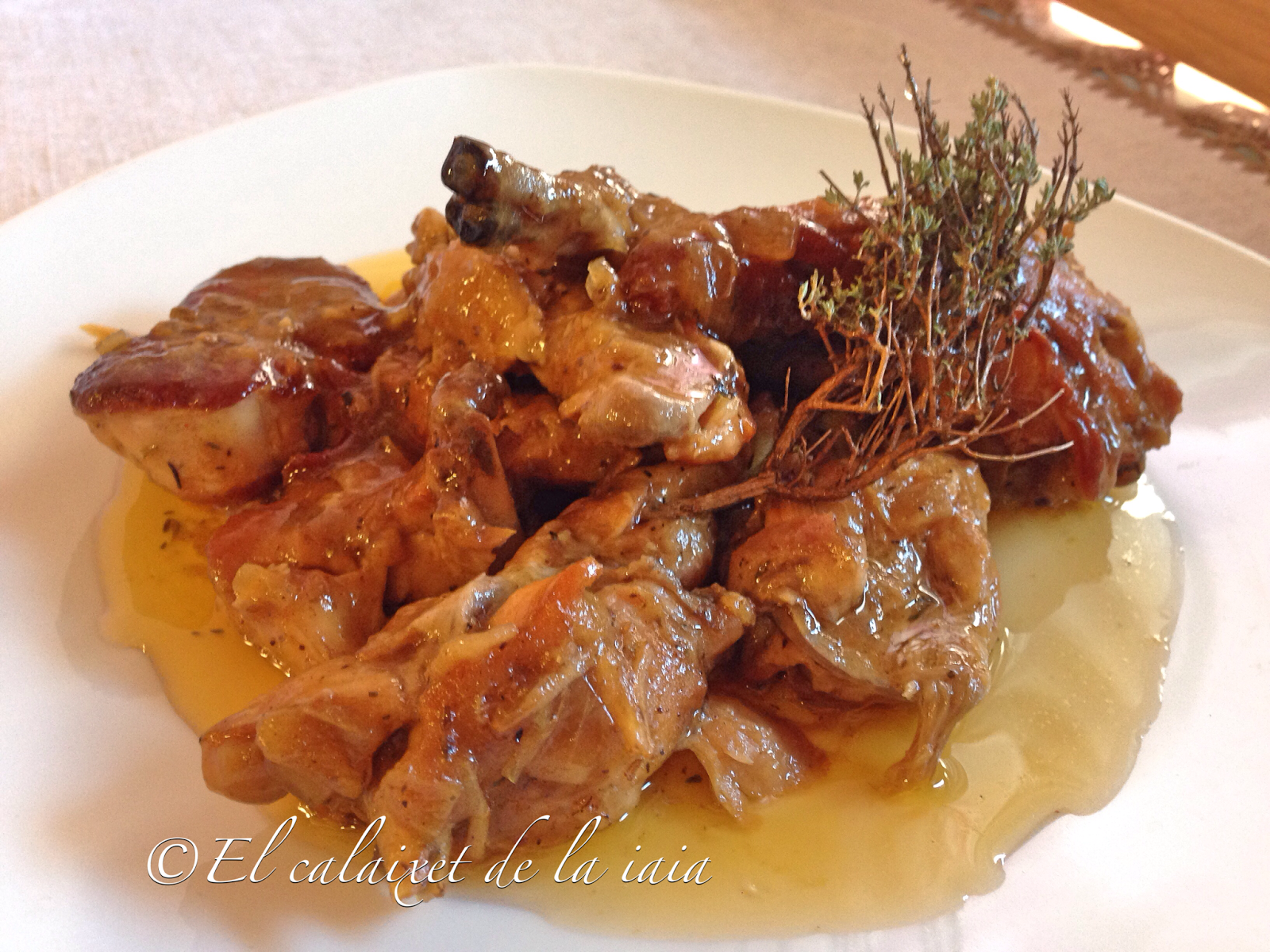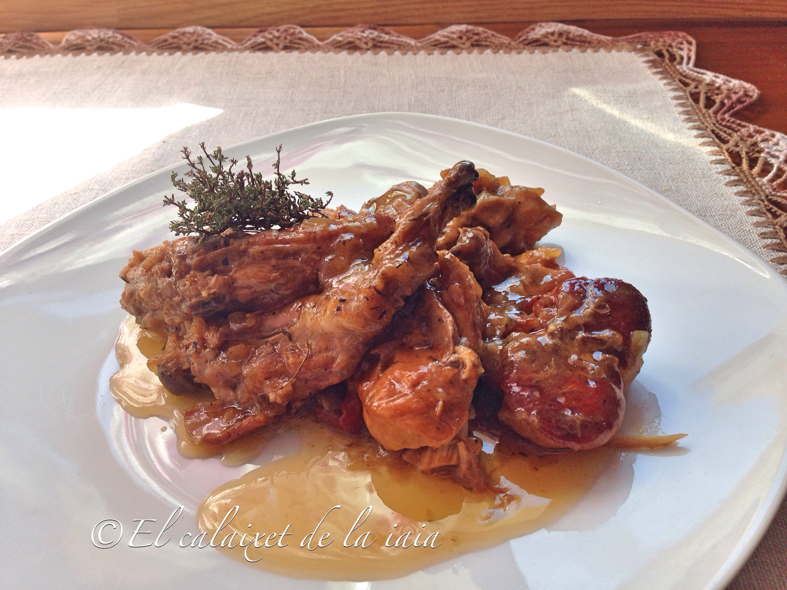 Pues nosotros hoy hemos tenido la suerte de comer un conejito recién alcanzado, aquí está ya guisadito y troceado, dispuesto para dar buena cuenta de él. Es un conejo criado de casa y ecológico, aunque mejor ni lo pienso, porque entonces, ni lo como, y me perdería un auténtico manjar como podréis comprobar
