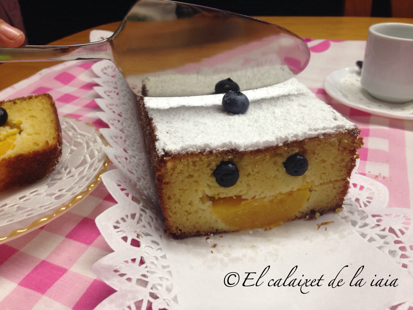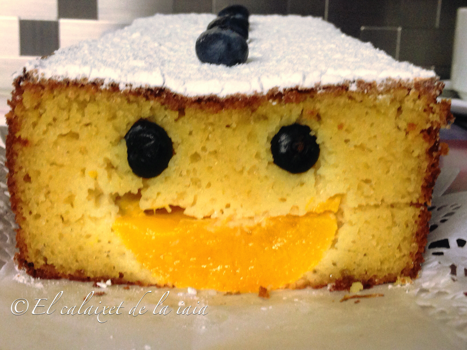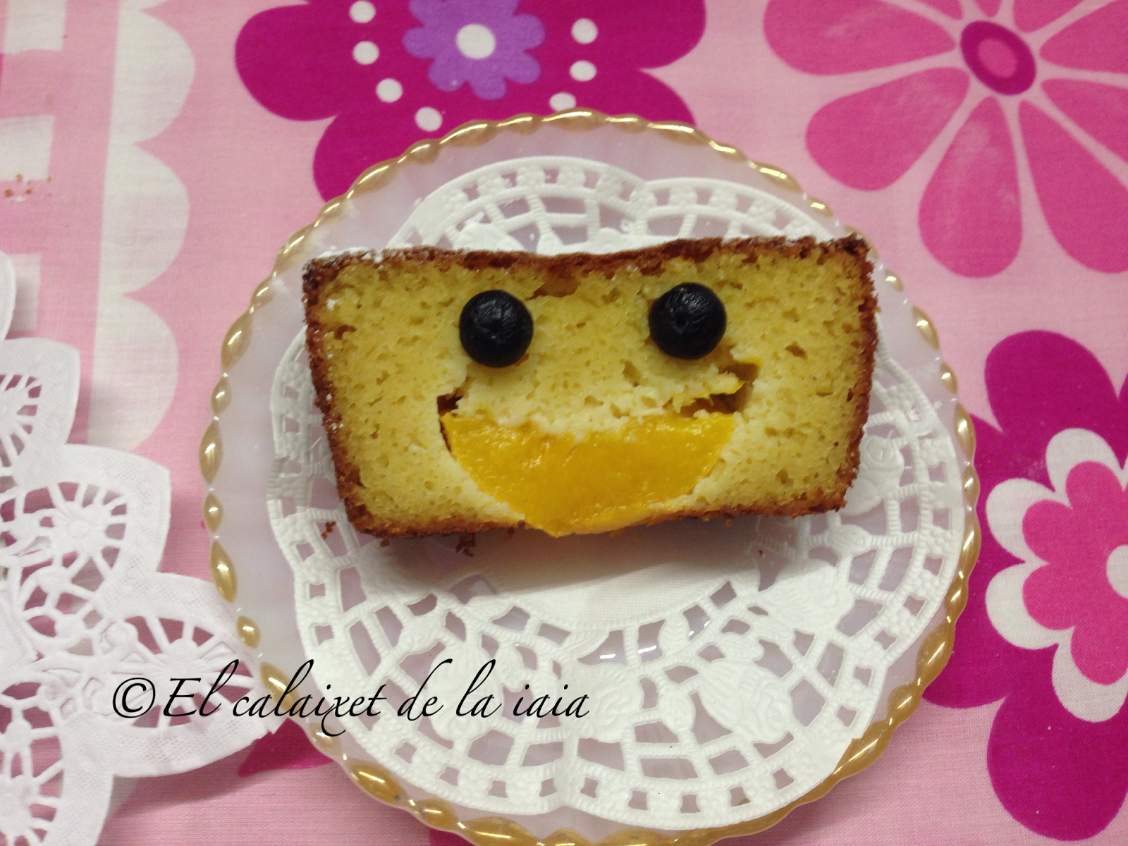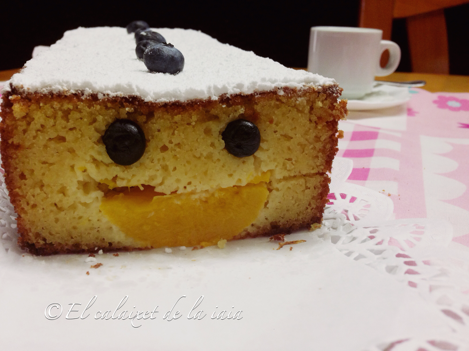 Siempre le hemos llamado en casa, bizcocho de melocotón, hasta que al cortar una porción a mi nieta, me dijo que parecía que el bizcocho tenía sonrisa, y así lo bautizamos, a la peque se le ocurrió ponerle ojitos con lacasitos, otra vez, fueron dos gotas de chocolate y hoy han sido unos arándanos…..¡imaginación al poder! y sonriamos, sonriamos, sonriamos, sonriamos…. muchíiiiisimo, todo lo posible, que aunque la vida nos pone un tropiezo tras otro, siempre, siempre, podemos encontrar un motivo para sonreír y si no ¡LO BUSCAMOS!!!!!!
