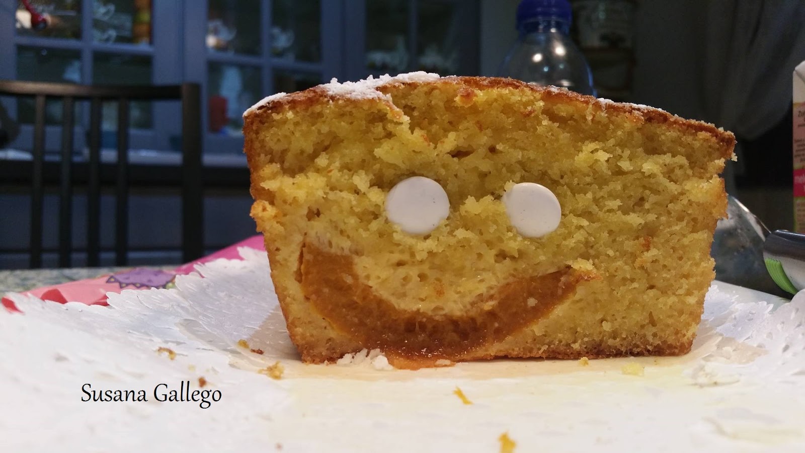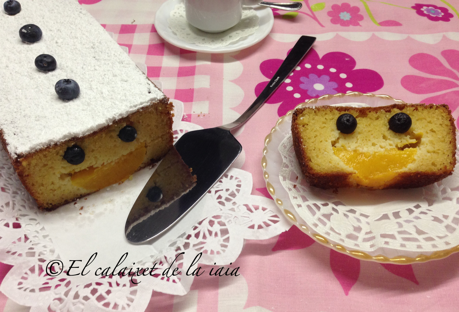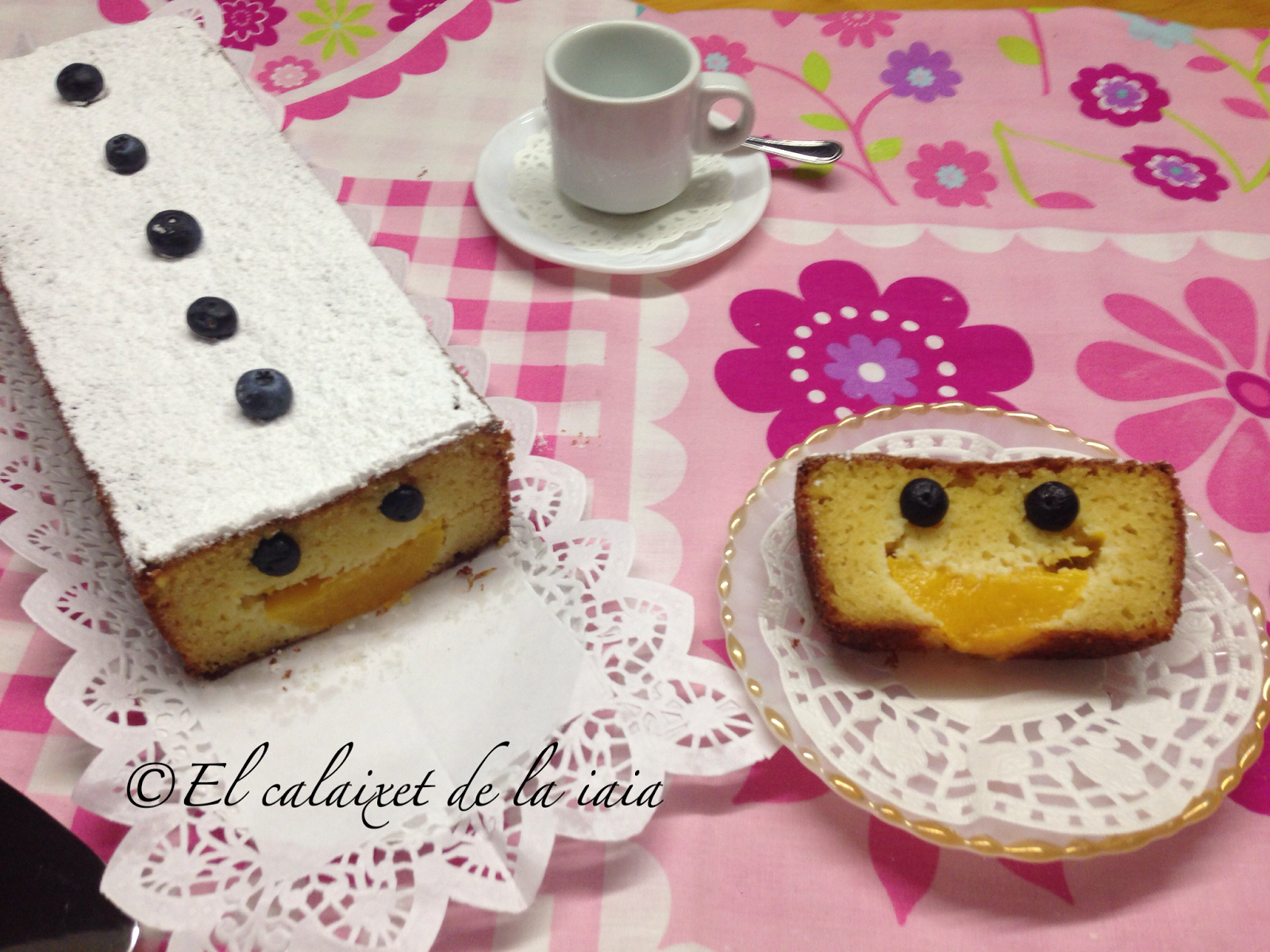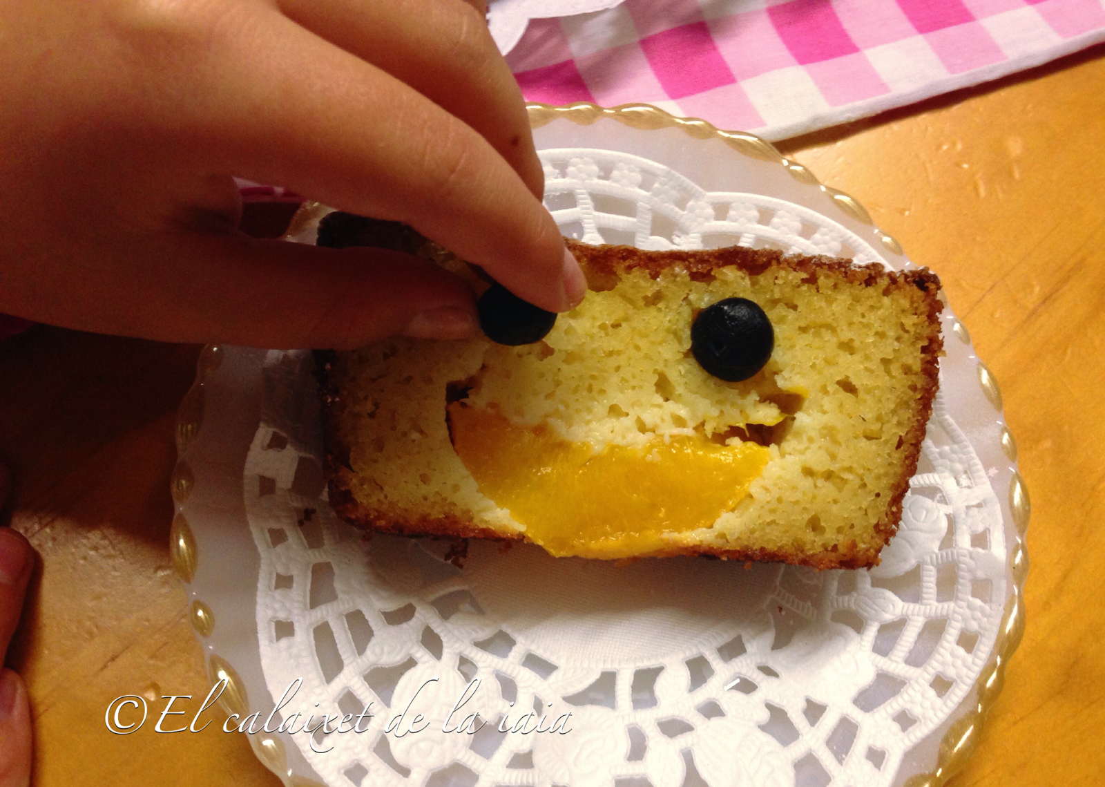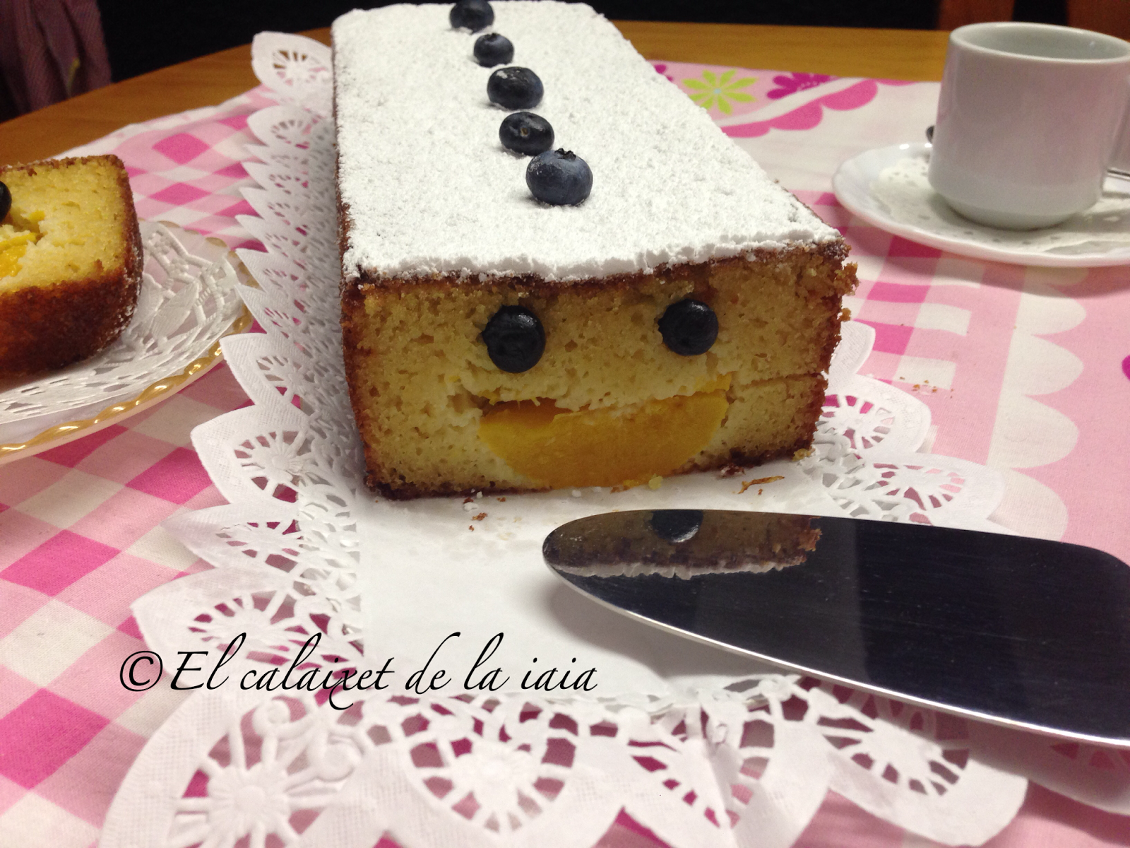 Siempre le hemos llamado en casa, bizcocho de melocotón, hasta que al cortar una porción a mi nieta, me dijo que parecía que el bizcocho tenía sonrisa, y así lo bautizamos, a la peque se le ocurrió ponerle ojitos con lacasitos, otra vez, fueron dos gotas de chocolate y hoy han sido unos arándanos…..¡imaginación al poder! y sonriamos, sonriamos, sonriamos, sonriamos…. muchíiiiisimo, todo lo posible, que aunque la vida nos pone un tropiezo tras otro, siempre, siempre, podemos encontrar un motivo para sonreír y si no ¡LO BUSCAMOS!!!!!!