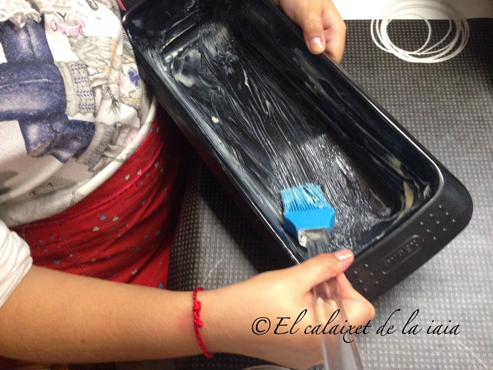 Untamos un molde con mantequilla y si el interior no es de teflón de calidad, espolvoreamos con harina encima de la mantequilla. Ponemos a calentar el horno a 180º