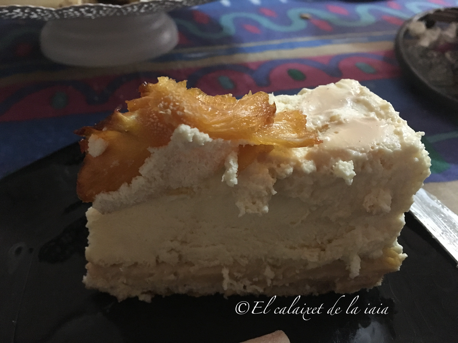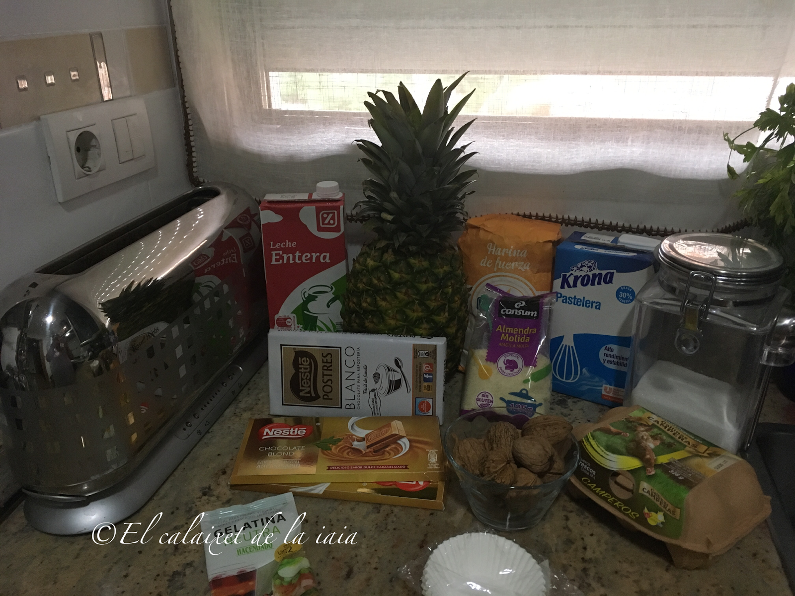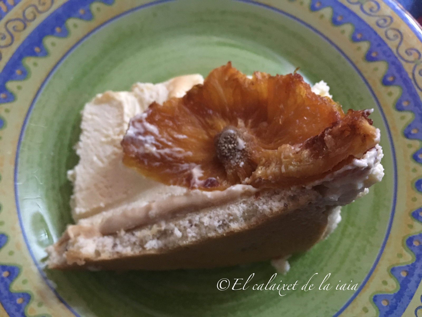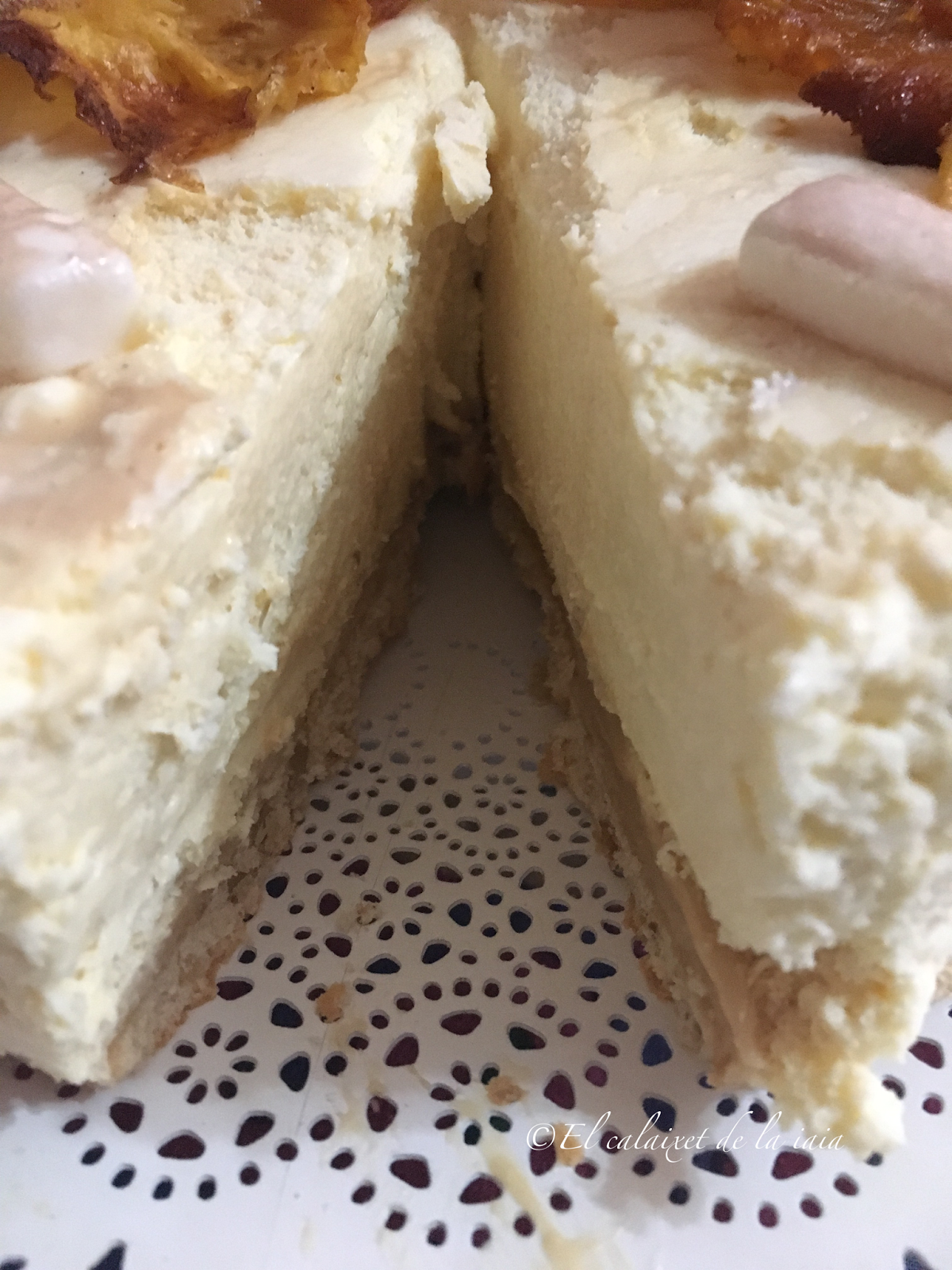 Ha merecido la pena hacer el paso a paso, para mostraros como hacer esta tarta fría de mousse de chocolate blanco, con chocolate al caramelo, sobre una base de bizcocho de almendra y nueces y decorada con flores de piña natural.
