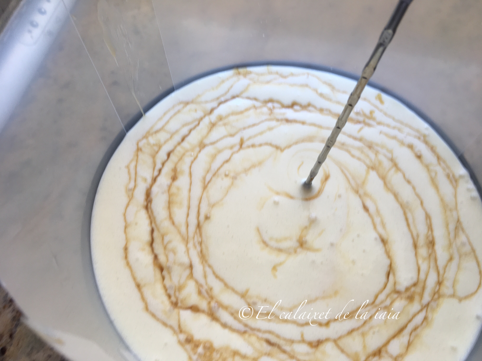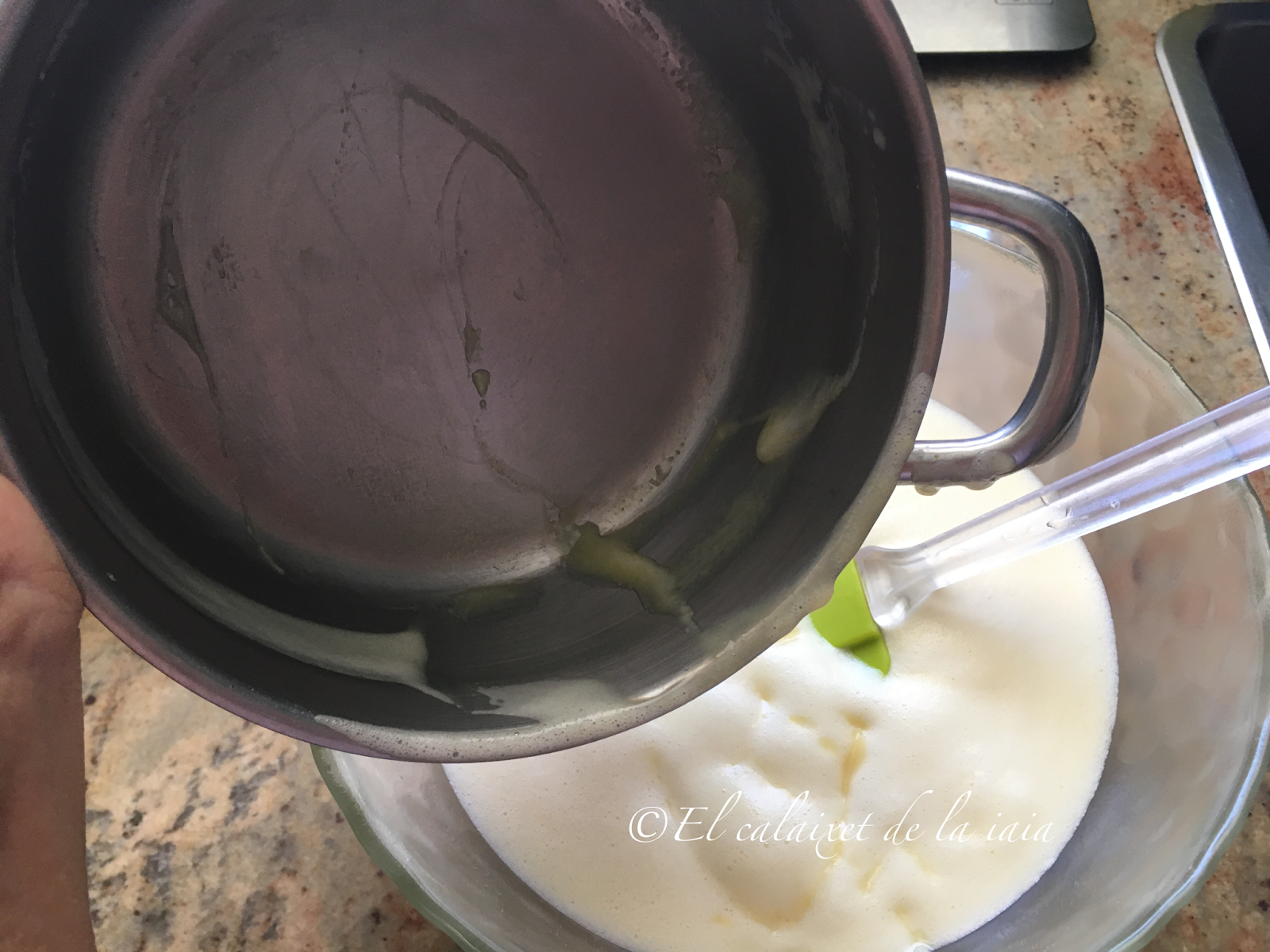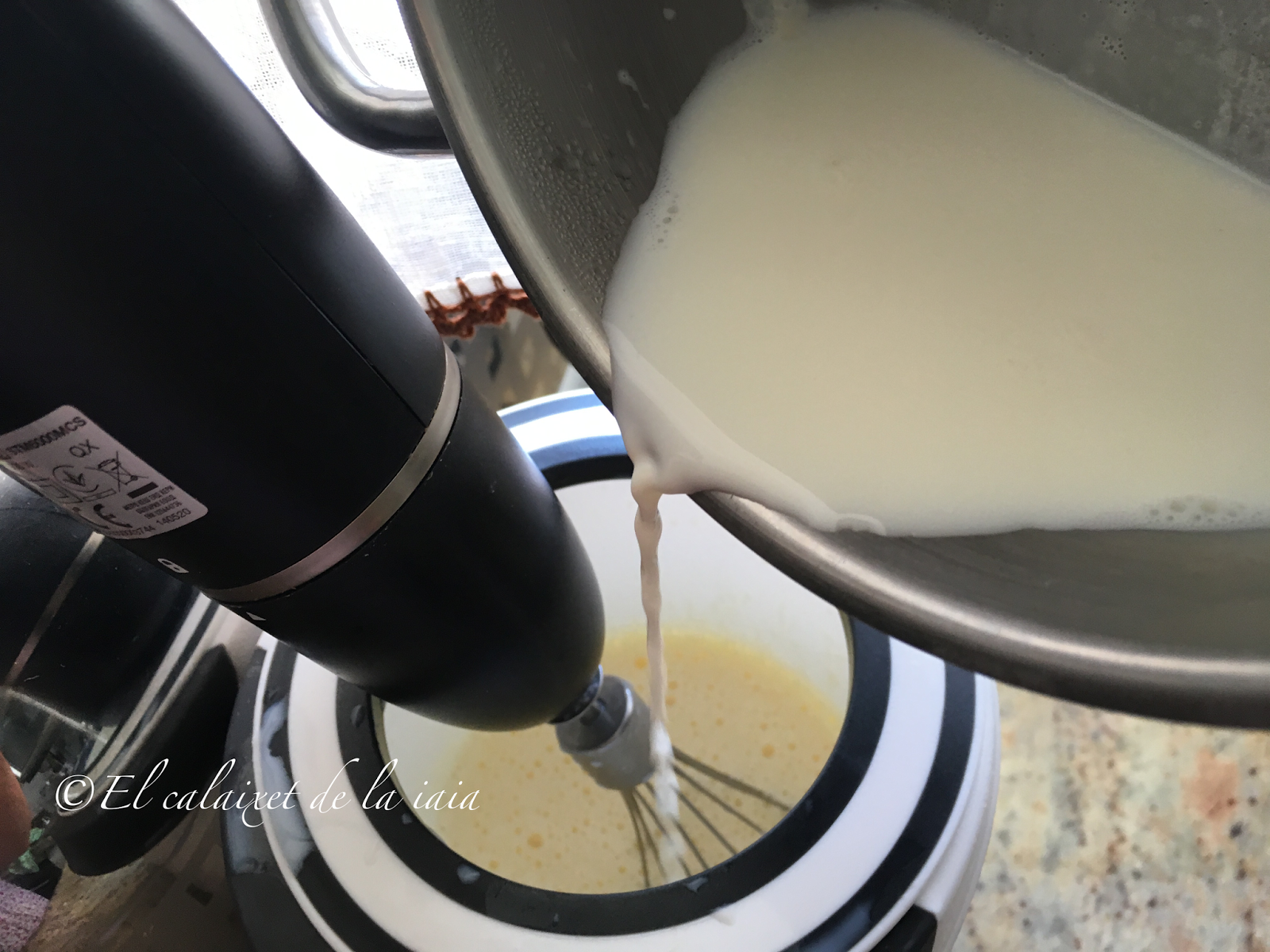 una vez blanqueadas las yemas, iremos echando la leche caliente al hilo a la mezcla sin dejar de batir