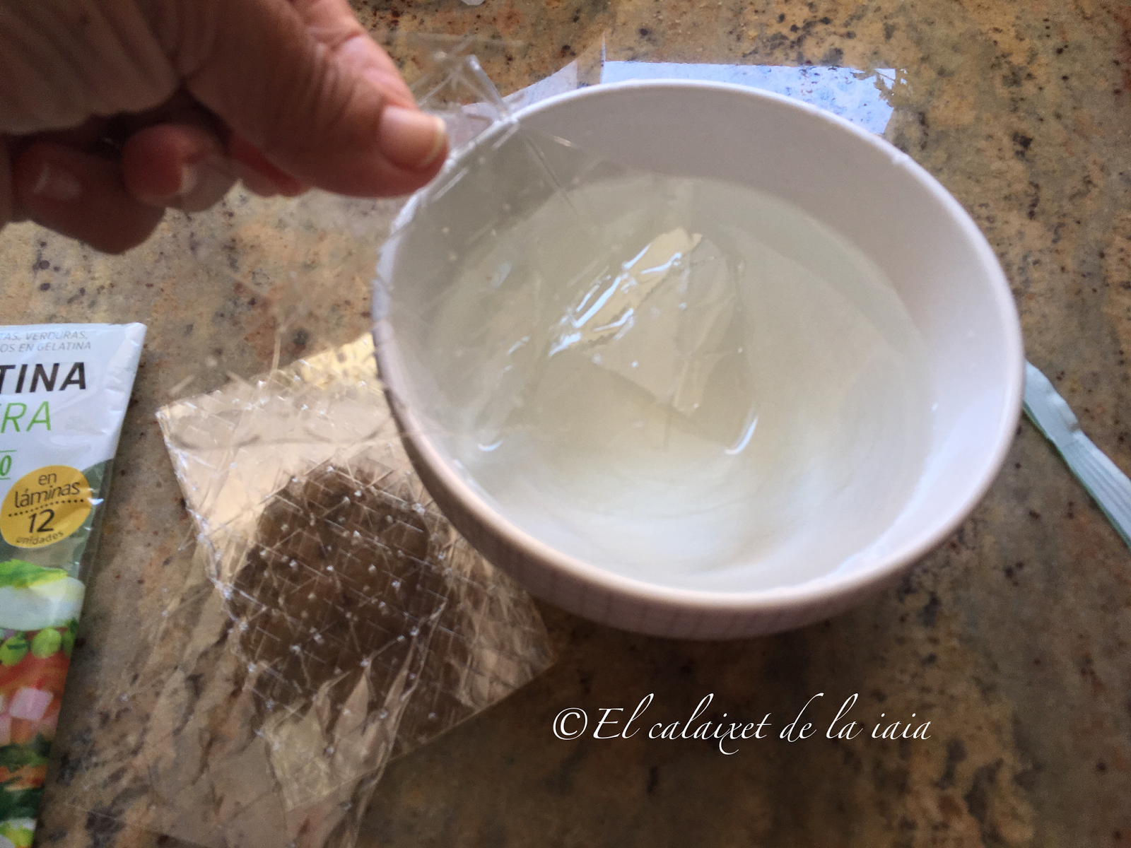 En agua tibia ponemos cinco hojas de gelatina a hidratar, o seguimos las instrucciones del fabricante