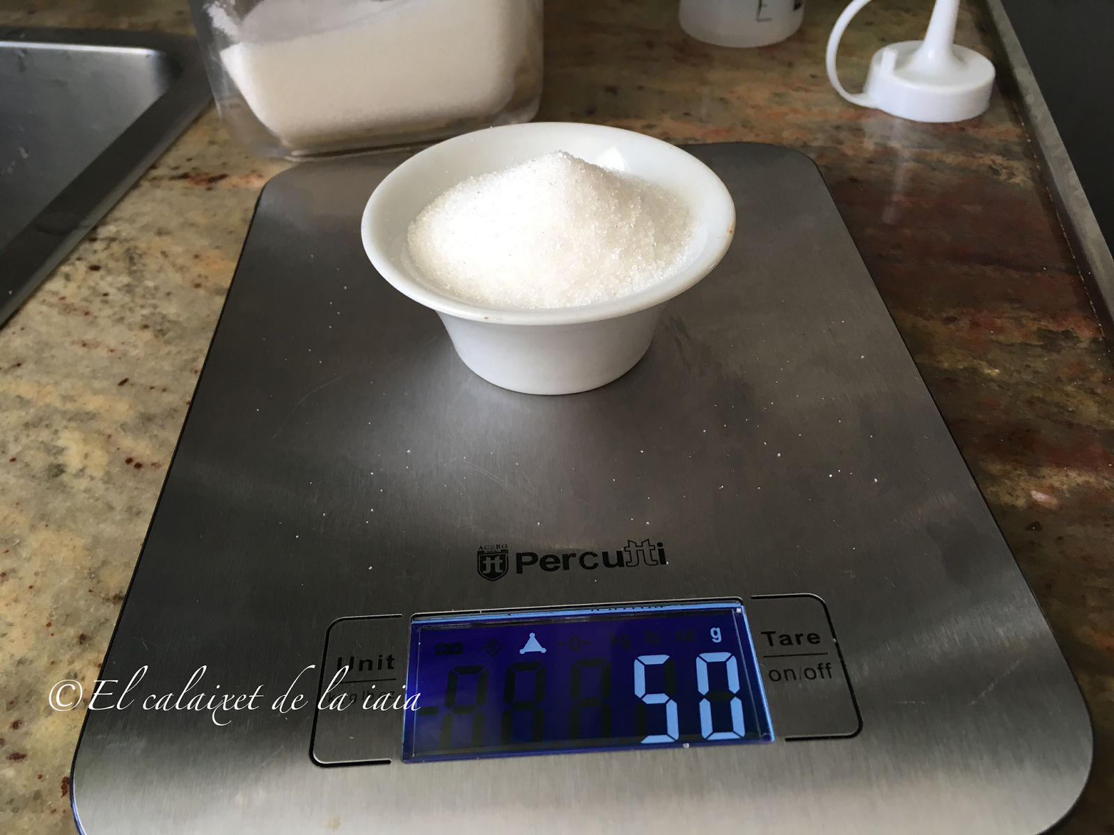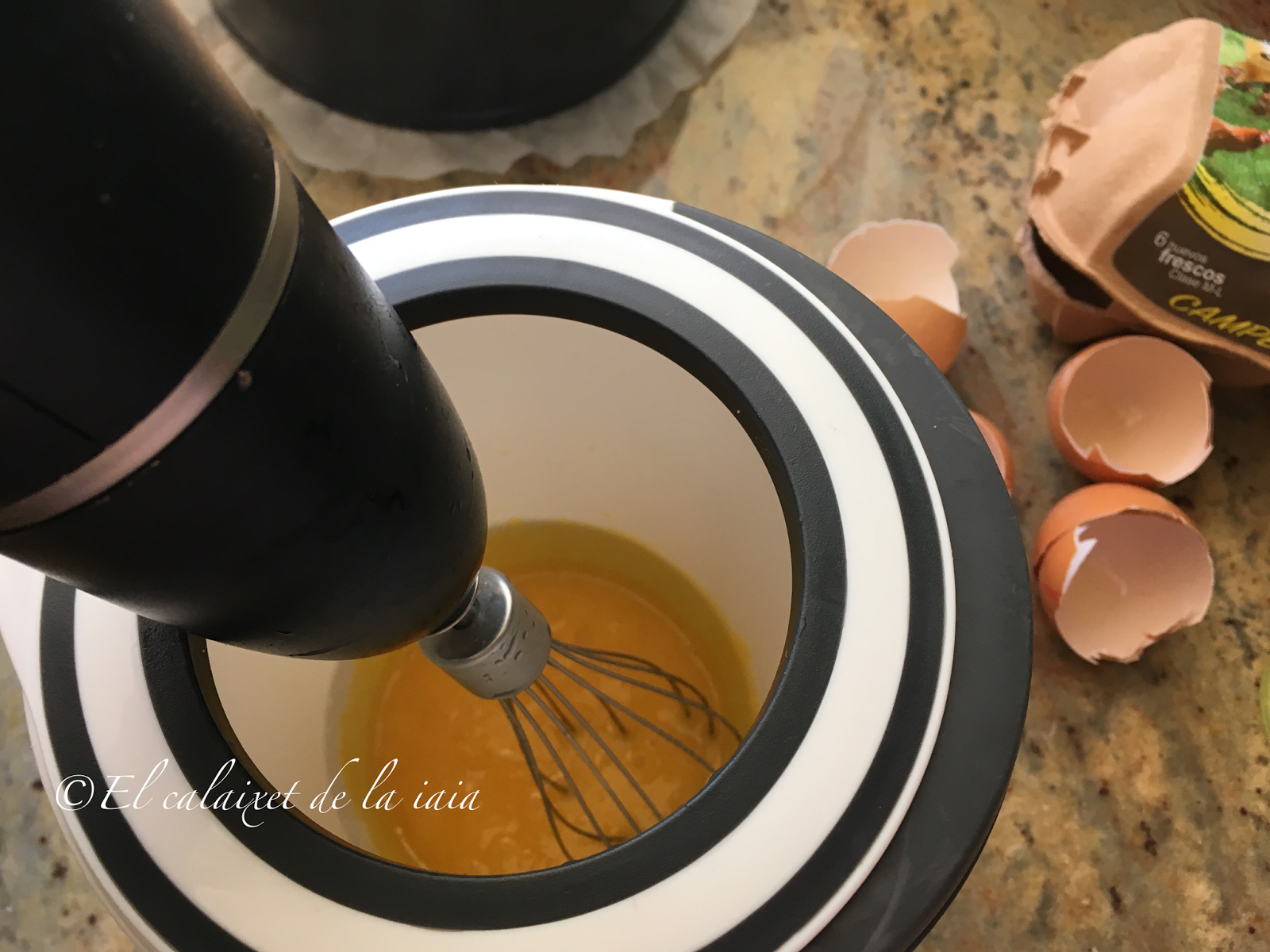 y añadimos a las yemas 50g de azúcar blanquilla con varillas eléctricas o a mano