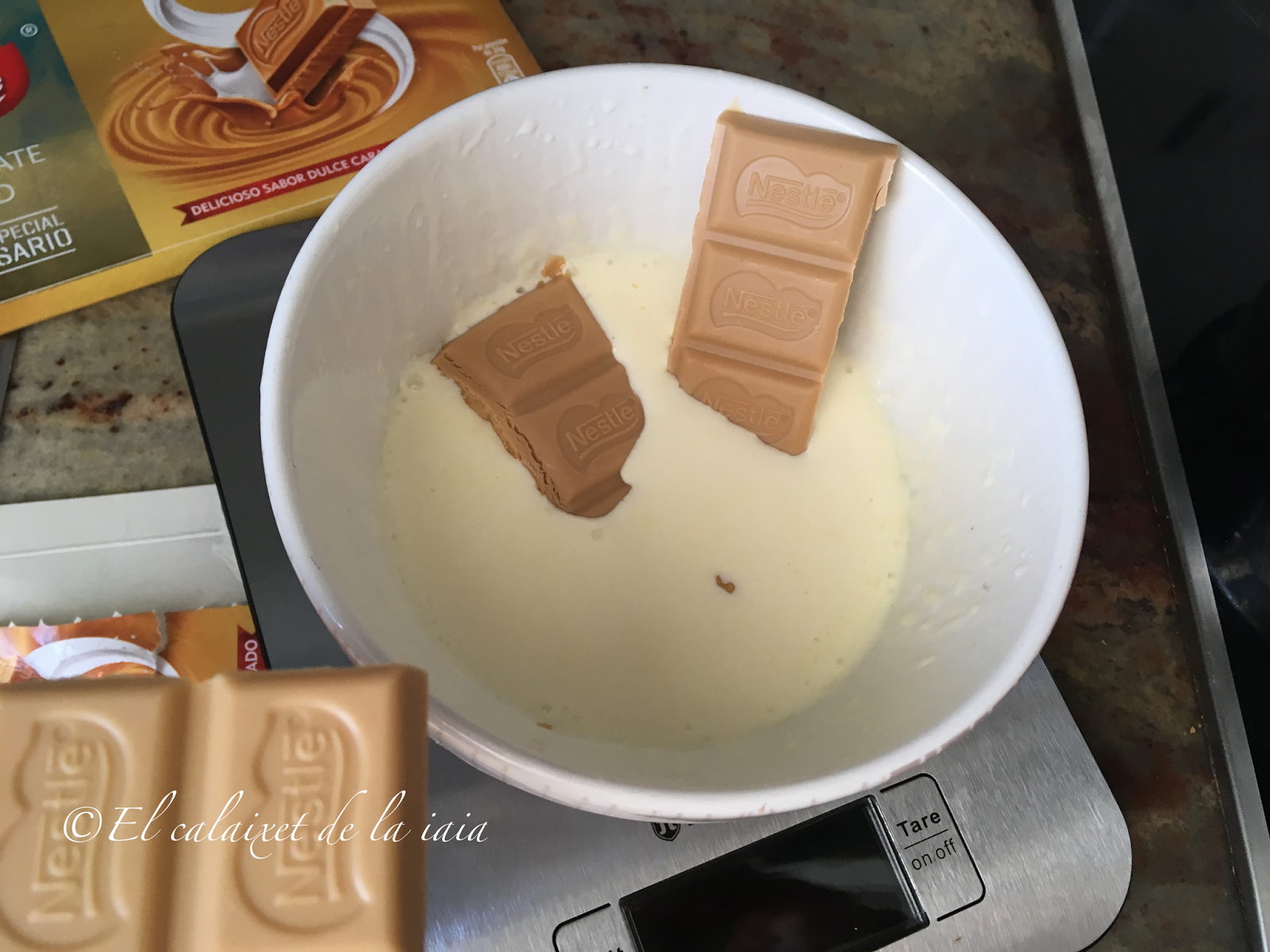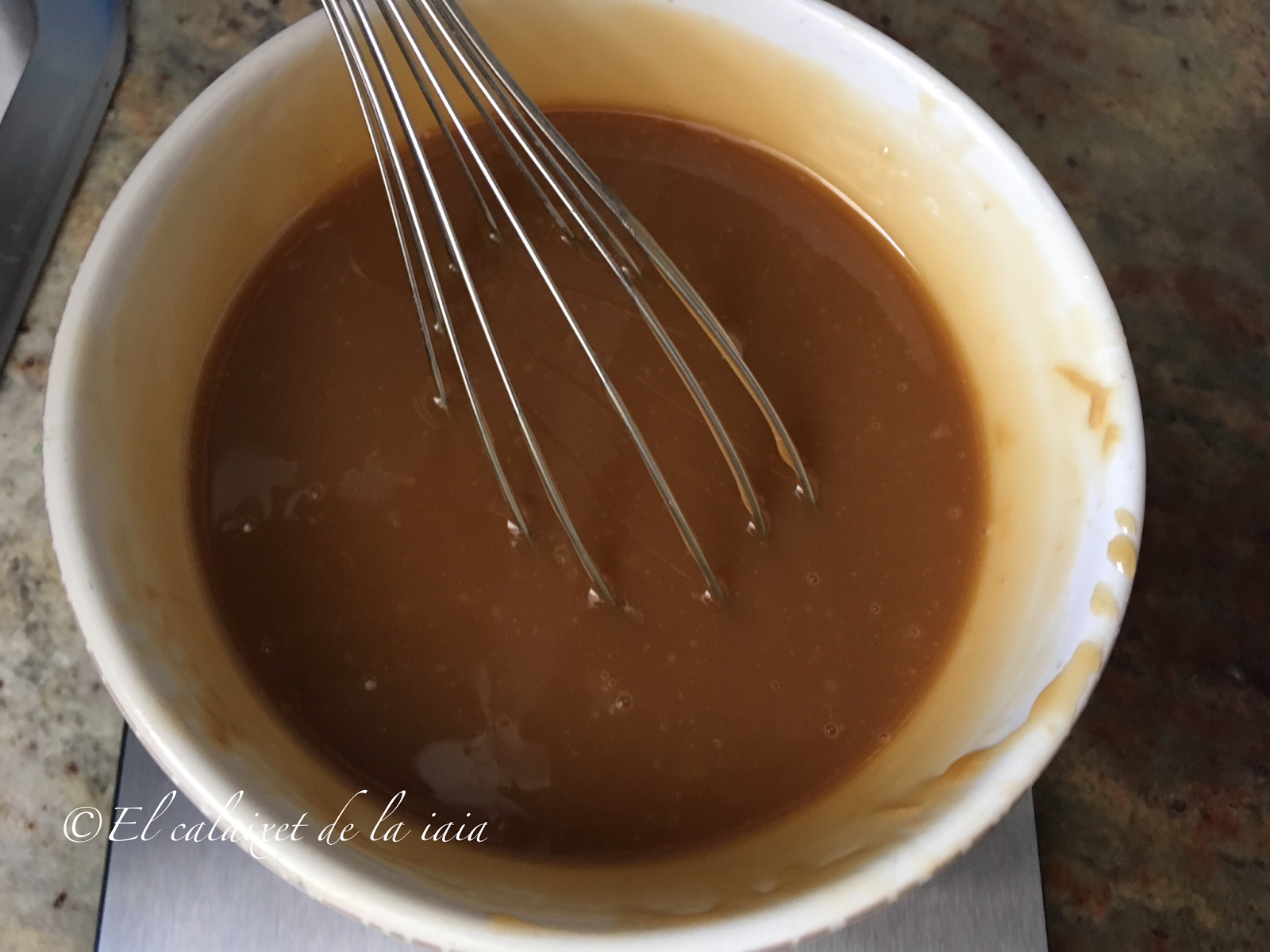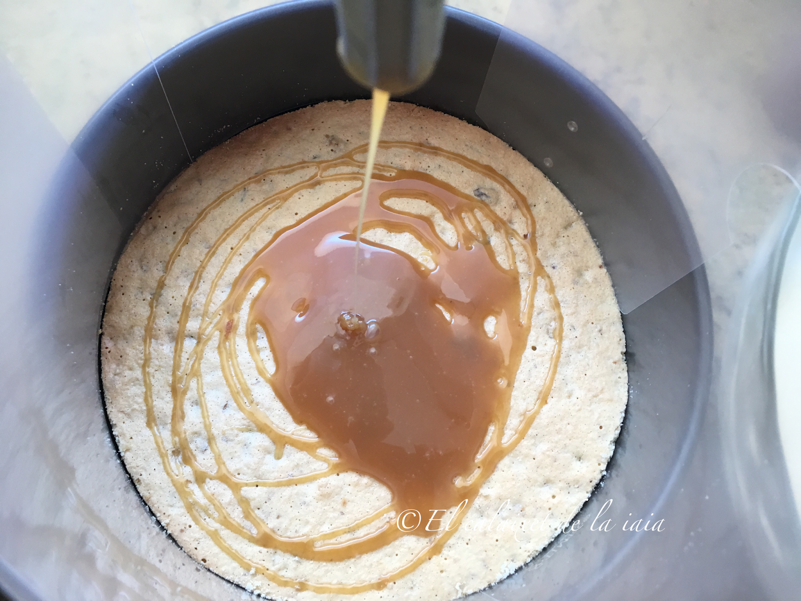 y cubriremos la base de bizcocho con una capa decapa de chocolate al caramelo