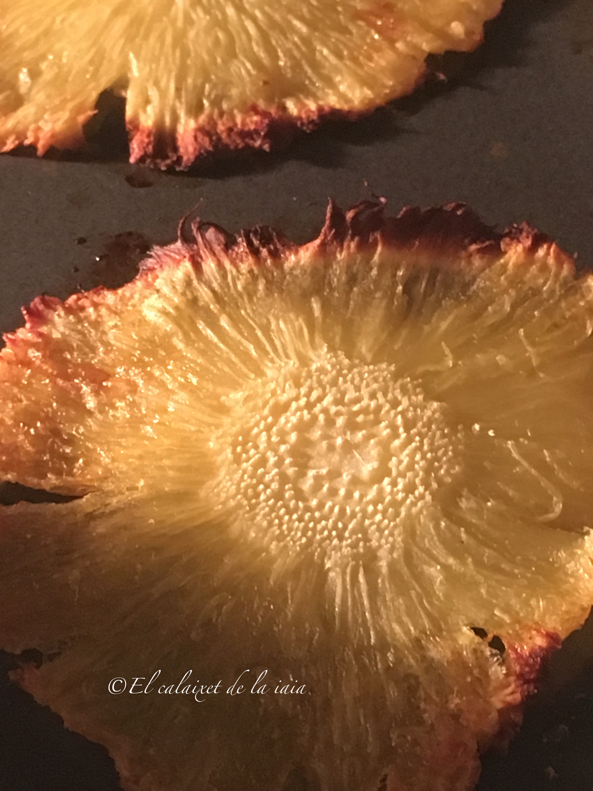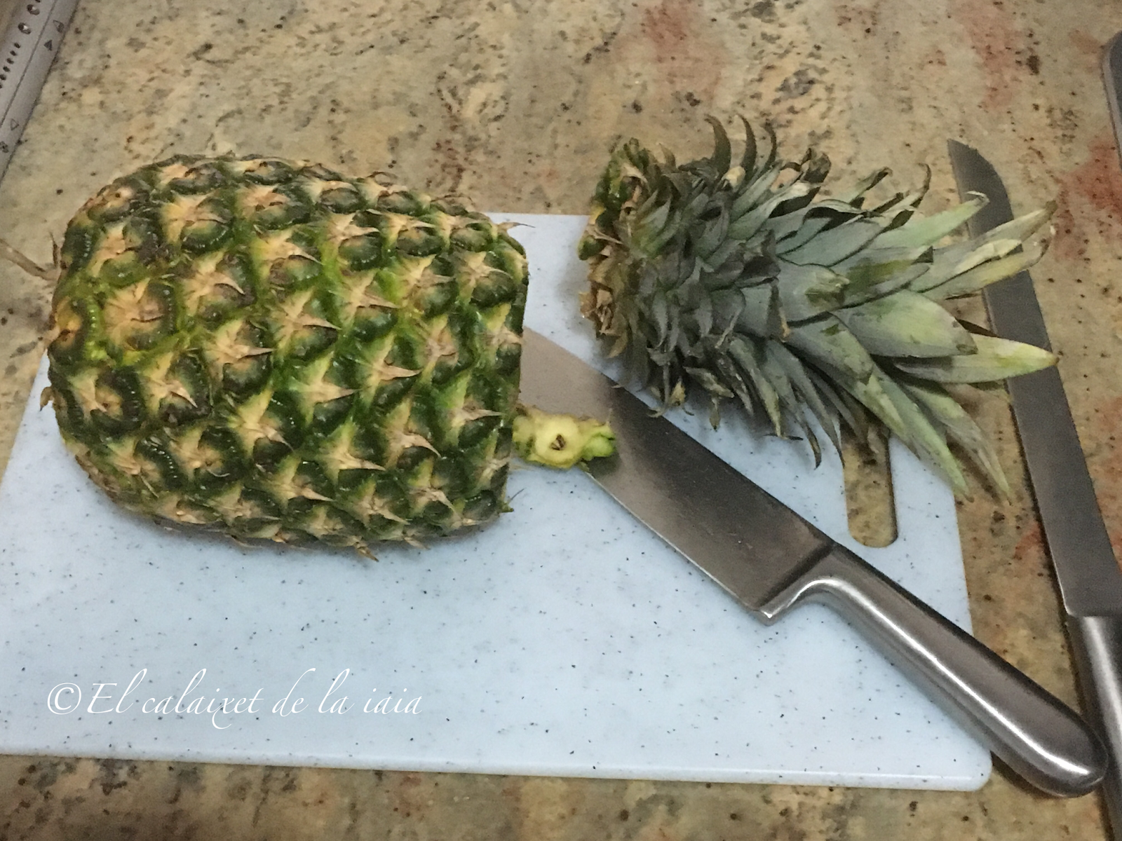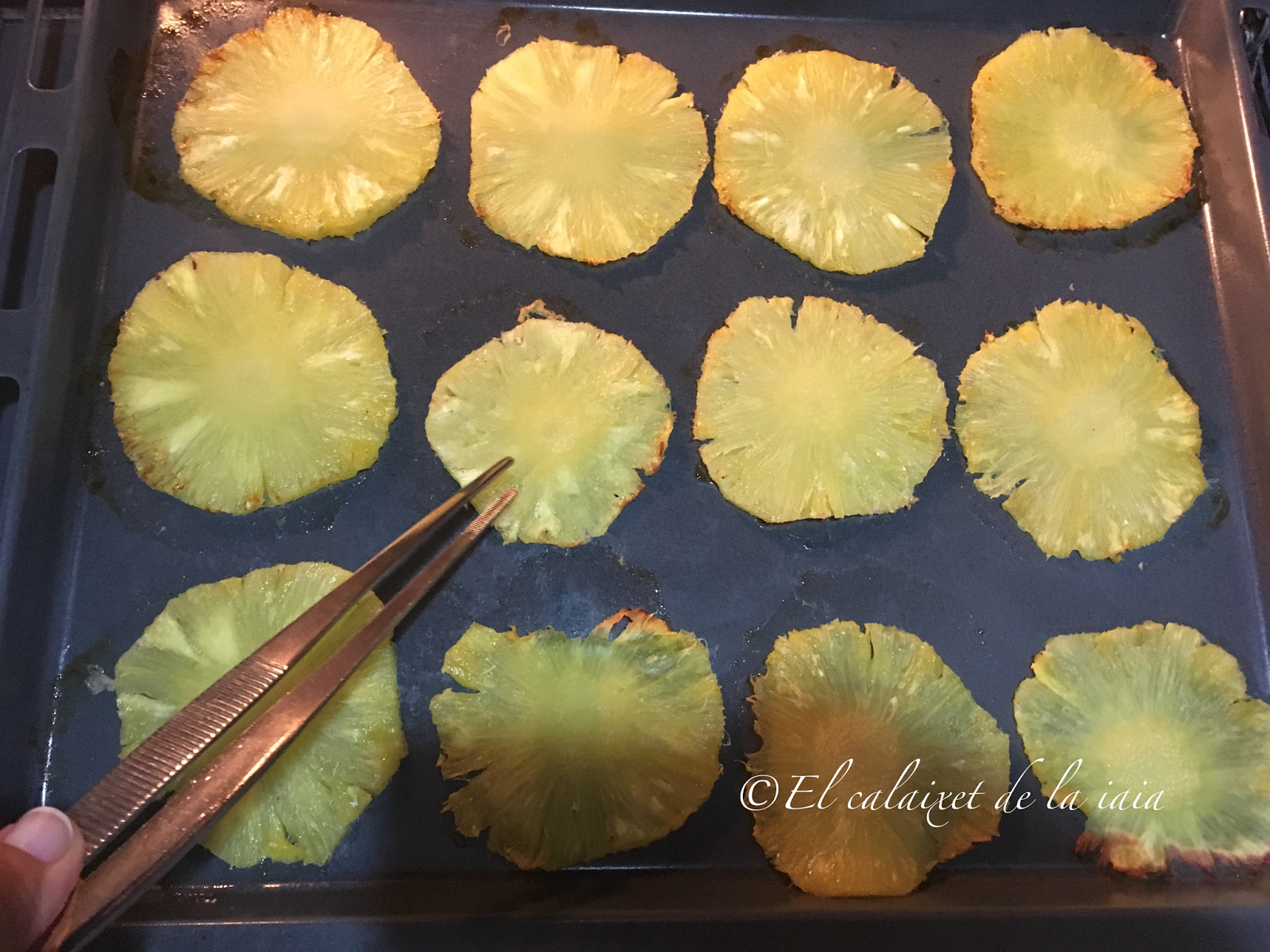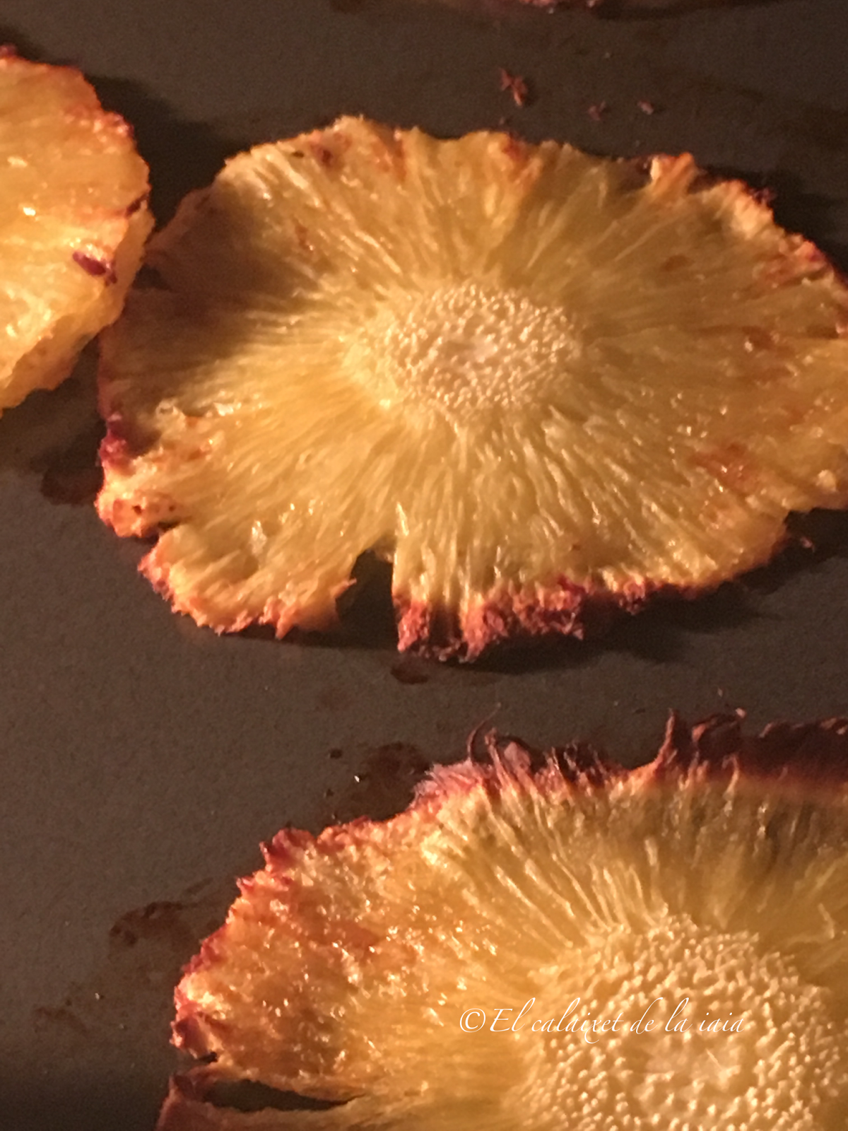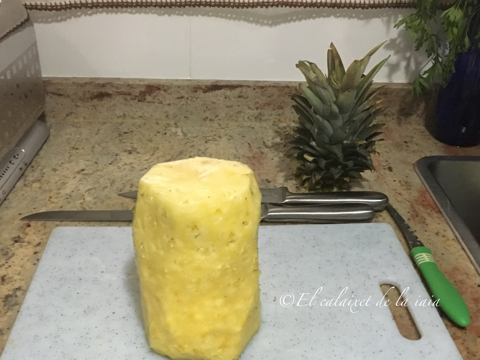 la piña dejándola totalmente limpia y cortaremos en rodajas lo mas finas posible. Si tenemos una mandolina es lo ideal, pero si no, podremos hacerlo con un cuchillo extremando las precauciones