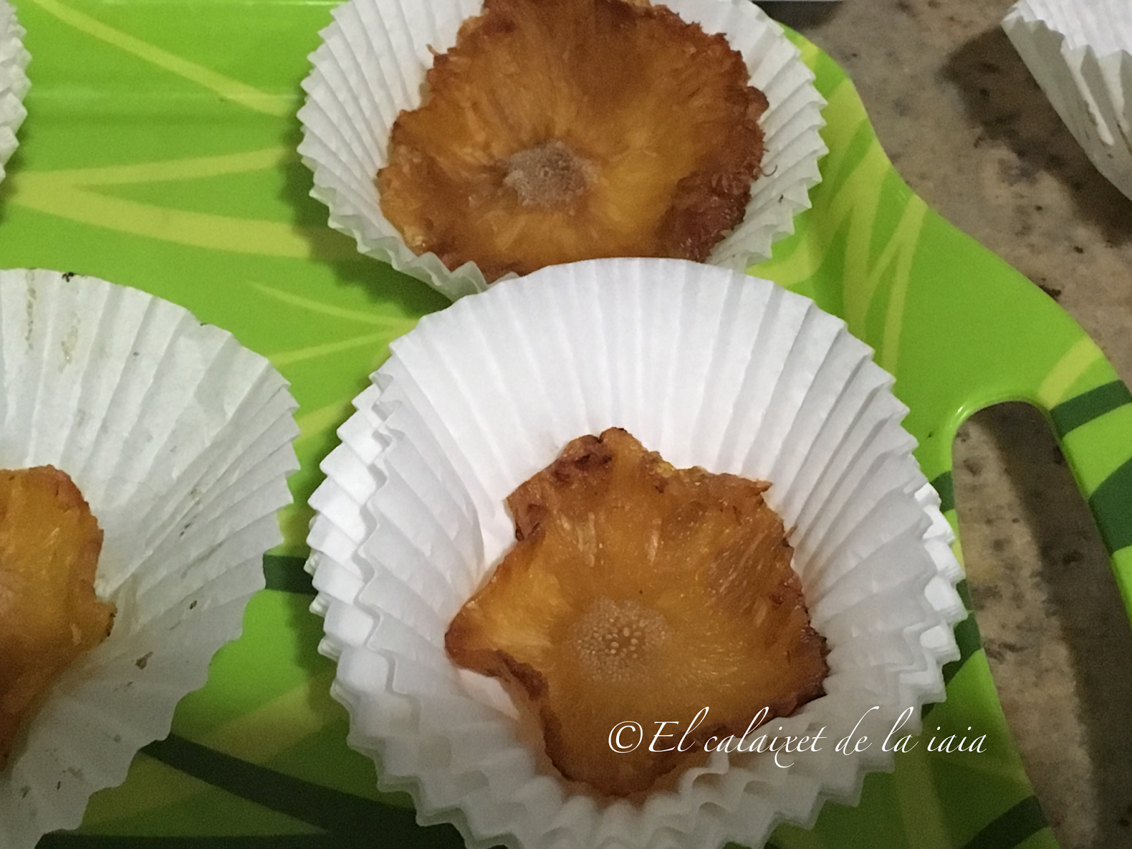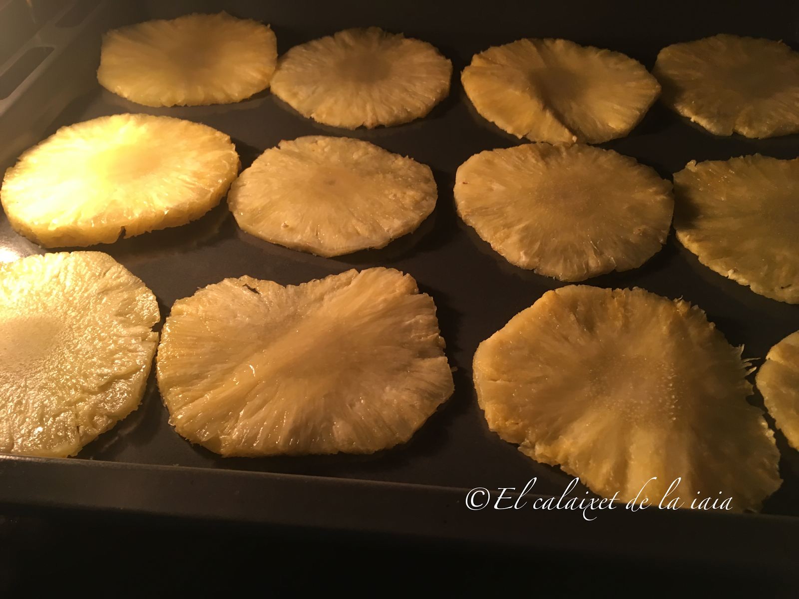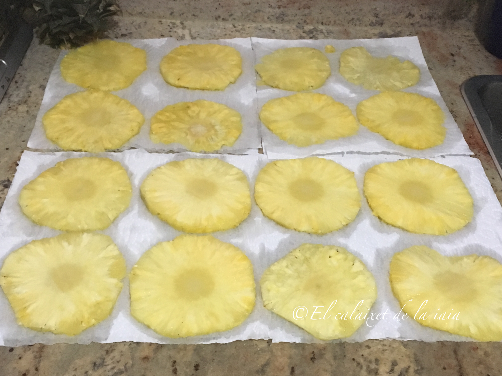 Iremos colocando las rodajas de piña sobre papel de cocina absorbente con el fin de que quede en ellas el mínimo jugo de piña posible