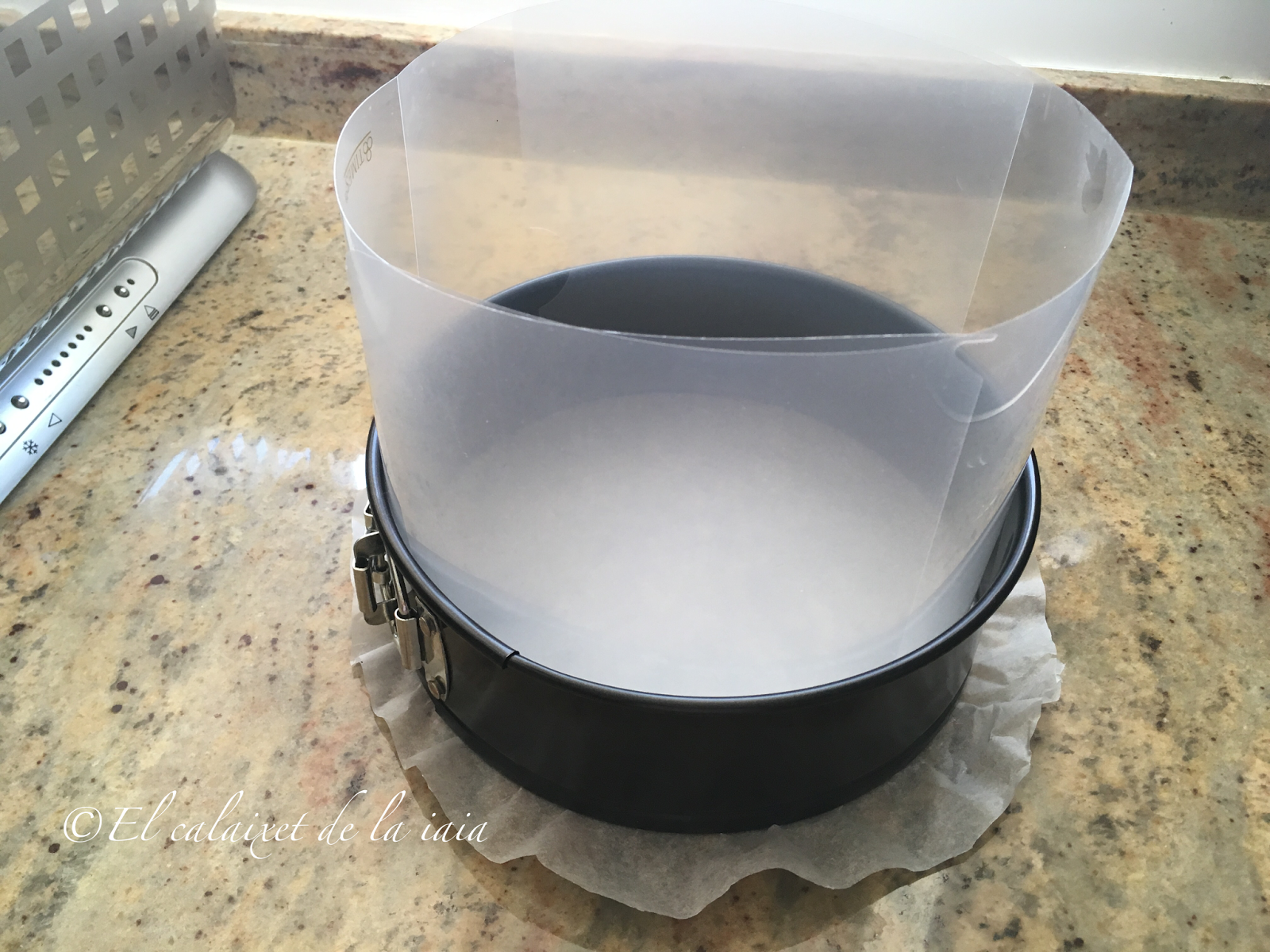 Cuando vayamos a proceder a preparar el resto de la tarta, pondremos unas hoja de papel sulfurizado sobre la base de un molde, pinzaremos, y colocaremos alrededor unas láminas de acetato, ésto es opcional, yo suelo hacerlo para un mejor acabado y por si la mezcla sobresale del molde