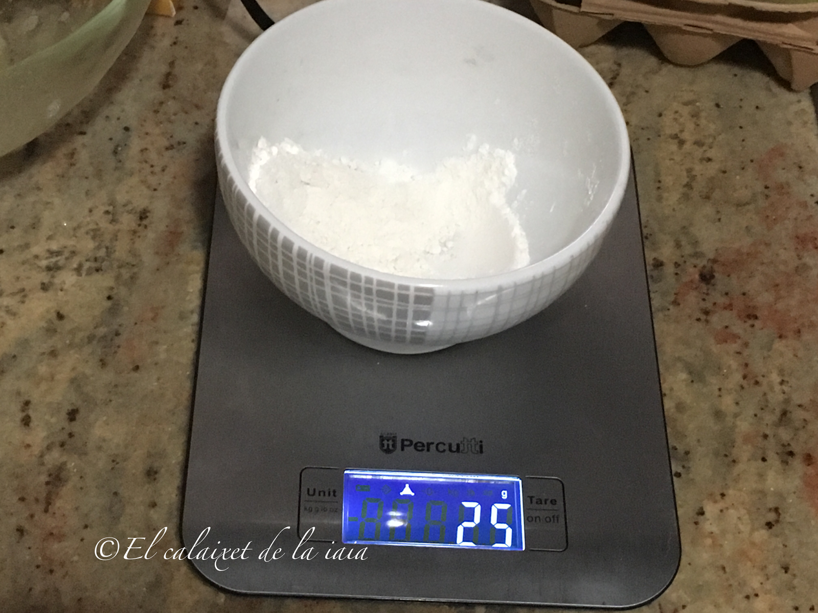 Añadiremos 25g de harina (yo suelo utilizar para casi todo harina de fuerza) tamizándola sobre el bol