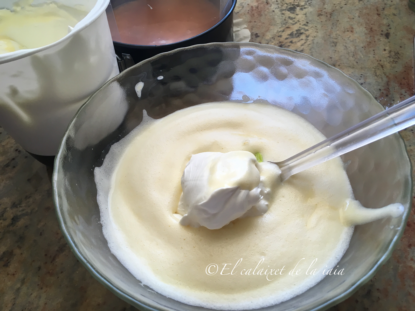 y ha llegado el momento de poner en marcha todo nuestro cariño y paciencia. Con movimientos envolventes de arriba hacia abajo iremos mezclando con mucha suavidad la nata montada con la crema inglesa con el fin de que baje lo mínimo