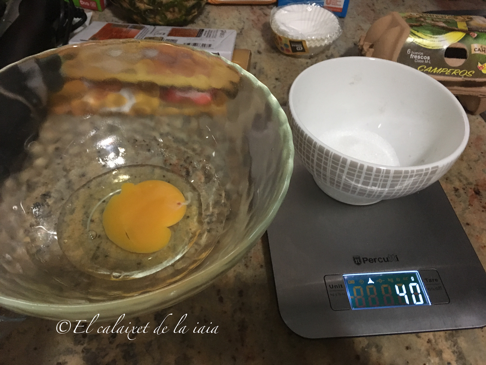Blanquearemos un huevo con 40g de azúcar blanquilla, batiendo hasta doblar el volumen