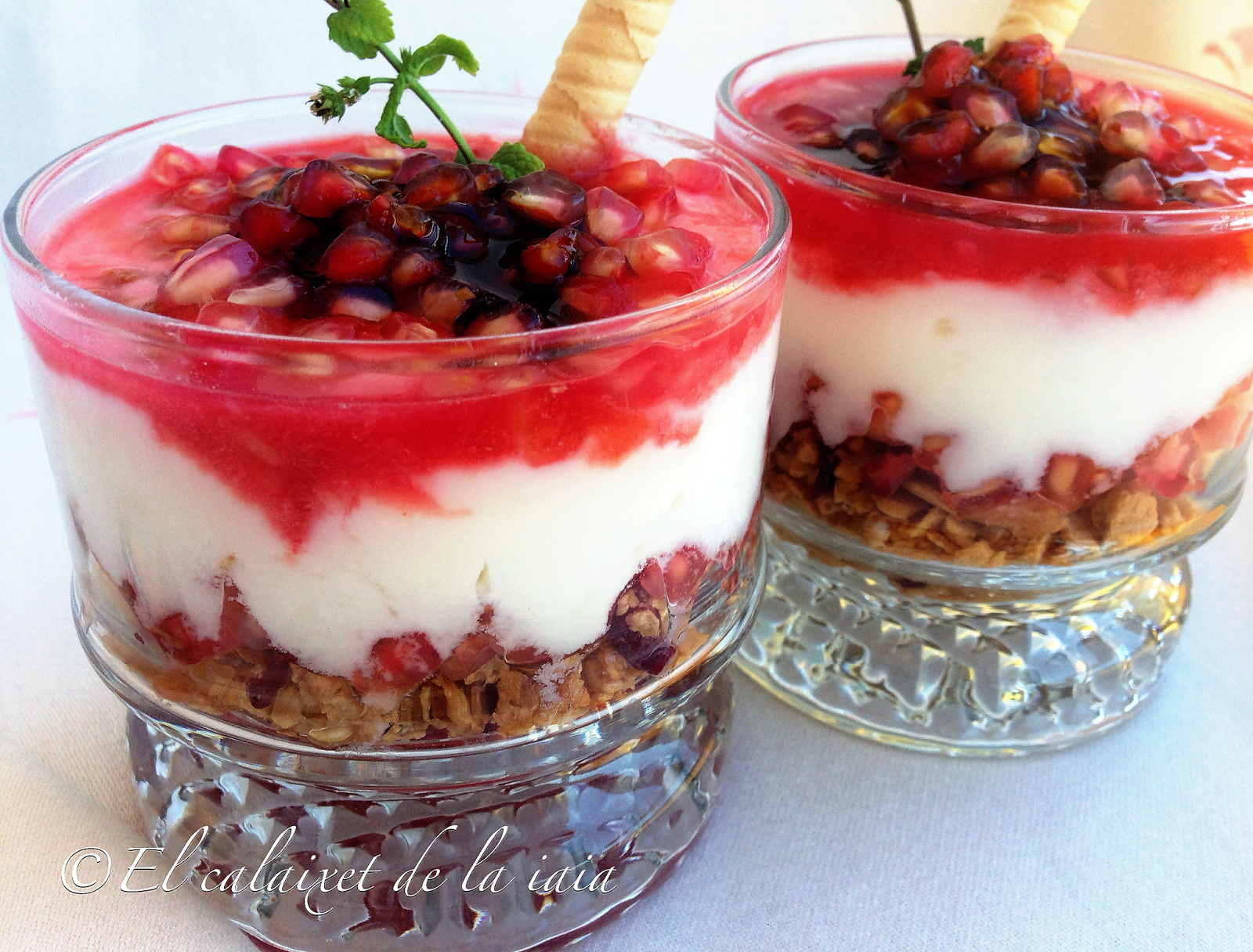 Como he preparado para comer unas «Migas con granada» y me había sobrado unos granos con zumo, he mirado en la nevera y tenía yogur, unas barritas de muesli en la despensa….pues ya está, un buenísimo postre en vaso. Esta es una muestra de que se puede hacer un postre, en plan rápido, cuando no disponemos de tiempo, así que ya sabéis que no hay excusa 😉