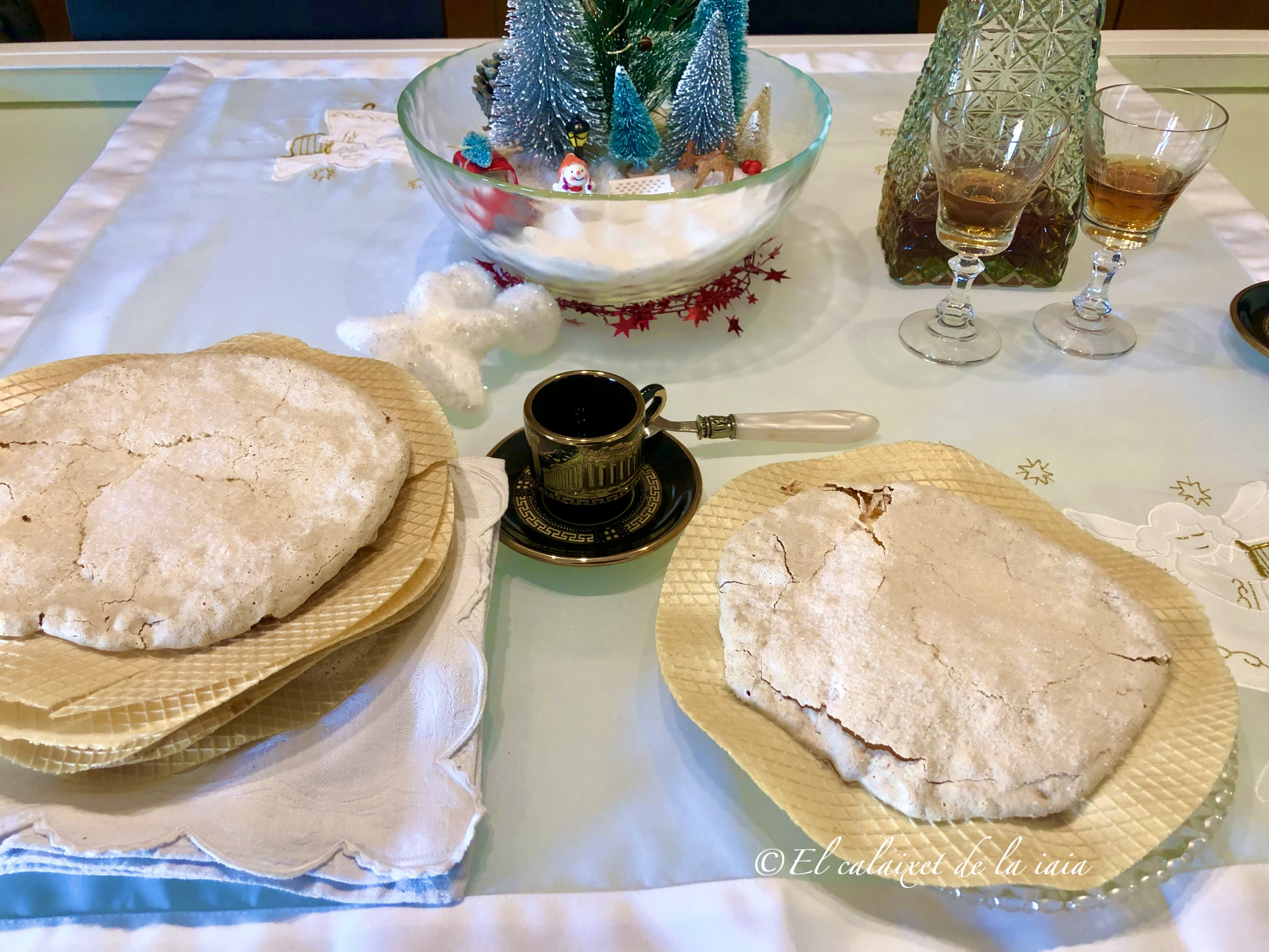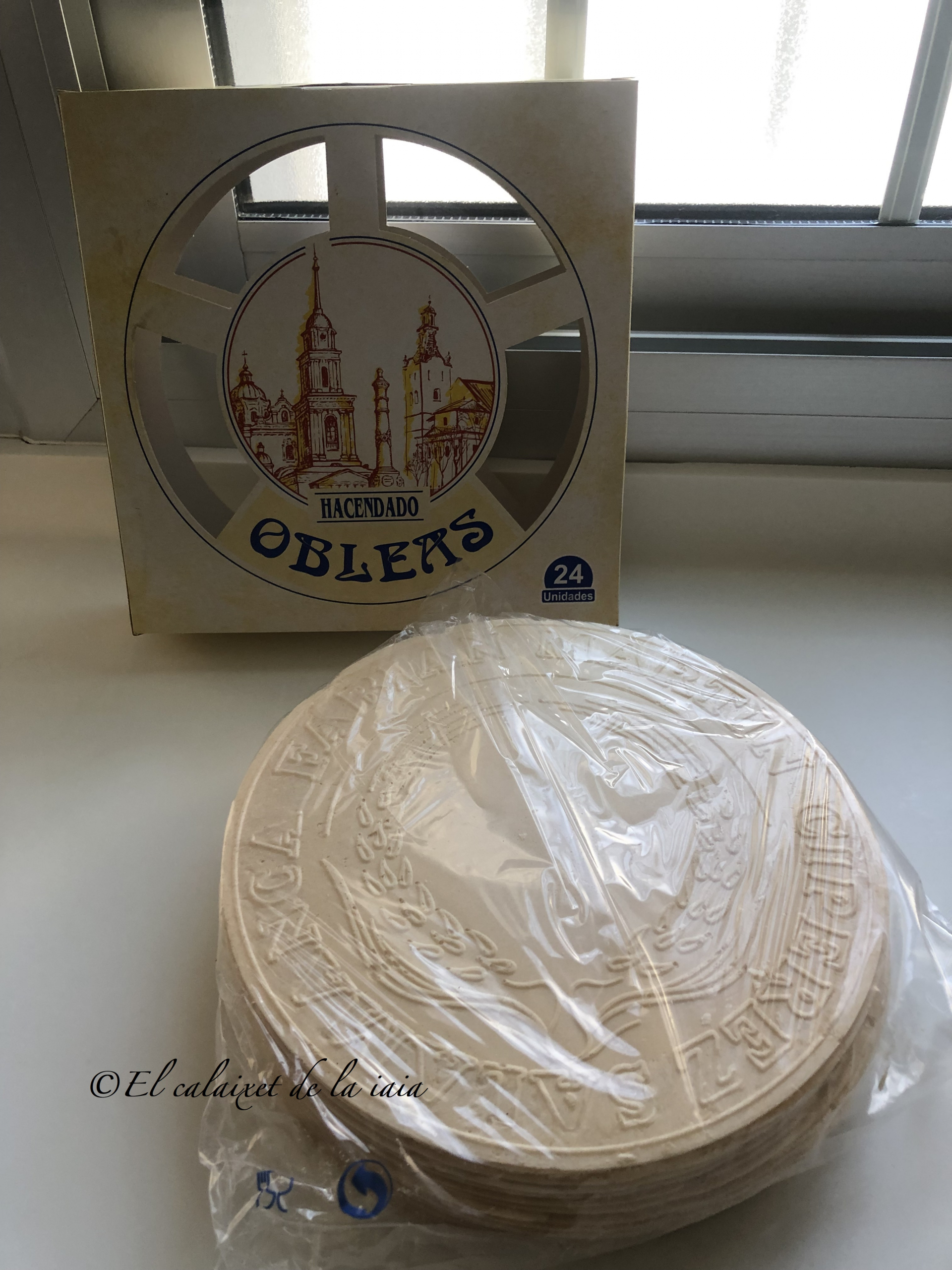 Pues nada, ha sido un desastre, porque se han astillado y roto. Para comerlas nosotros, valdrían, aunque hasta el sabor, es distinto pero, al ser para publicarlas, no me gustaban, además de que no son las que uso habitualmente, aunque es tontería porque todas las obleas, se rompen y astillan, cuando las metes, o sacas del horno, pero en fin, que me he ido dando un paseo al mercado, y allí he comprado las que me gustan, que son estas, miden 2 cm menos que las otras, (y si apuras, te pueden caber tres a la vez en el horno, un horneado menos, y un pelín de ahorro), son las que uso para hacer el «torró de cacau»(bueno, usaba, porque este turrón, lo hacía expresamente para mi papi) «panquemaos» etc.