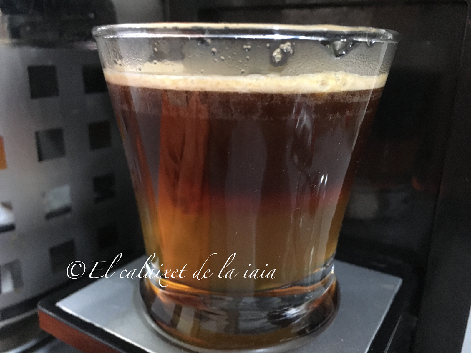 bajo ha de quedar el licor, luego la capa del café y por último la crema del mismo, que claro está en casa, no quedará con la misma cremosidad del que pueda conseguir una máquina de café profesional 🙁 pero lo haremos lo mas similar