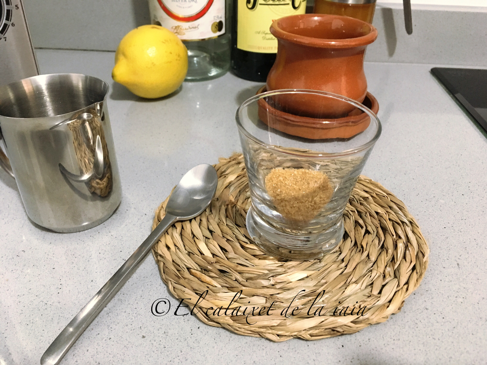 colocamos en un vaso el azúcar, en éste caso es azúcar moreno pero puede ser azúcar blanquilla o miel