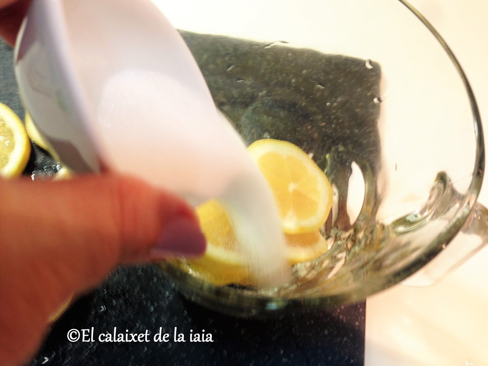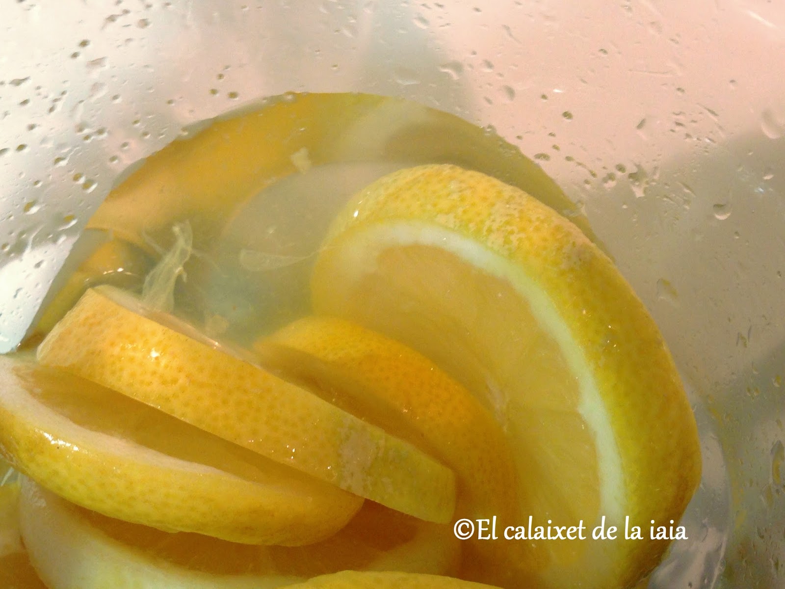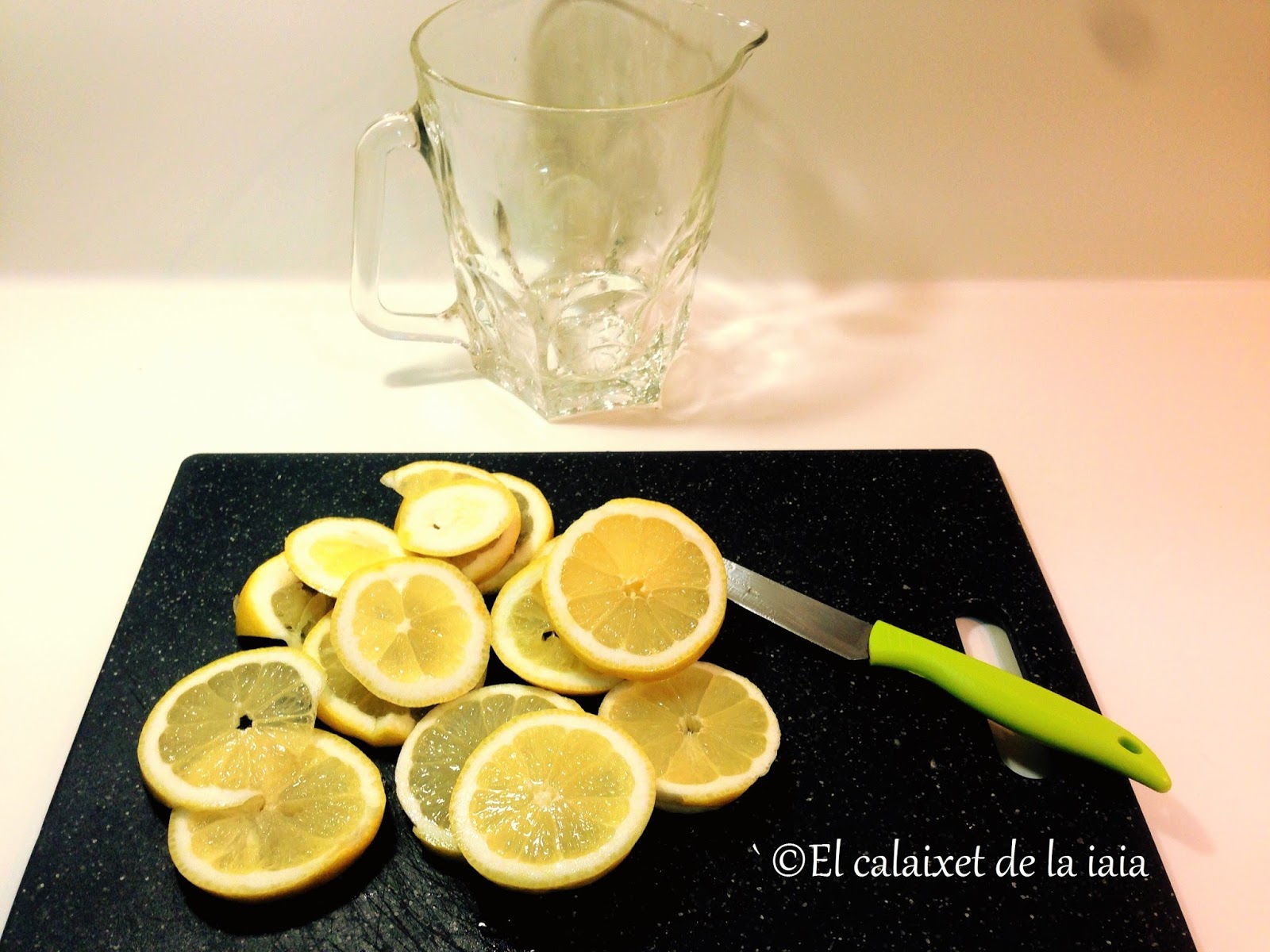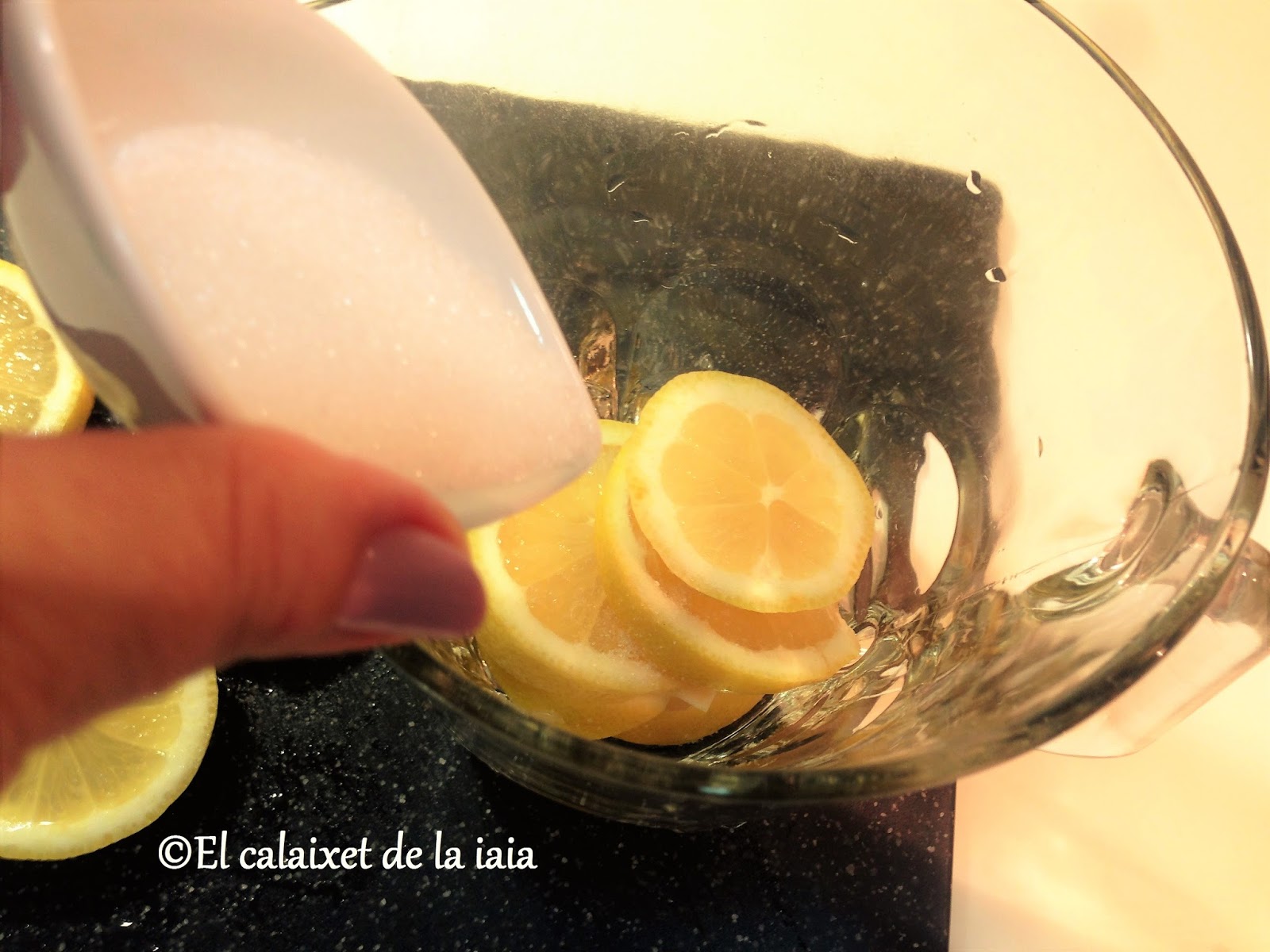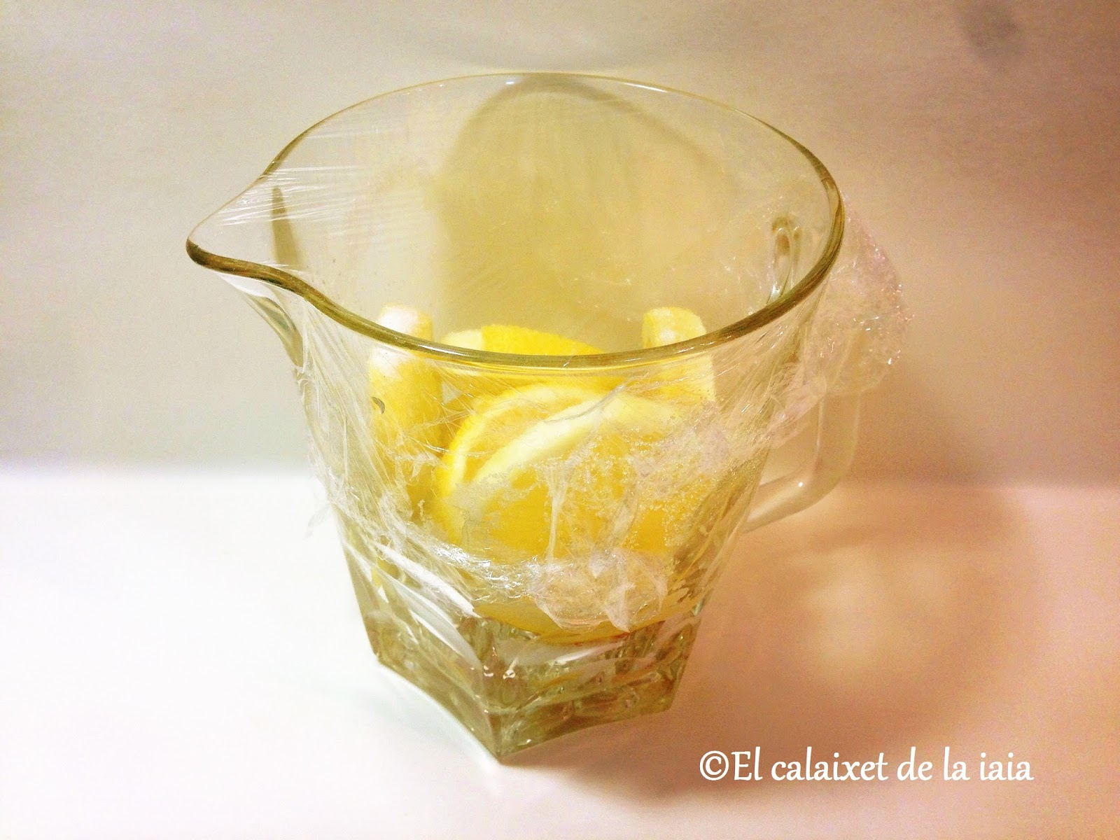 Al día siguiente al retirar el papel film, veremos como el azúcar se ha convertido en un jarabe al sacar el jugo del limón. Removeremos e iremos añadiendo un litro de agua muy muy fría,si es posible mineral, para que no deje sabor a cloro.