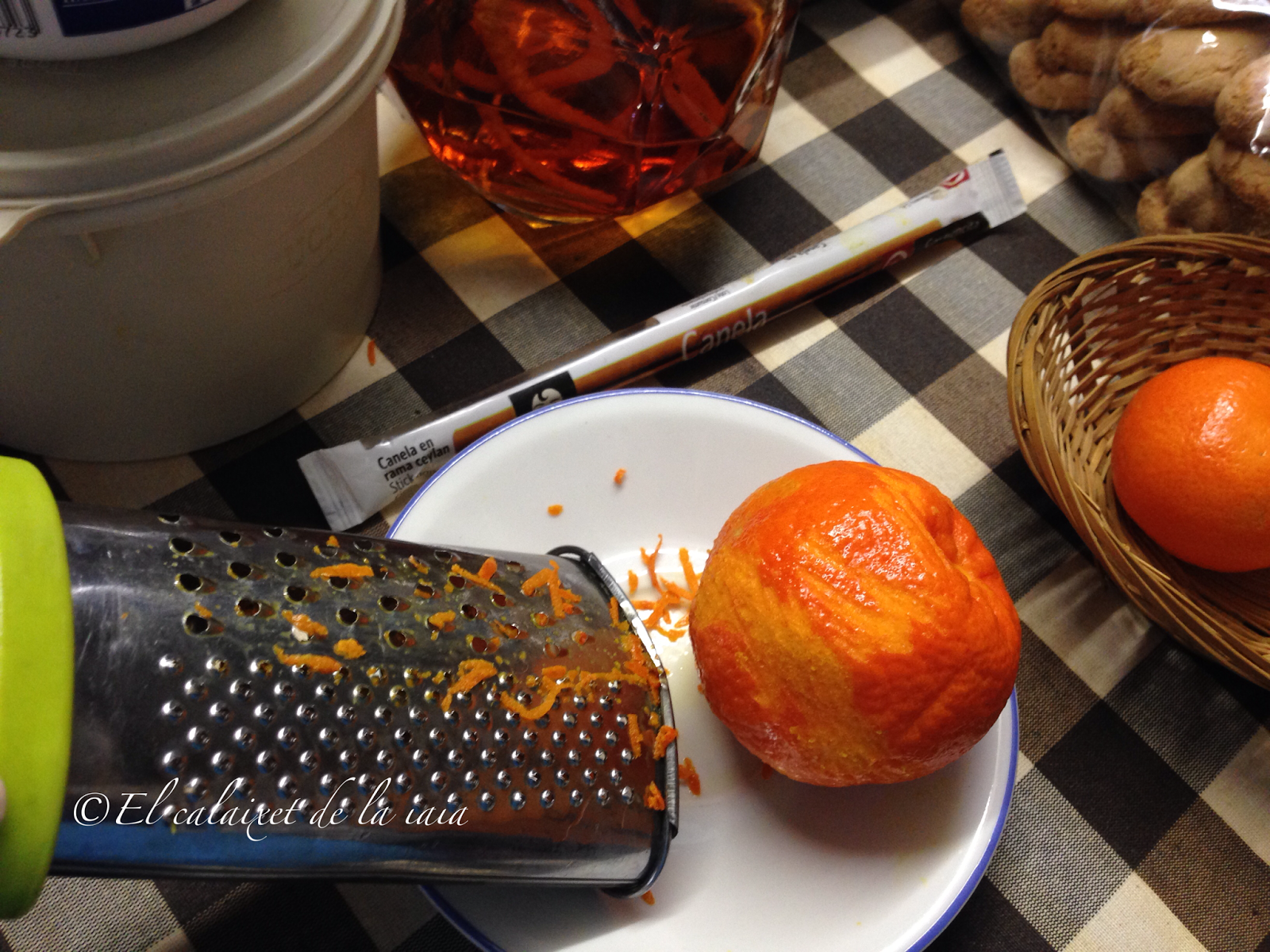 Lavaremos bien una mandarina grande y sacaremos toda la ralladura (flavedo, donde se encuentran todos los aromas y aceites esenciales de los cítricos) de una mandarina grande, evitando la parte blanca (albedo) porque amarga