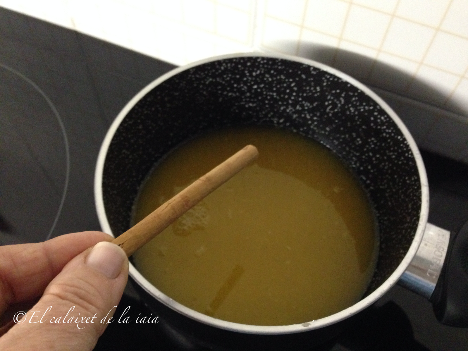 En un cazo al fuego, pondremos la naranja, con el palito de canela