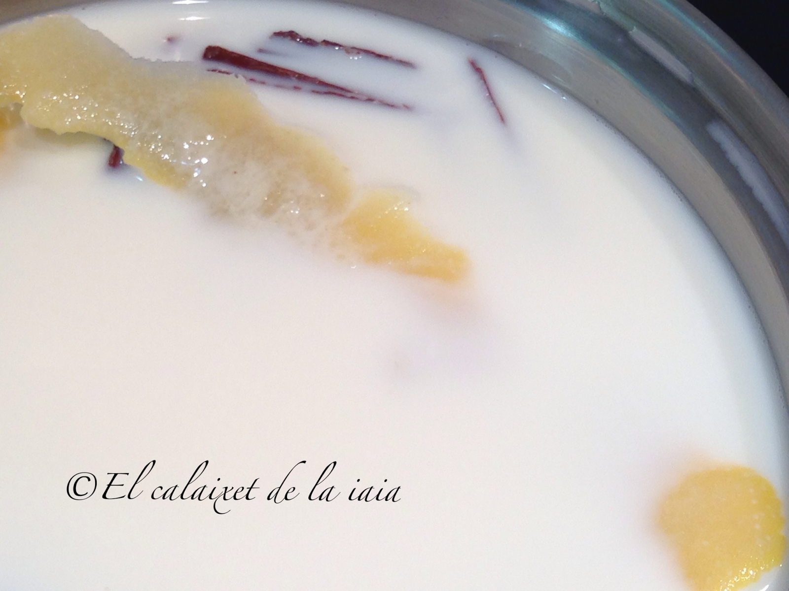Ponemos la leche a hervir con la rama de canela partida por la mitad, el azúcar o endulzante y la piel de medio limón. Cuando suba la ebullición apagamos el fuego y dejamos infusionar