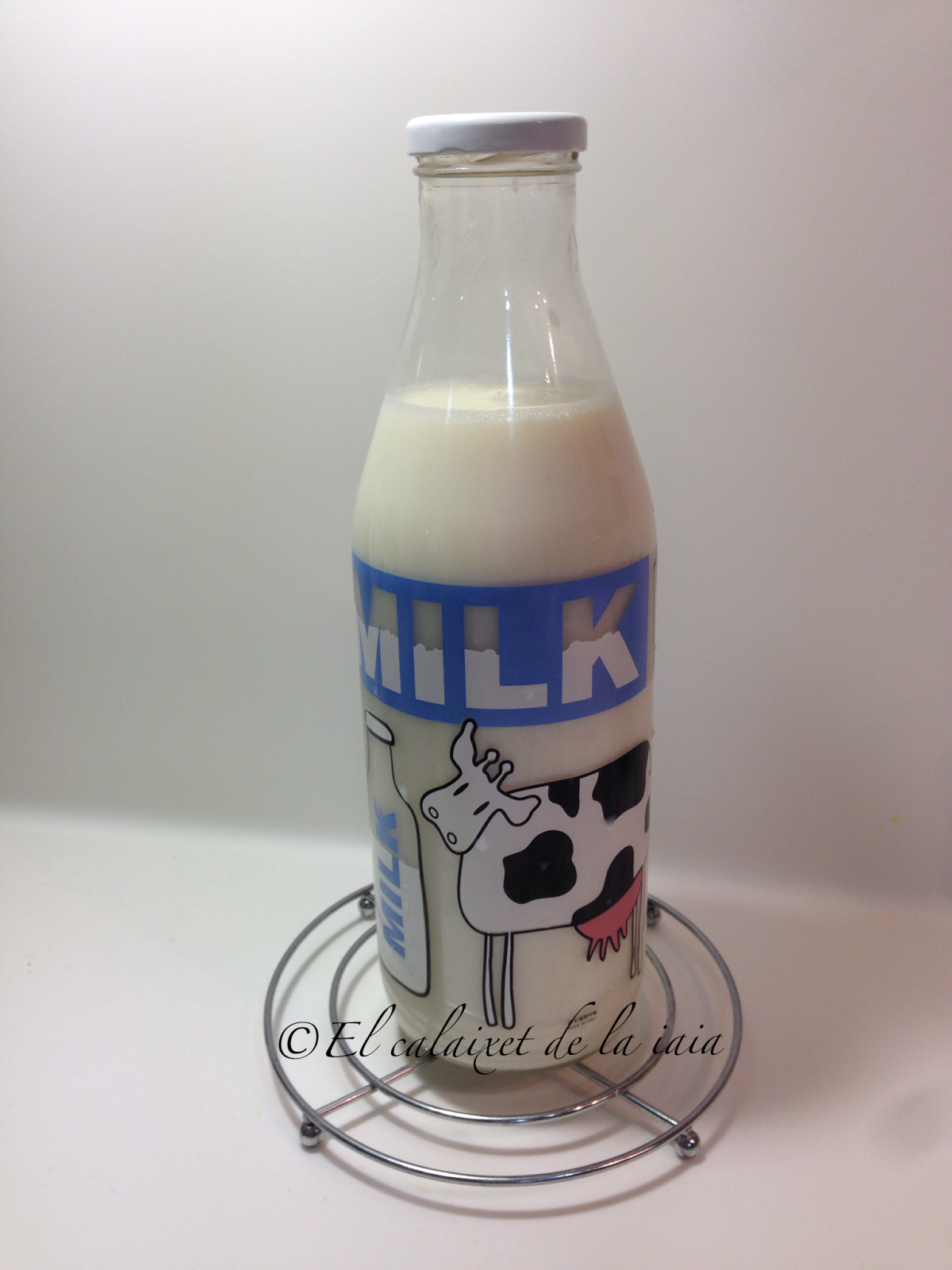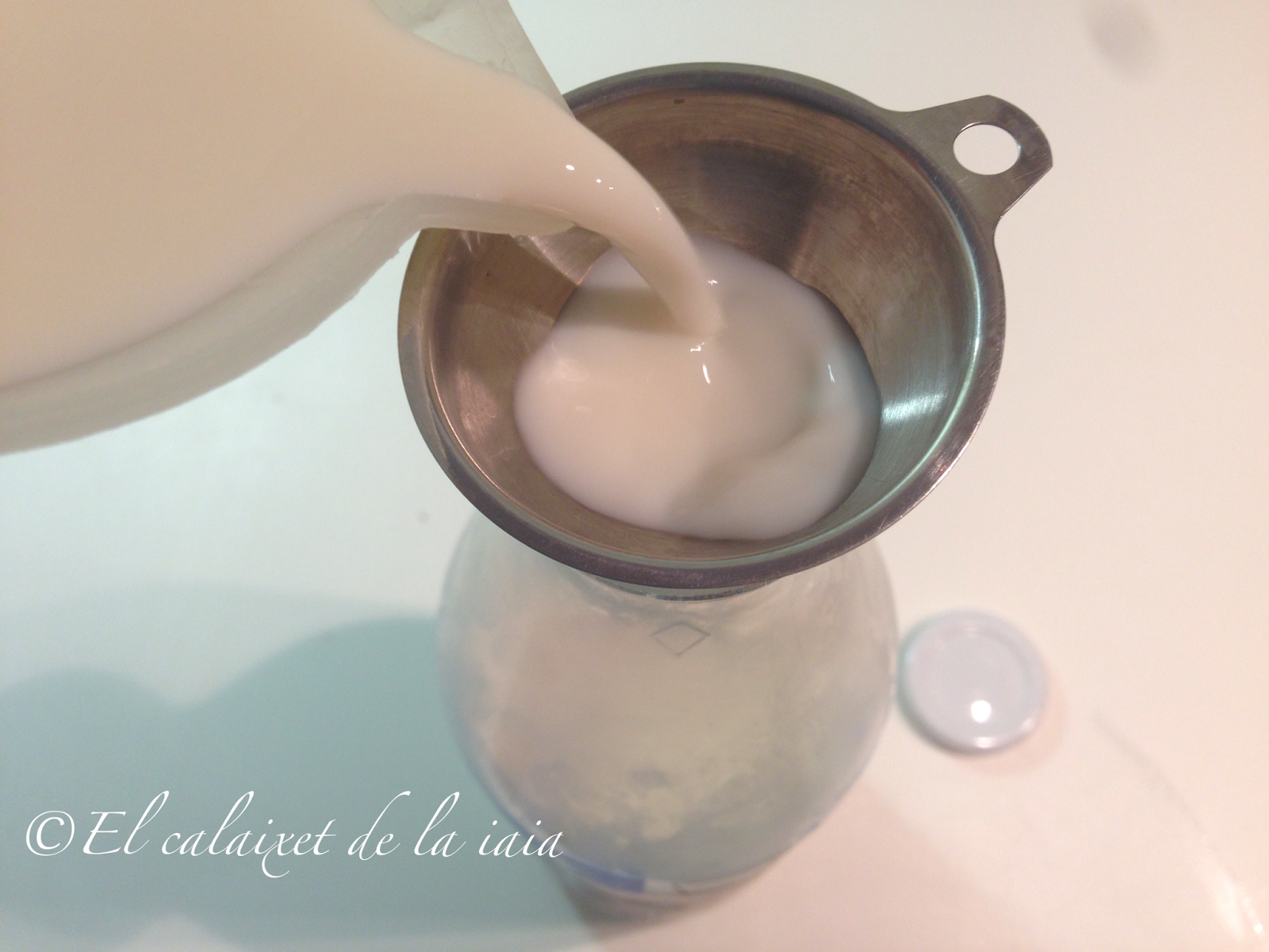 Colamos la leche y la dejamos en una botella o recipiente de cristal que itrá al frigo