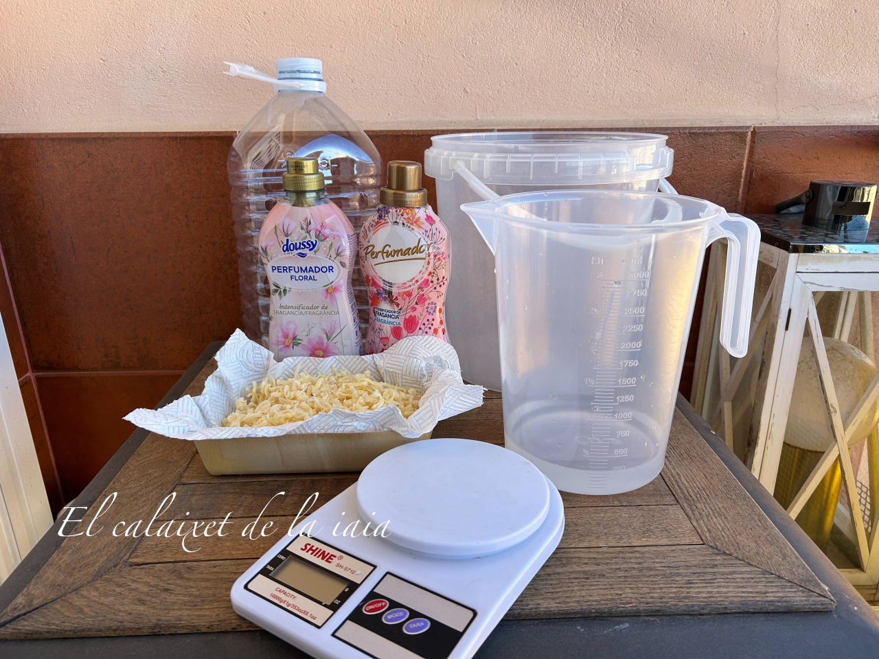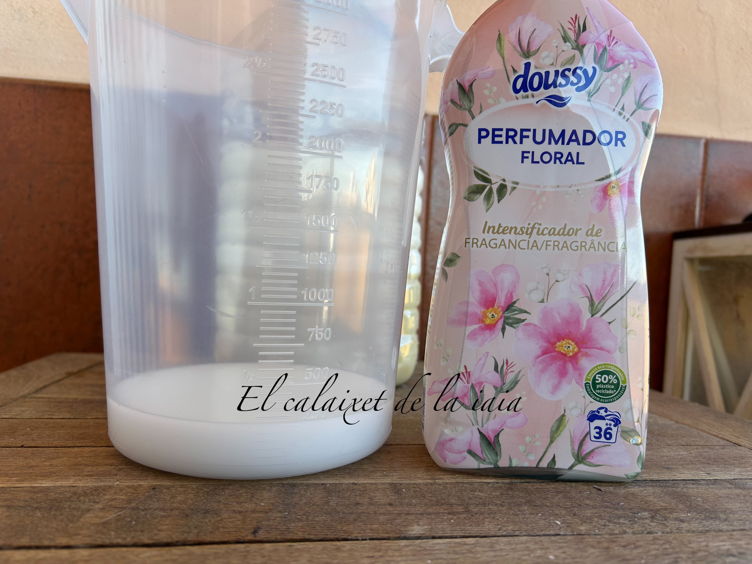 y 250ml de perfumador, yo no uso suavizante hace muchísimos años, desde que el dermatólogo de mi marido, tras la primera biopsia y diagnosticar que tenía dermatitis dishidrótica y atopica, me dijo que no lo usara nunca, por aquel entonces el vinagre blanco de limpieza, no estaba comercializado (o yo, por lo menos, no lo conocía) y durante muchos años he usado el vinagre de vino blanco para suavizar la ropa, jamás me ha dejado olor en la misma, al igual que en el enjuague del cabello de mis hijos, en el época escolar y de scouts.
