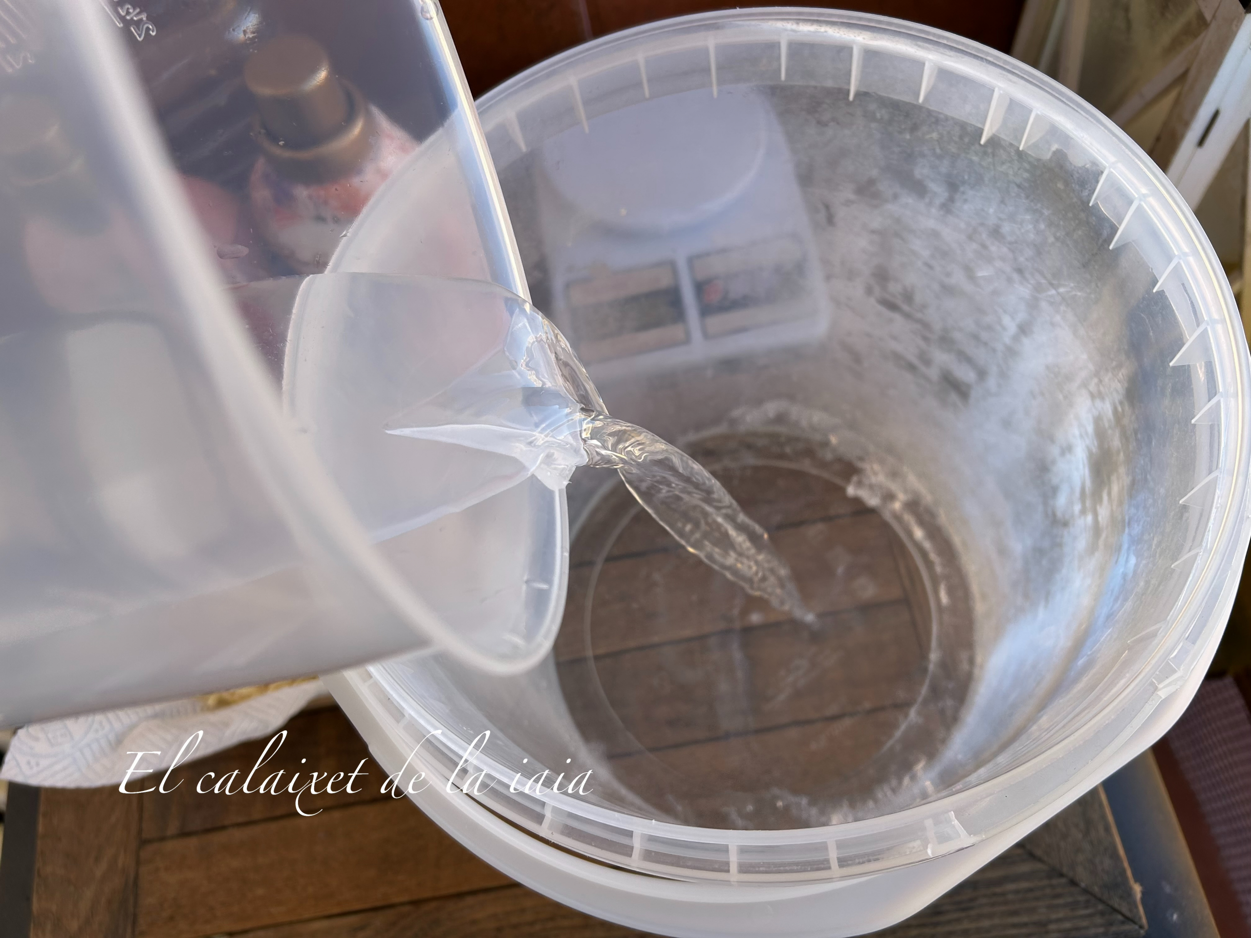 En un cubo, pondremos el doble de agua potable, que de jabón, en este caso, 1.200g
