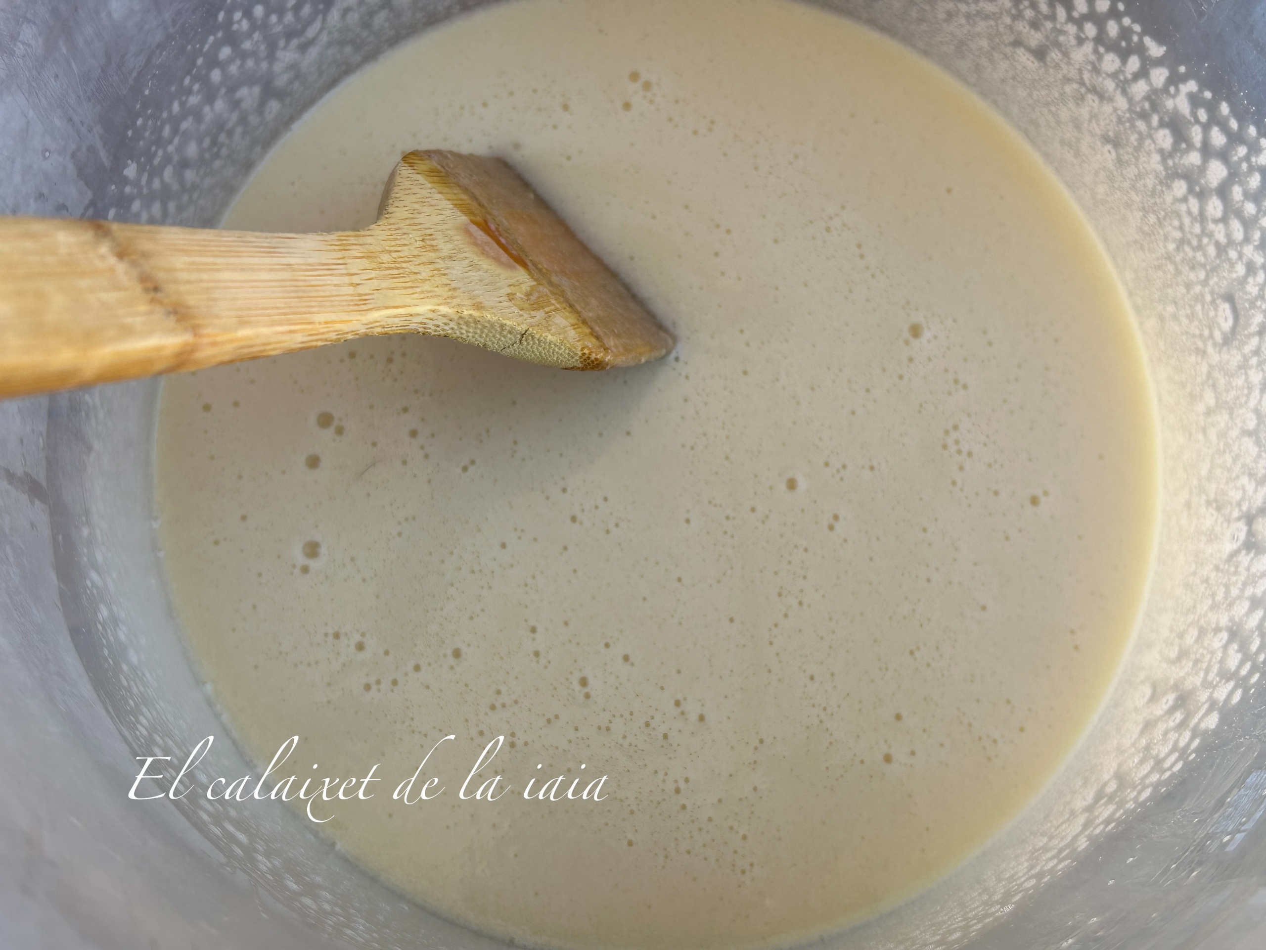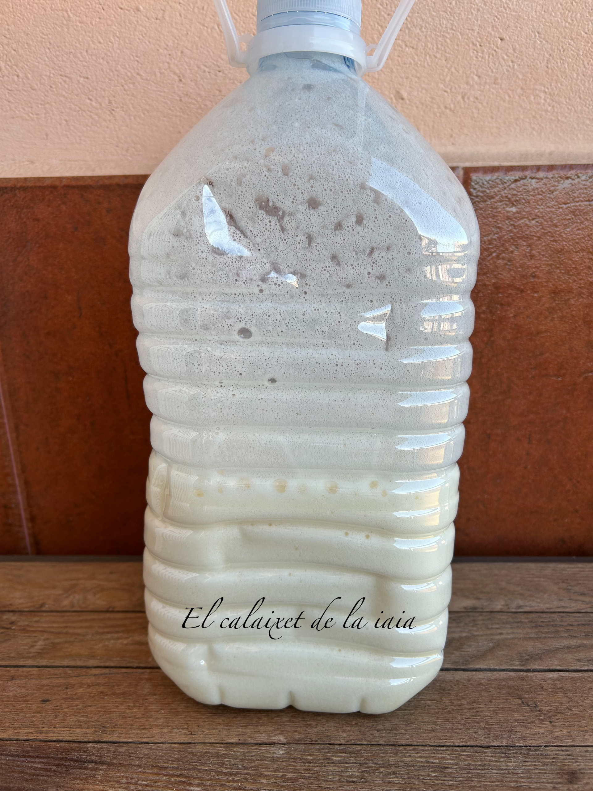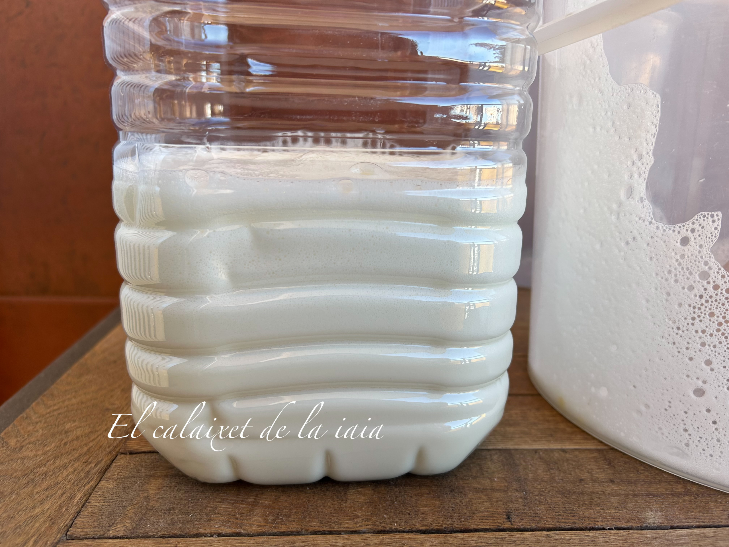 Al día siguiente, nos encontraremos con que el aspecto ha cambiado bastante, haciéndose tres capas, arriba espumosa y blanca, al medio, color café con leche y bajo del todo, mas aguada y color miel, tranquilos, ni se ha puesto malo, ni se ha cortado, unas veces ocurre esto, y otras no. No soy profesional de este tema y no puedo daros explicación del porqué a veces ocurre esto, debe influir la temperatura ambiente, pero no estoy segura. Yo lo bato de nuevo y sigo añadiendo agua.