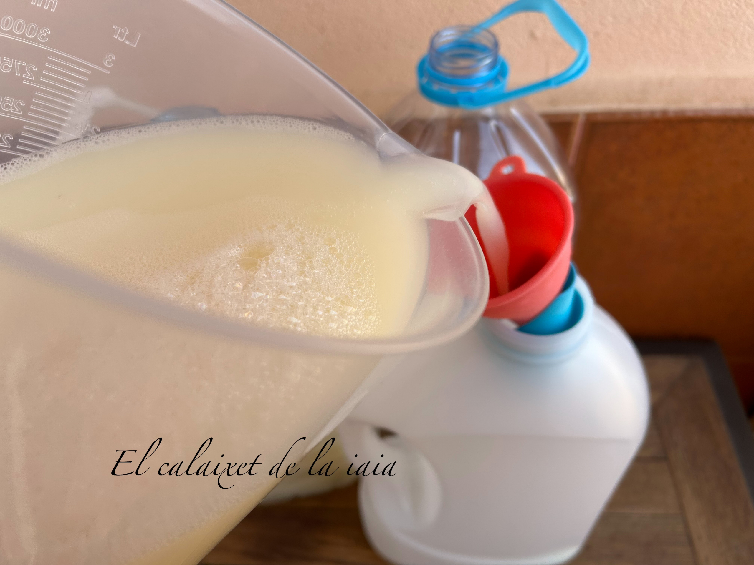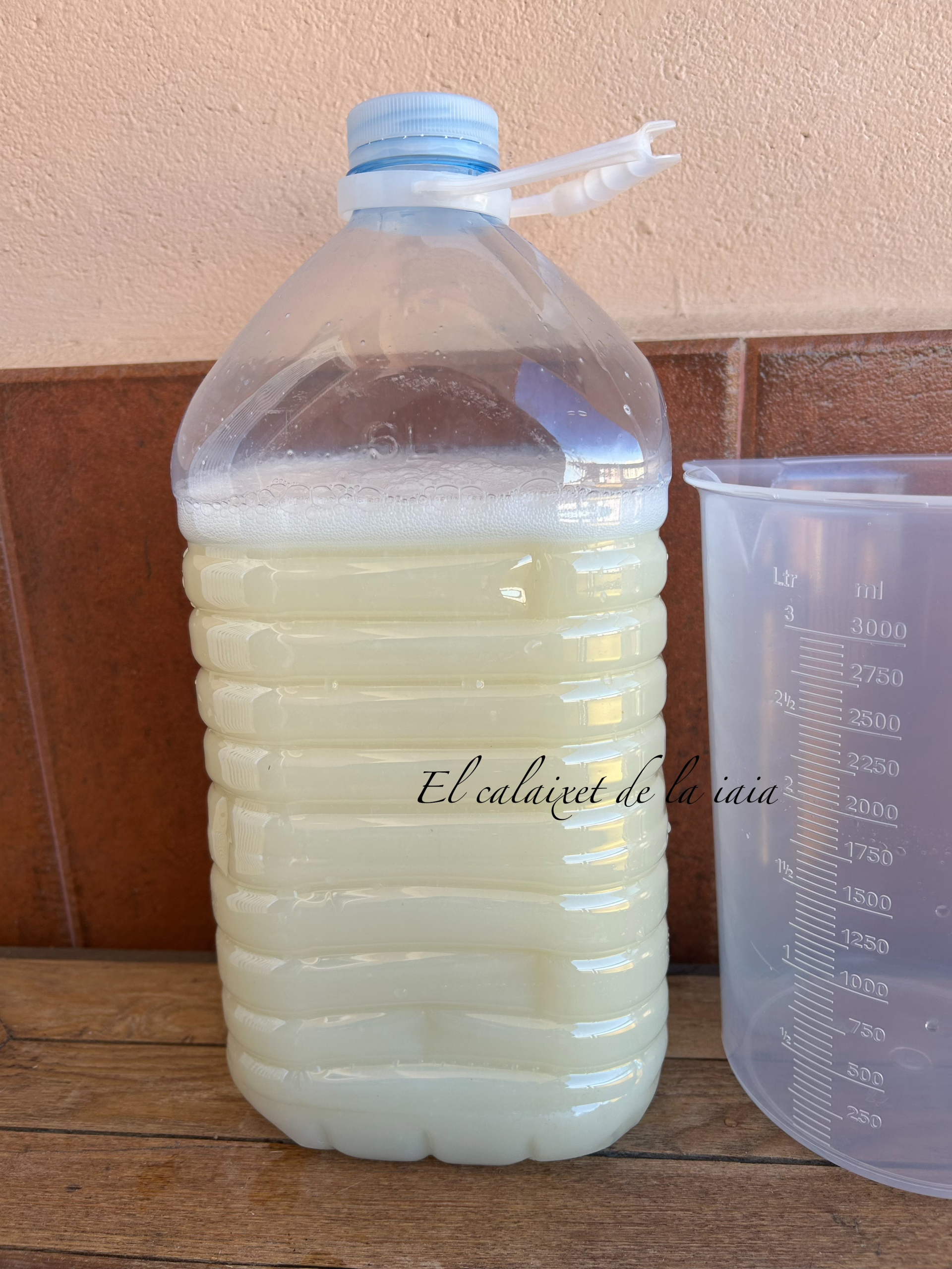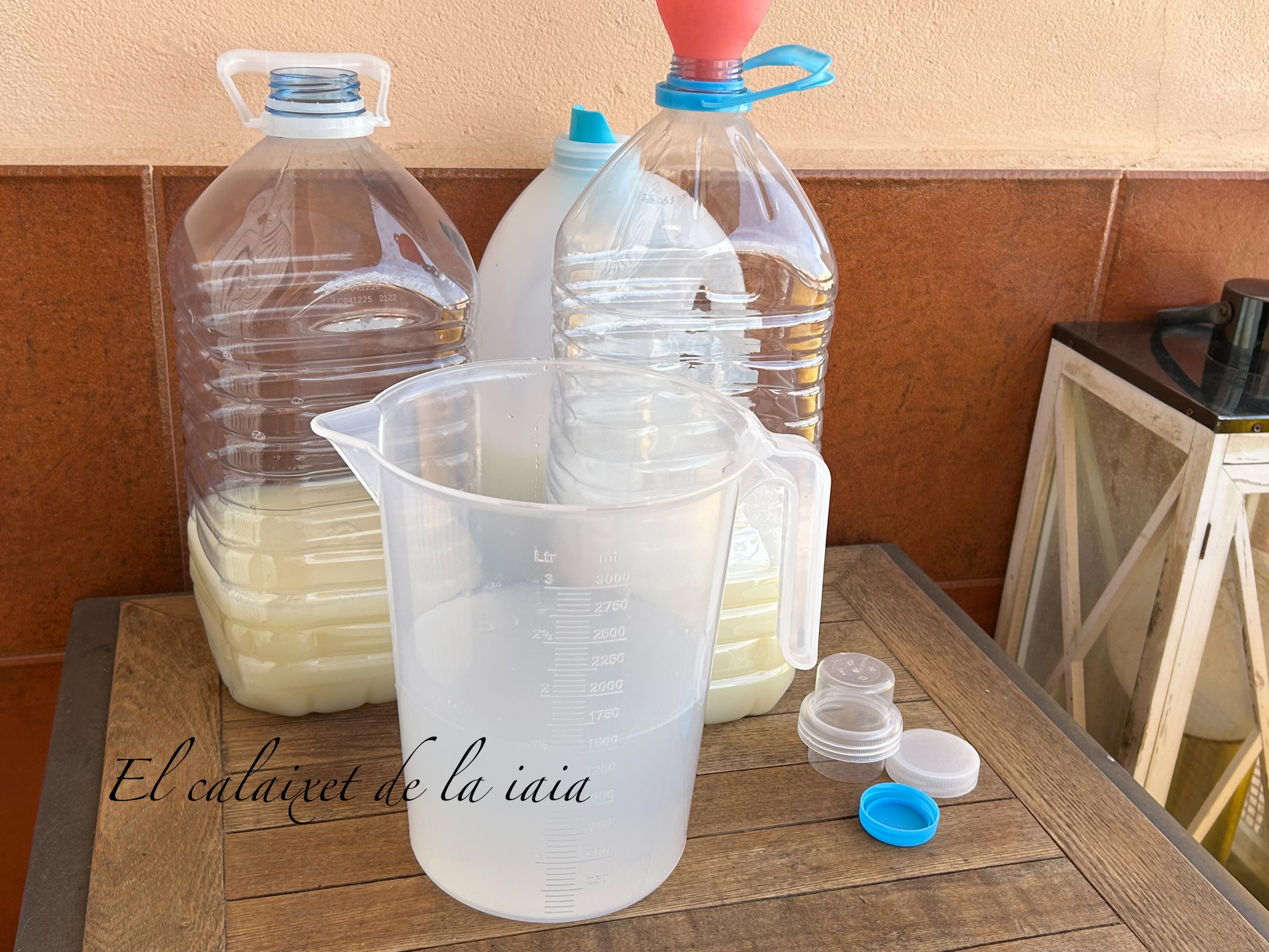 Al final, he conseguido 12 litros de jabón, con dos pastillas de 300 g en total, como veis es un ahorro muy considerable, y de apenas trabajo, eso si, varios días de reposo, remover de vez en cuando y añadir agua, si vemos que necesita, nada más.