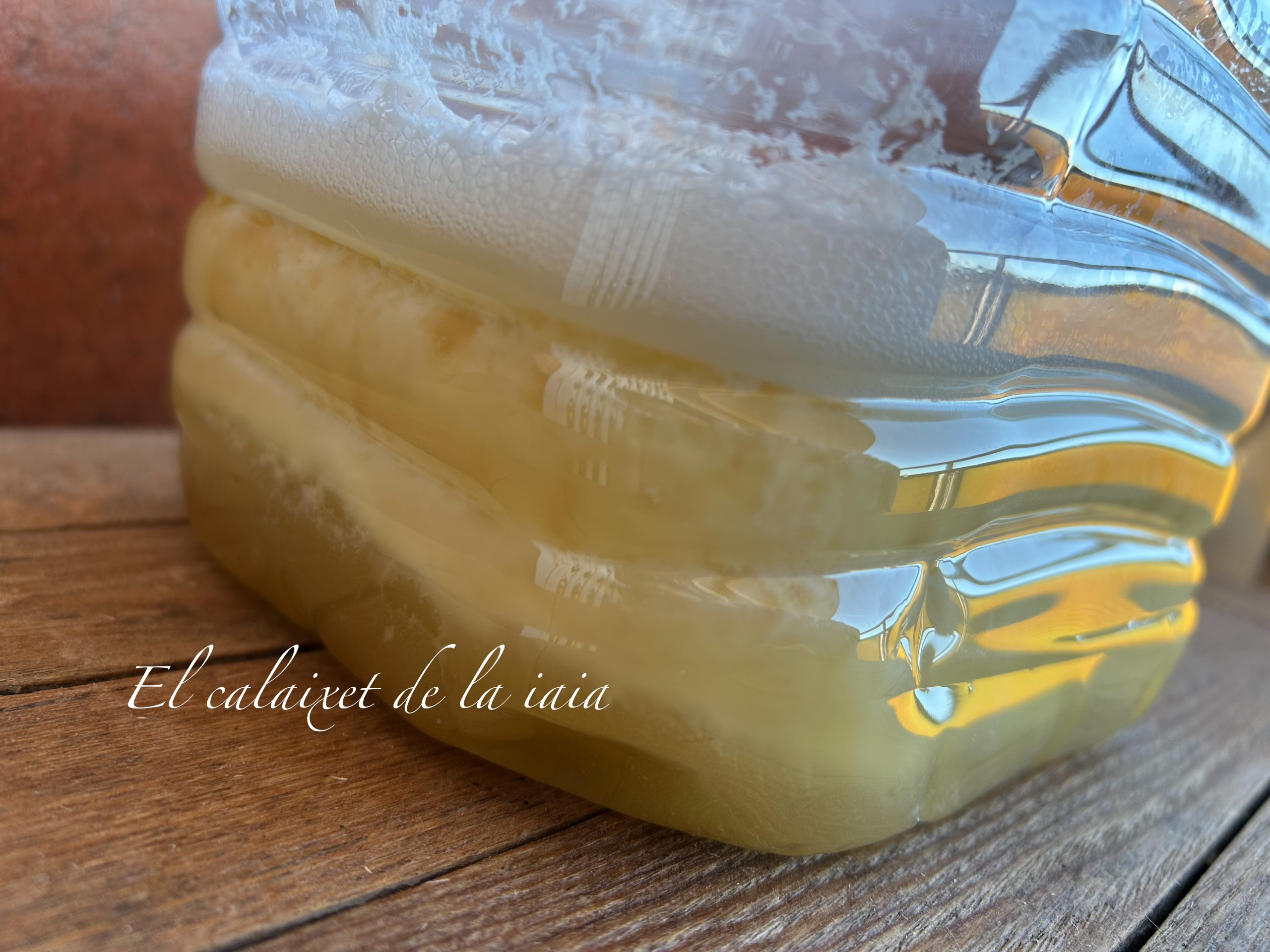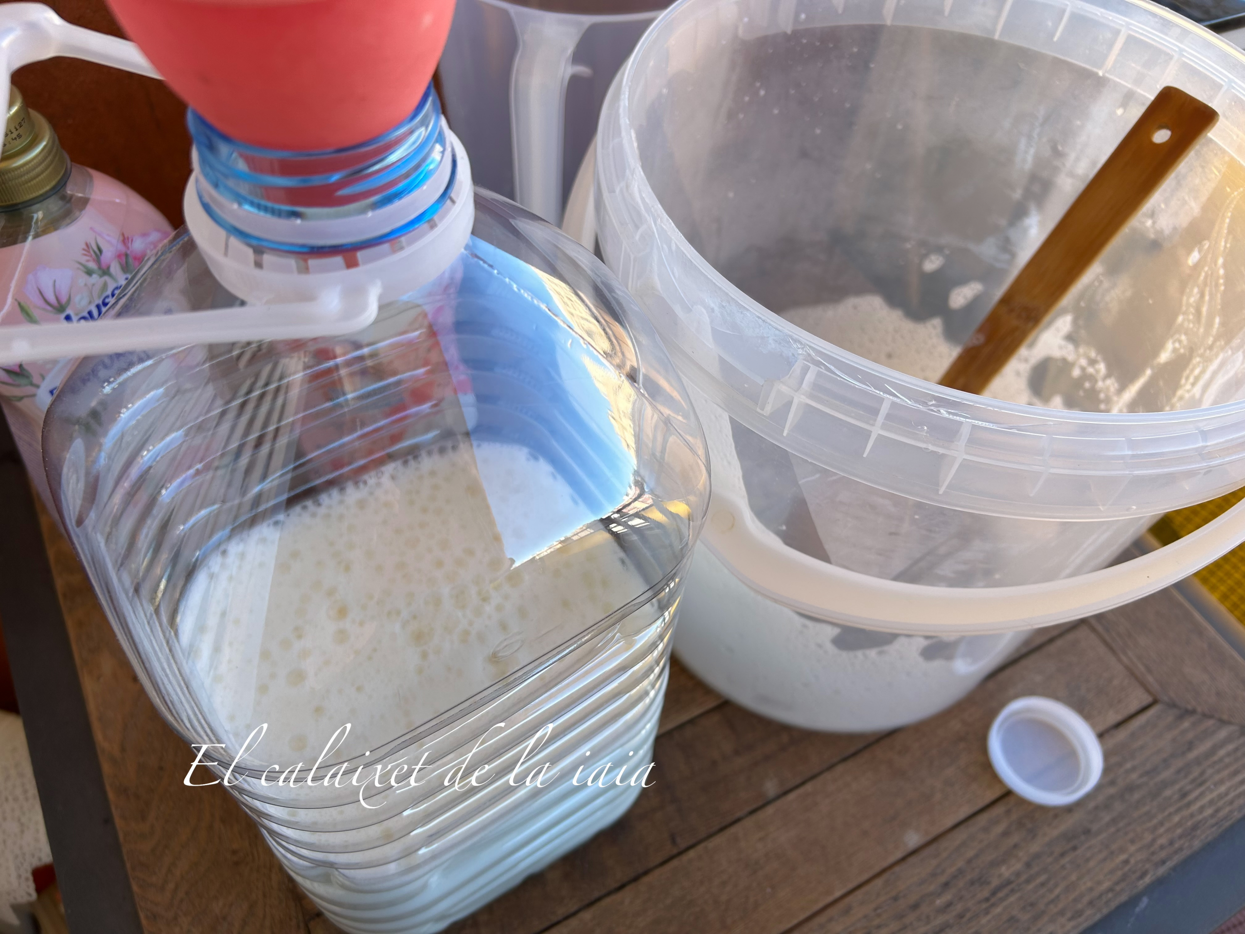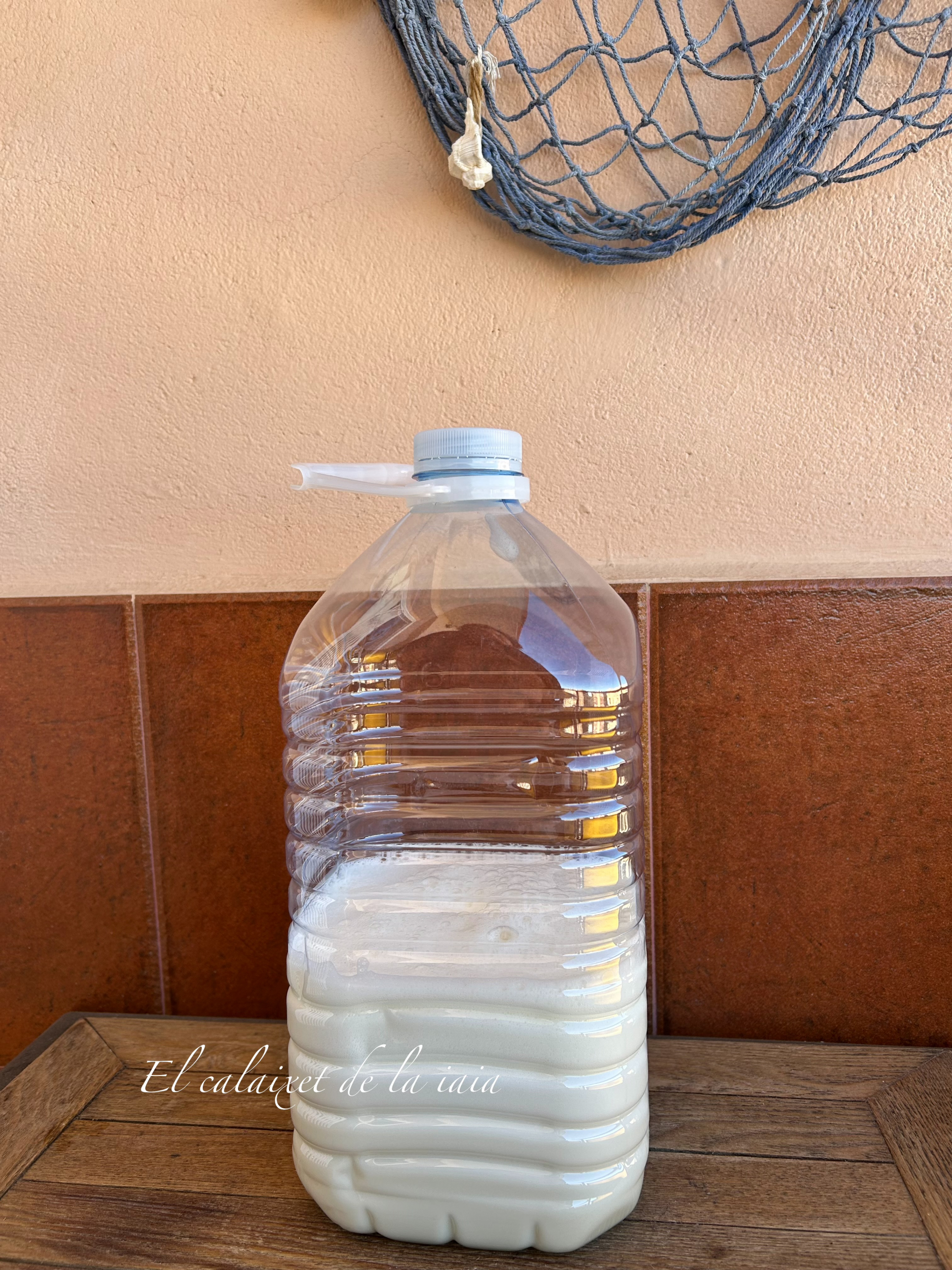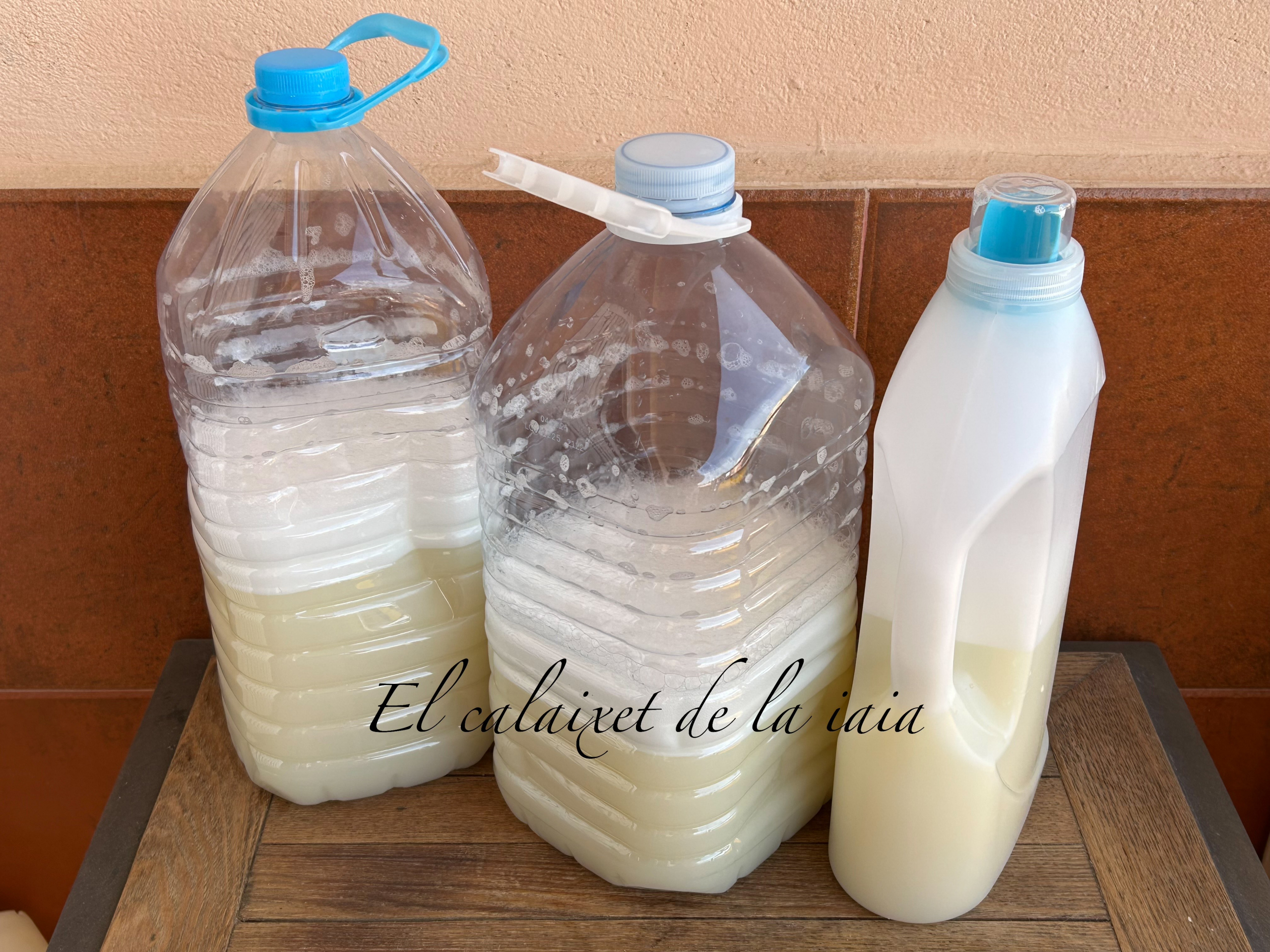 Al final, he conseguido 12 litros de jabón, con dos pastillas de 300 g en total, como veis es un ahorro muy considerable, y de apenas trabajo, eso si, varios días de reposo, remover de vez en cuando y añadir agua, si vemos que necesita, nada más.