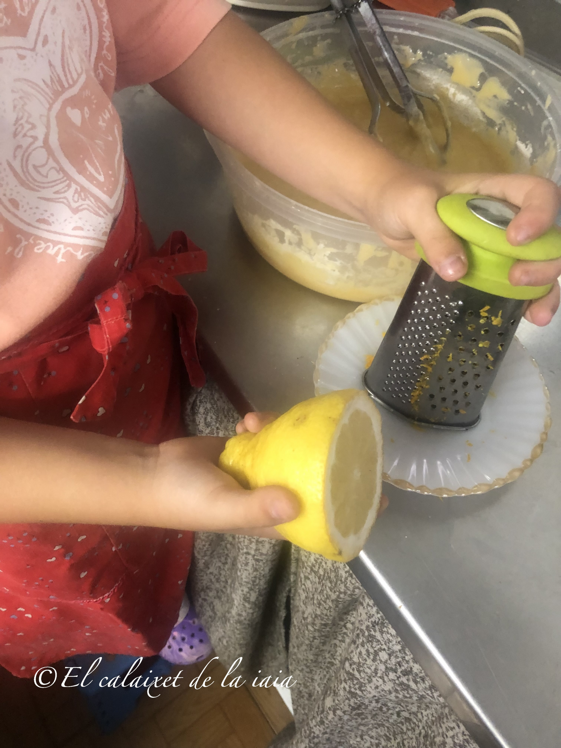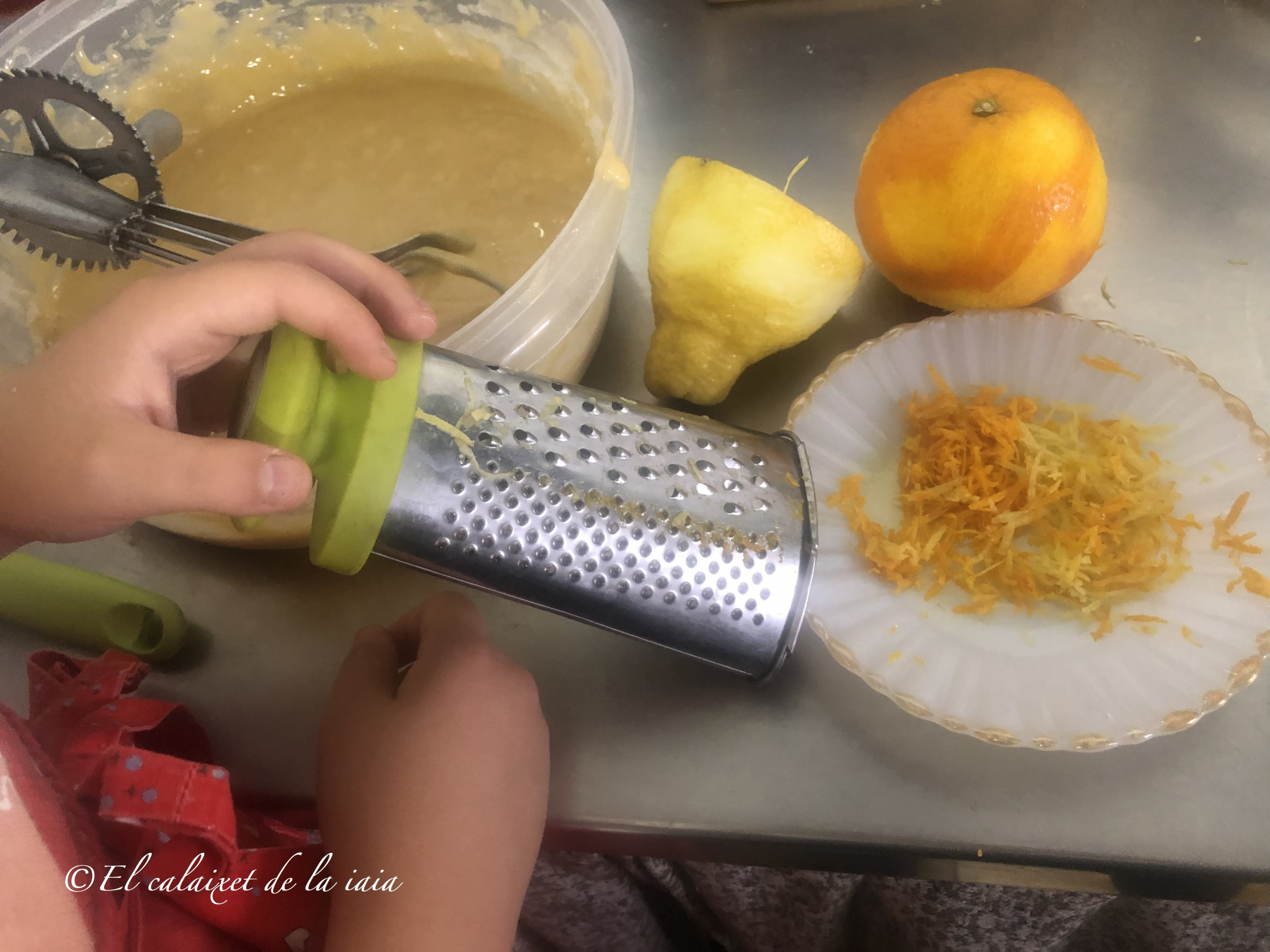 lavaremos bien un limón, sobre todo, si no son de bancal propio (porque desconocemos los químicos usados) y rallaremos bien pero procurando que sólo la piel, o sea, el flavedo, que es lo que nos da olor y color y contiene las glándulas de aceite aromático, y evitando el albedo, que es la parte blanca, porque amarga. Est aprendizaje, es fruto de las enseñanzas durante las veraniegas tardes, pasadas entre «bancals de tarongers» con mi iaio Antoniet, «Toni de Gallò» 💗.