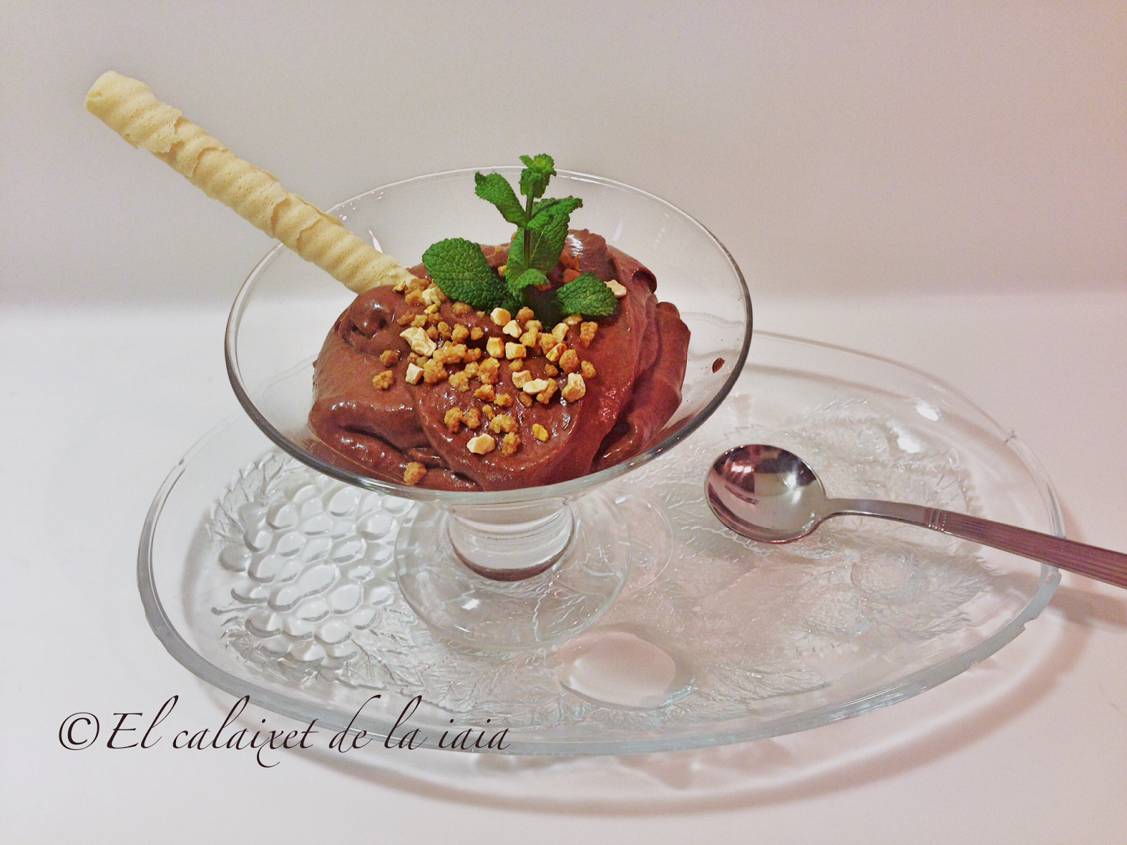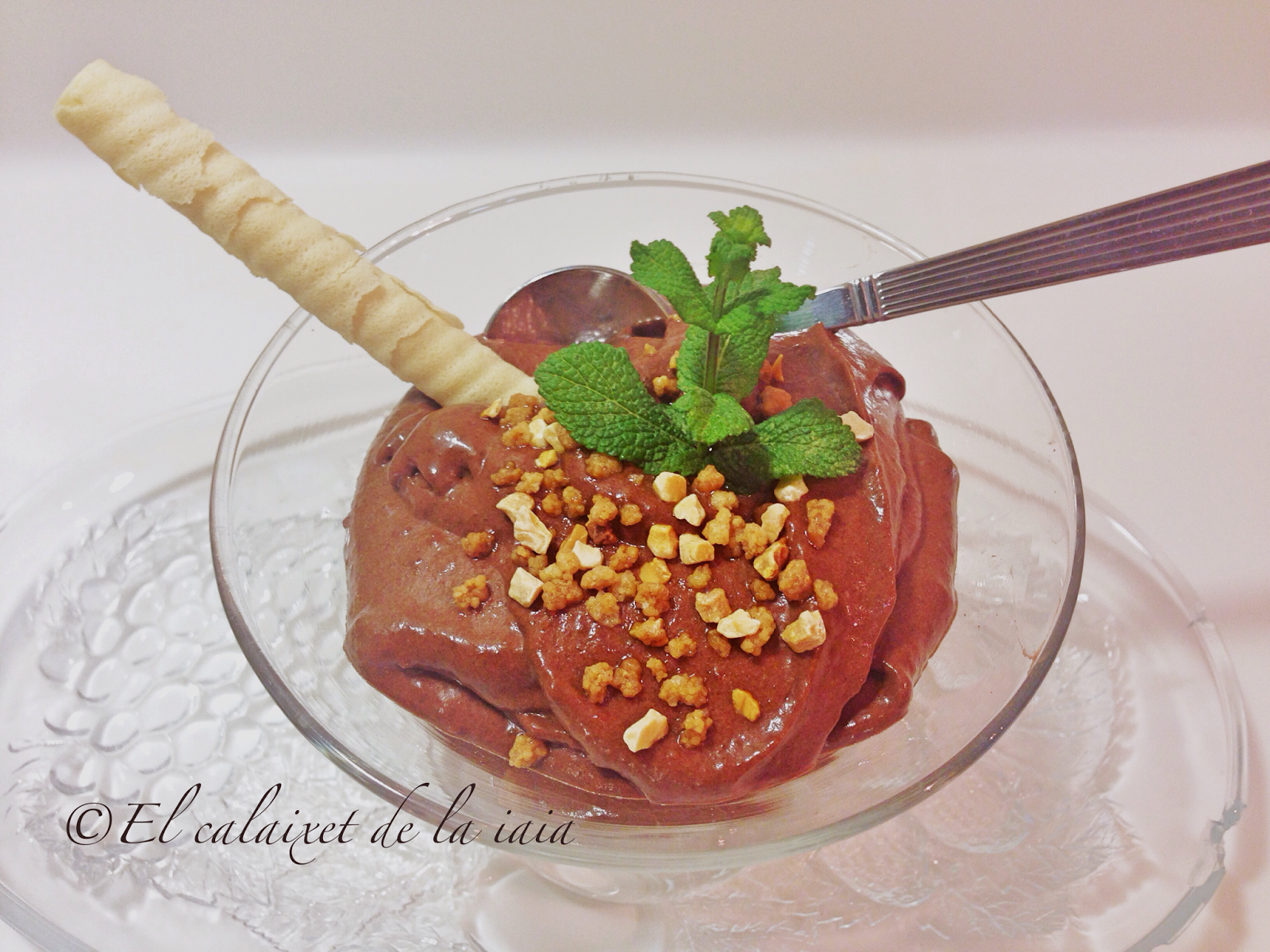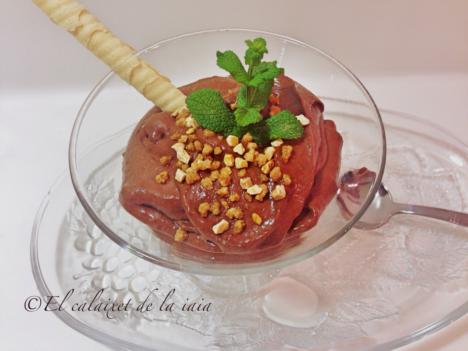 caramelo líquido, una ramita de menta , fideos o virutas de chocolate, frutos secos o una almendras crocanti.
