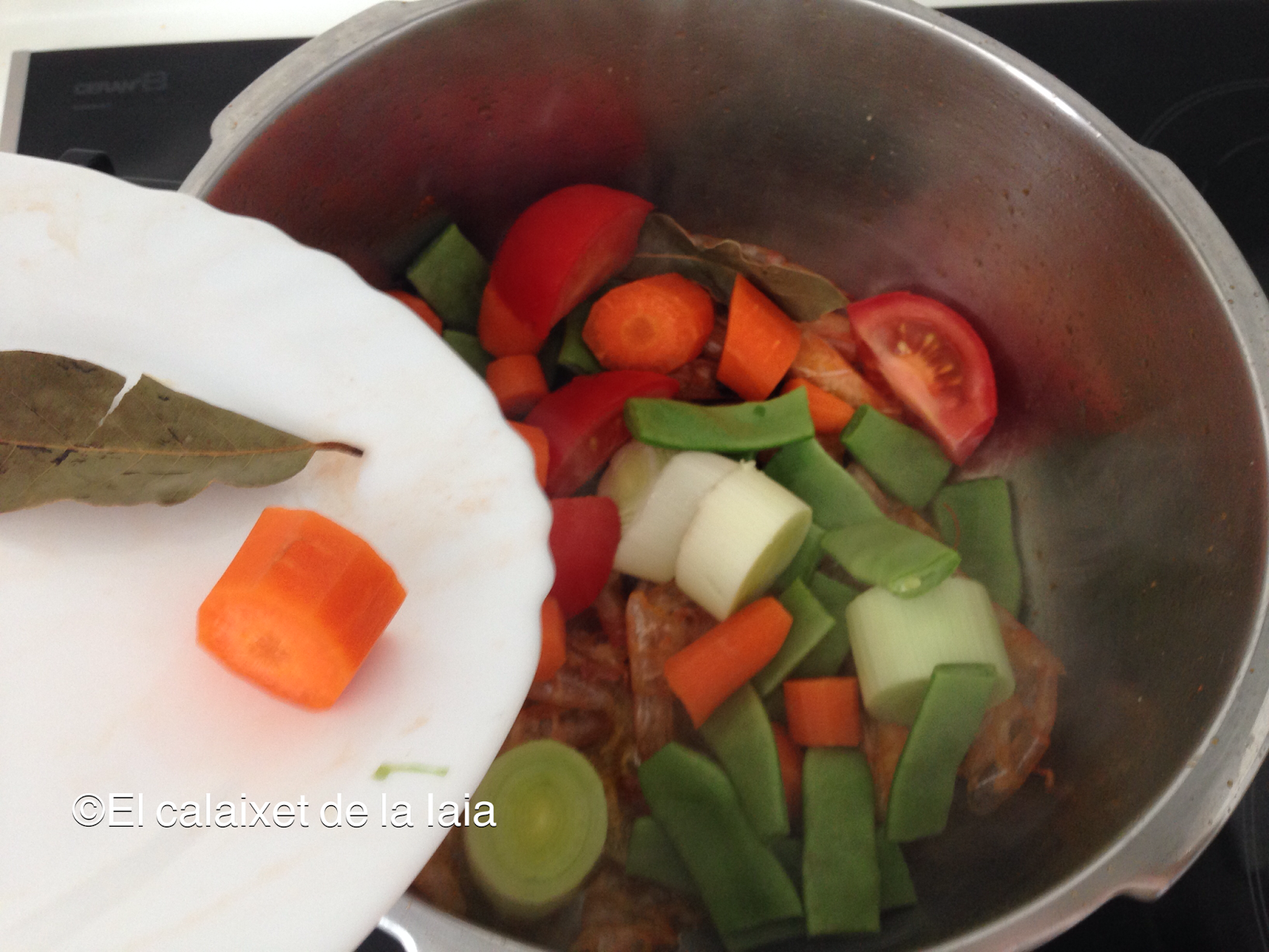 añadimos las verduras peladas y troceadas, y el laurel enjuagado