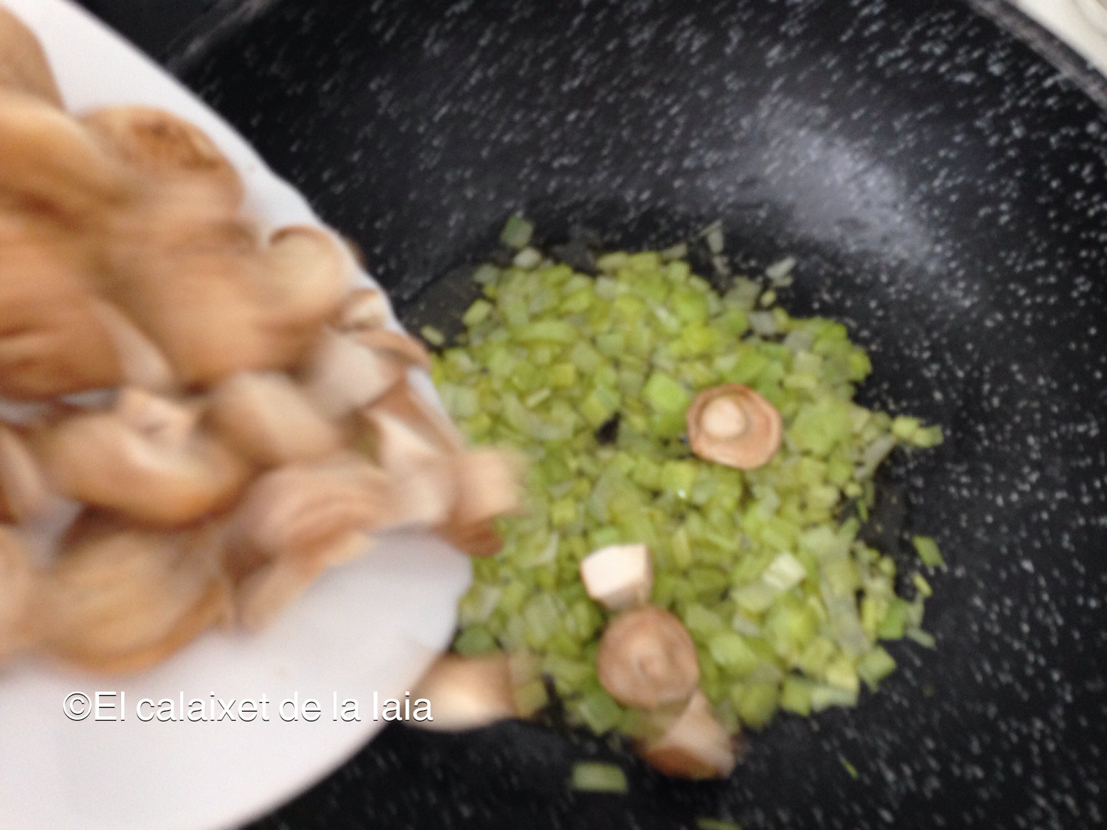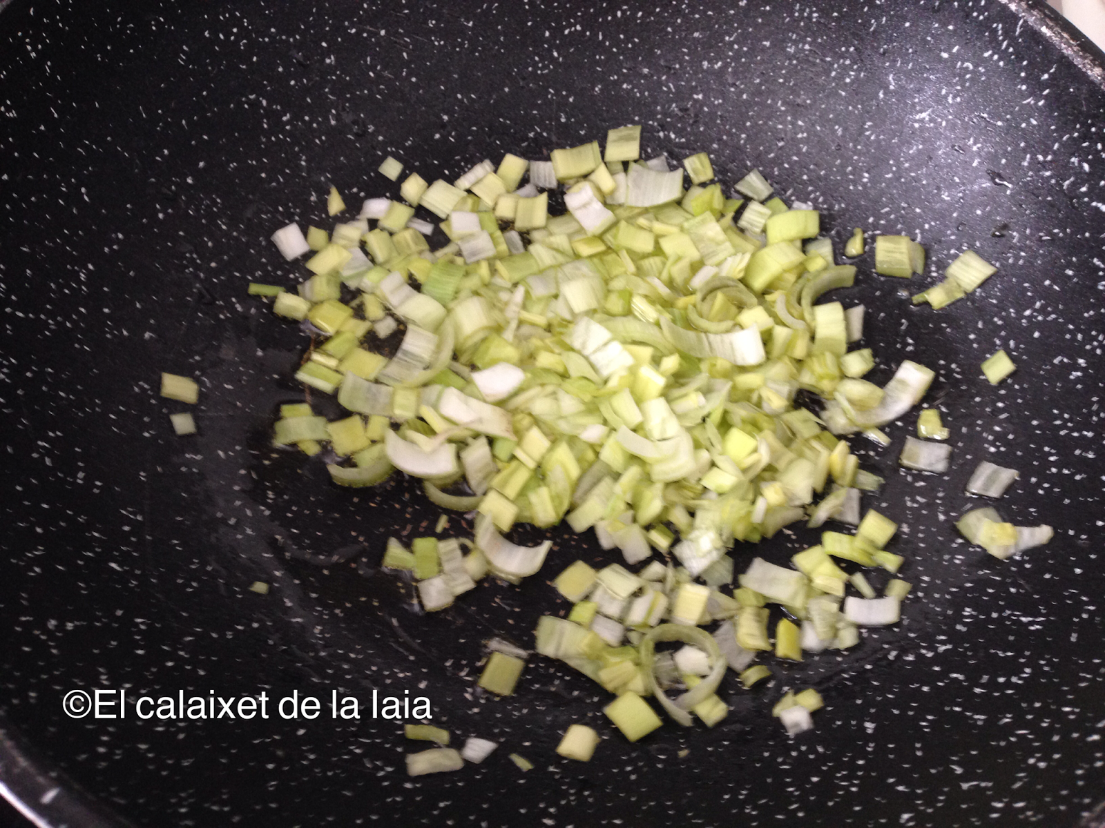 Mientras se hace el fumet, pondremos en la cazuela, aceite a calentar y pocharemos la cebolla, el ajo y el puerro picado
