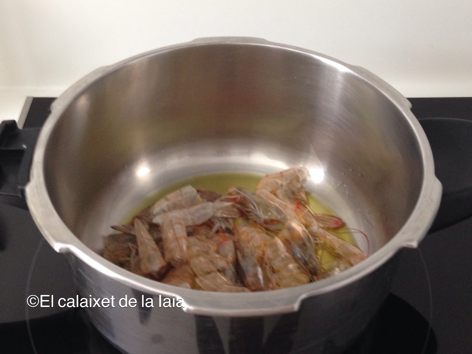 en el mismo aceite, pondremos las cabezas y las cáscaras de los langostinos y sofreímos