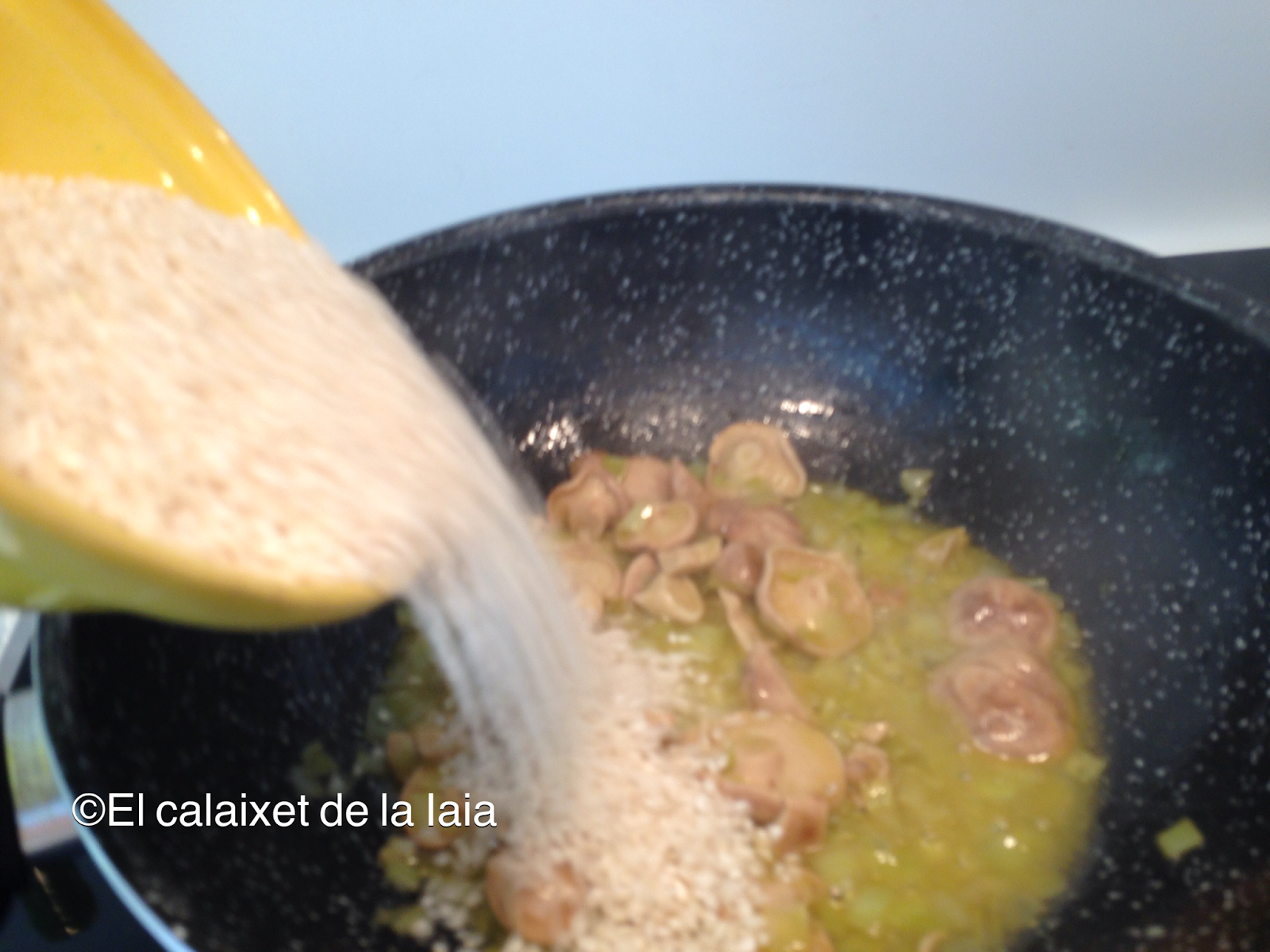 Añadiremos el arroz bomba y dejaremos rehogar un minuto
