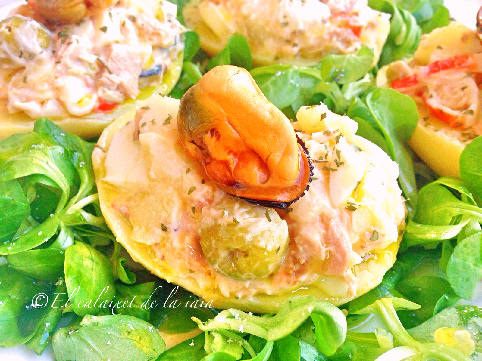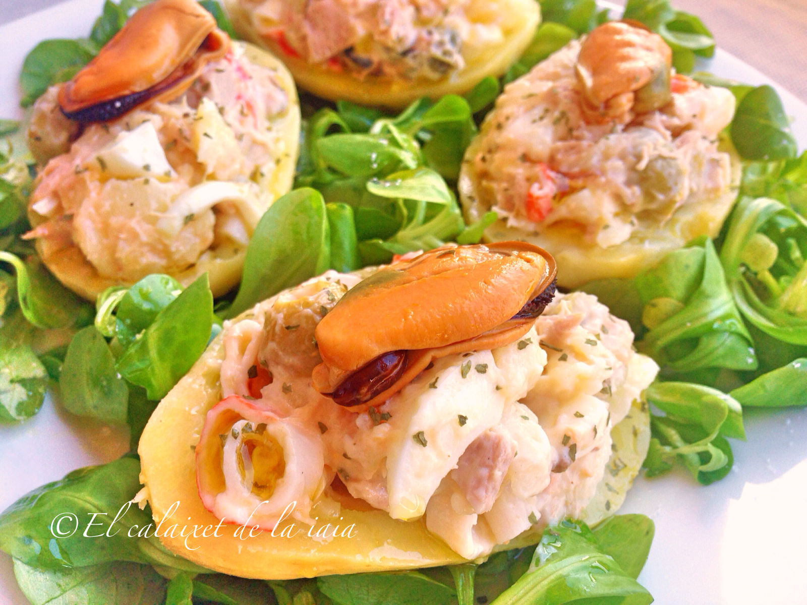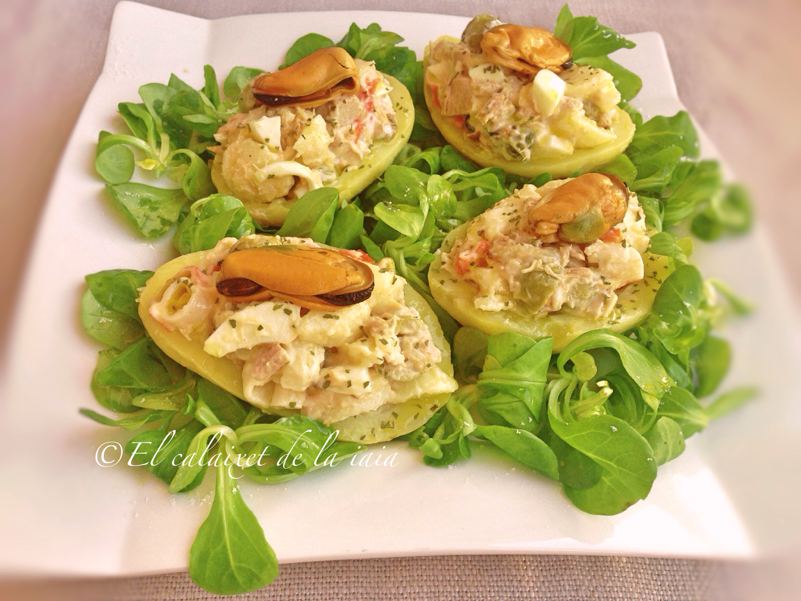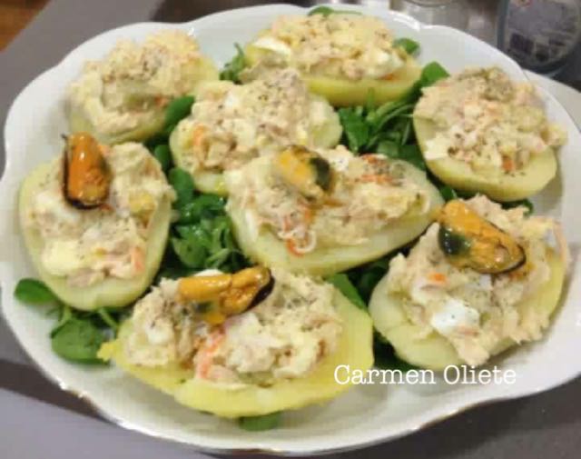 Ayer preparé unas patatas asadas rellenas de atún surimi y huevo duro en un lecho de canónigos, para cenar.