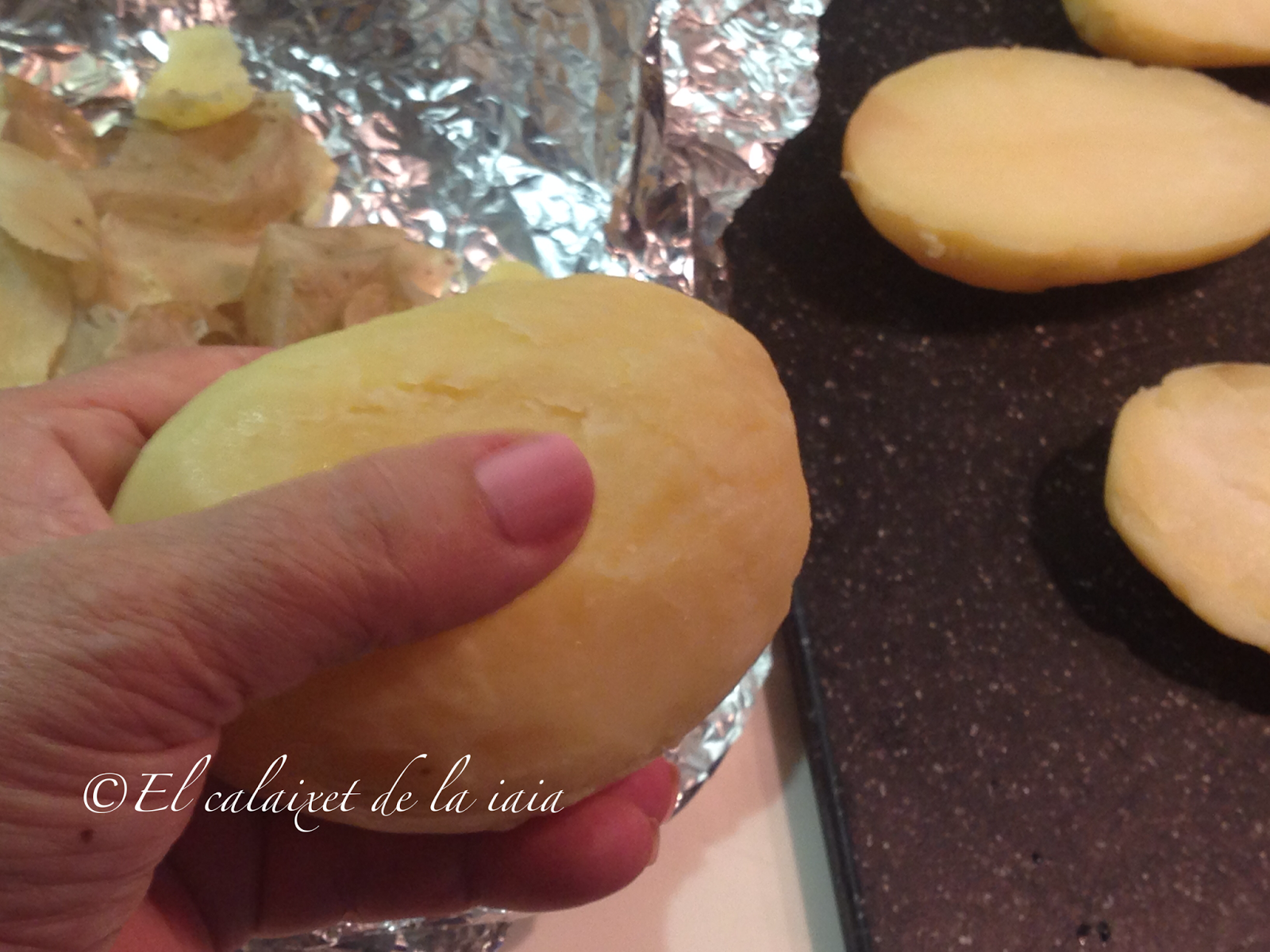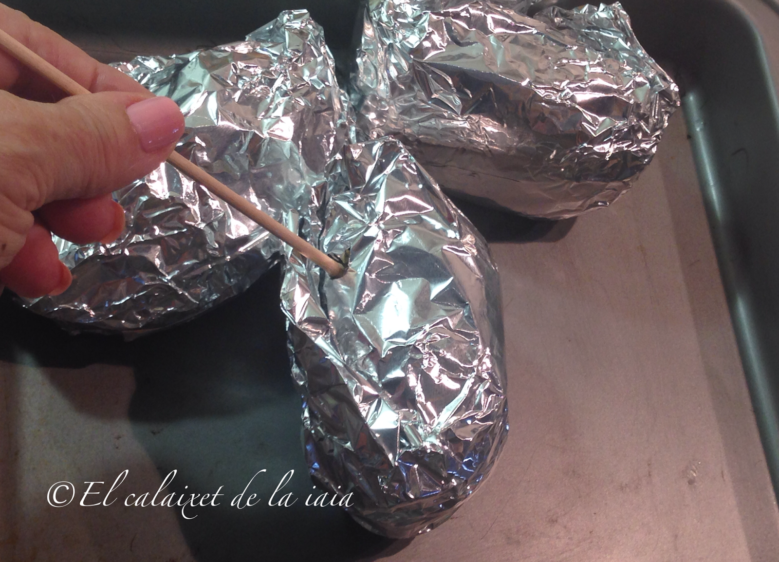 Aprovecho cuando uso el horno, para cocinar cualquier otra receta, para asar las patatas en un rinconcito y así ahorro, que la luz está muy cara, aunque también se puden hacer hervidas con la piel o en el microondas, pero yo prefiero hacerlas así. Aproveché ayer que hice pollo al horno para comer, y las puse a asar en un ladito.