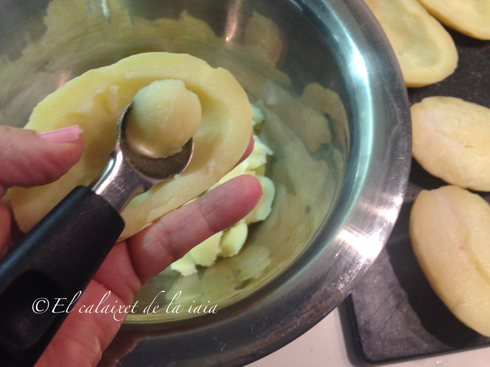 Las partiremos por la mitad y las vaciaremos con ayuda de una cucharilla, o vaciador, para dejar una especie de cestillos o barquitas, reservando la patata que extraigamos en un bol o recipiente