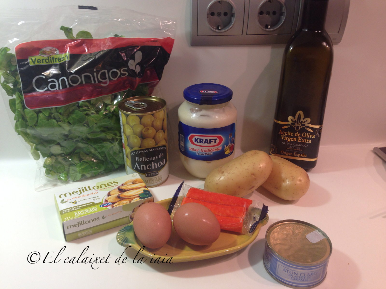 añadiremos a la patata extraída, el atún, los huevos troceados, el surimi, la mayonesa, las aceitunas cortadas por la mitad y los mejillones escurridos y partidos por la mitad, reservando seis (uno por cada barquita) para decorar, mezclaremos