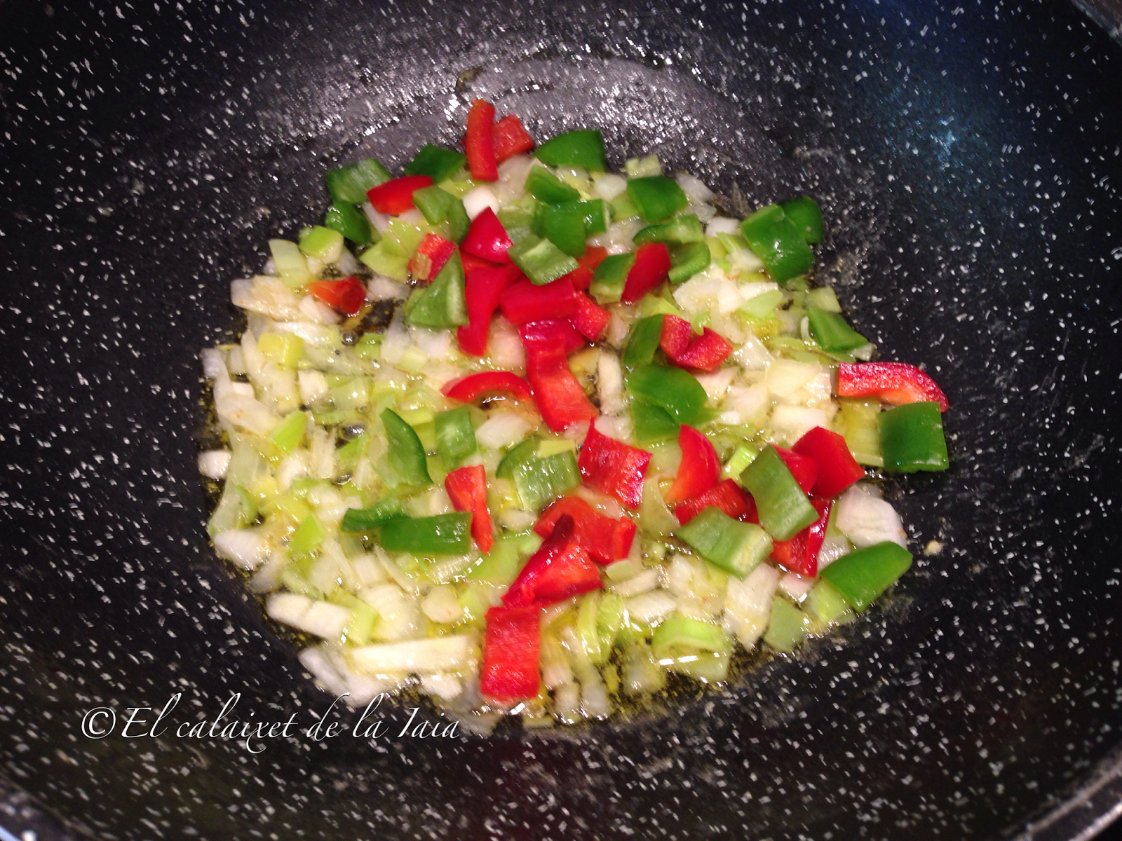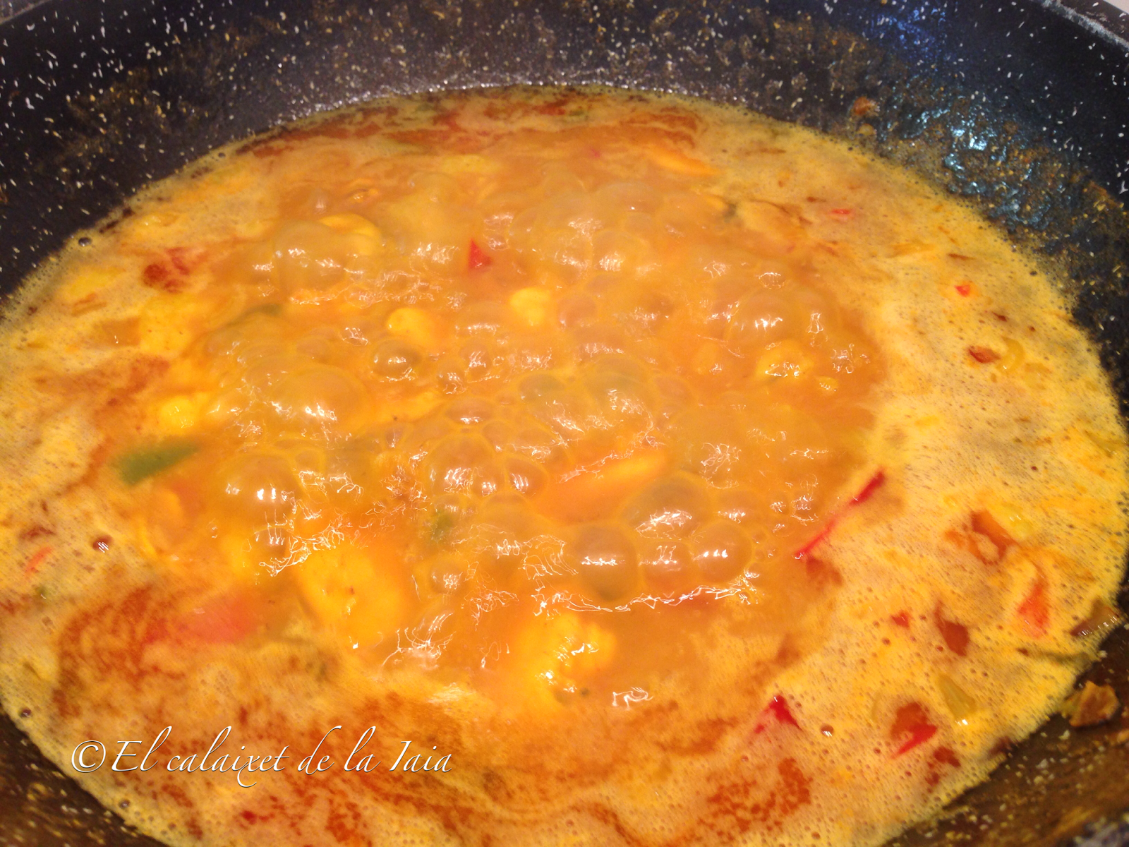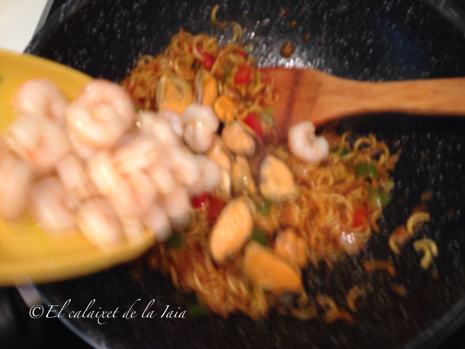 cómo no queda otra que reponerse en casita tranquilamente, a esperar la llamada de los médicos, y mi chico no está para comer fuera, paso revista al congelador y veo que hay un riquísimo caldo de morralla y cabezas de langostinos, unas «clòtxines» que compré el otro día y como mi maridín no tenía ganas de comer, los hice al vapor y los congelé, unas gambas, y como nos encantan los fideos a la cazuela, y tengo algunas verduras en el frigo… improvisaré unos con lo que tengo en casa.