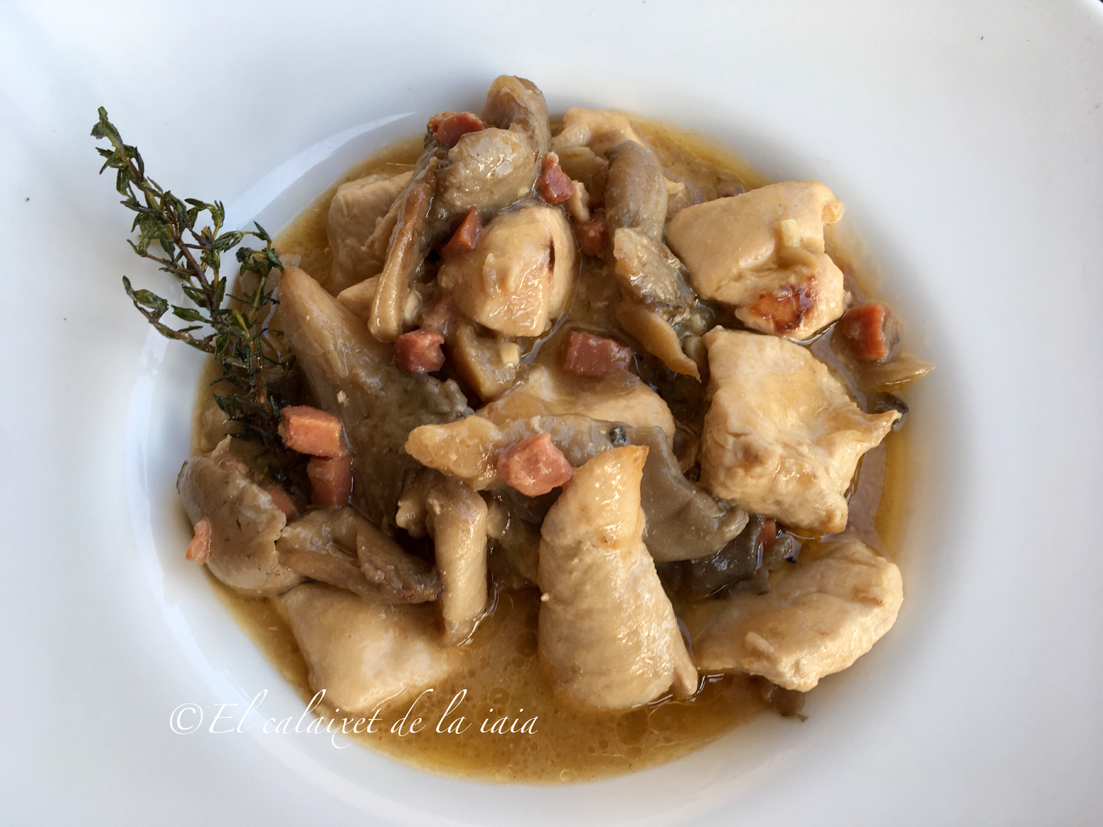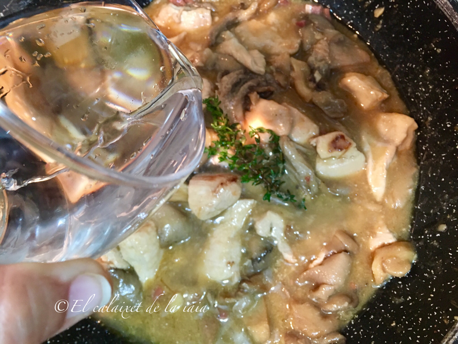 a continuación añadimos un vaso de agua, removemos y dejamos que se cocine el pollo hasta que se evapore la mitad de el caldo y la salsa espese
