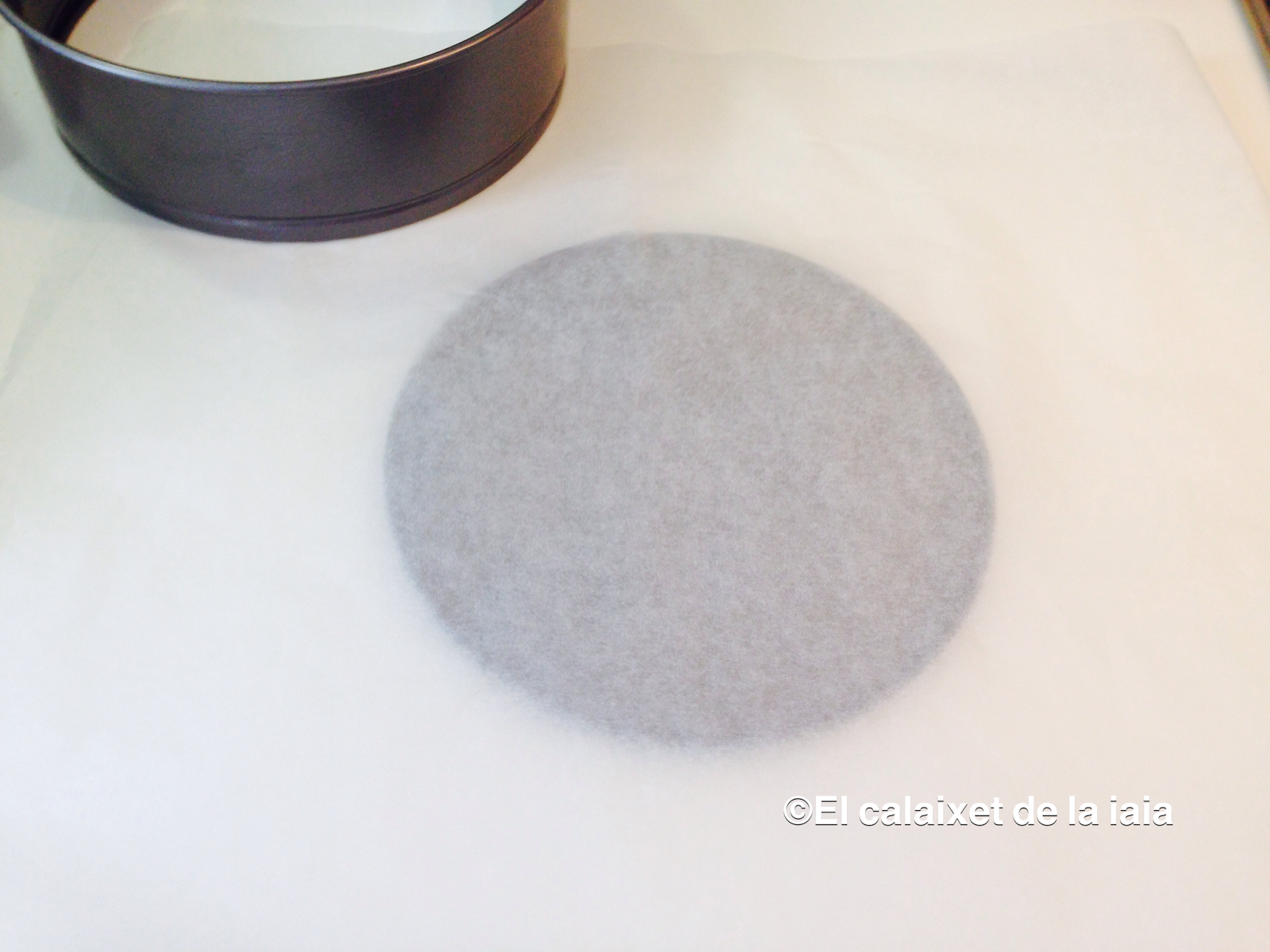 Preparamos un molde de 26cm para que quede estanco, para ello utilizaremos el truco de poner una hoja de papel sulfurizado, encerado o de horno sobre la base del molde