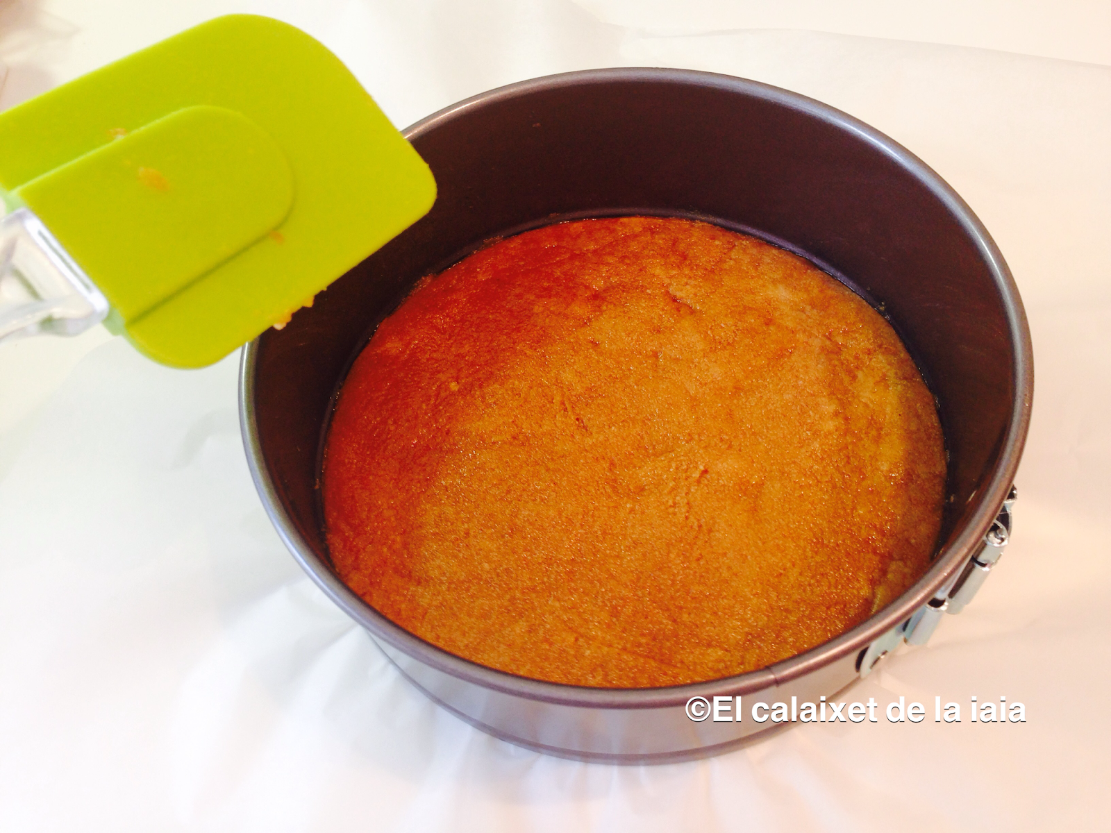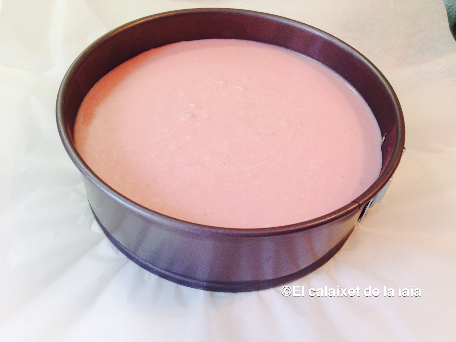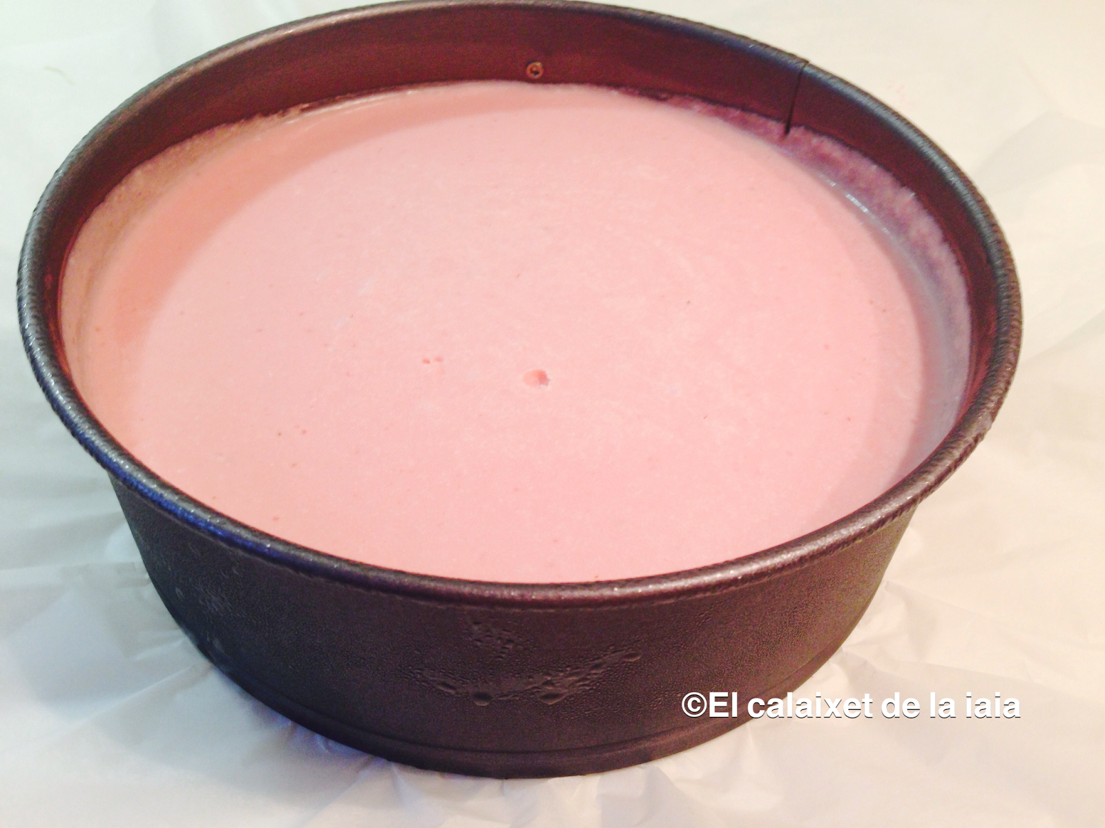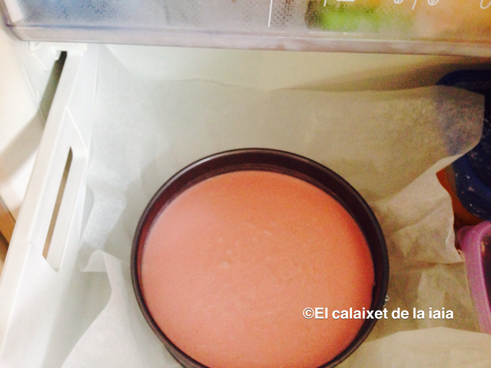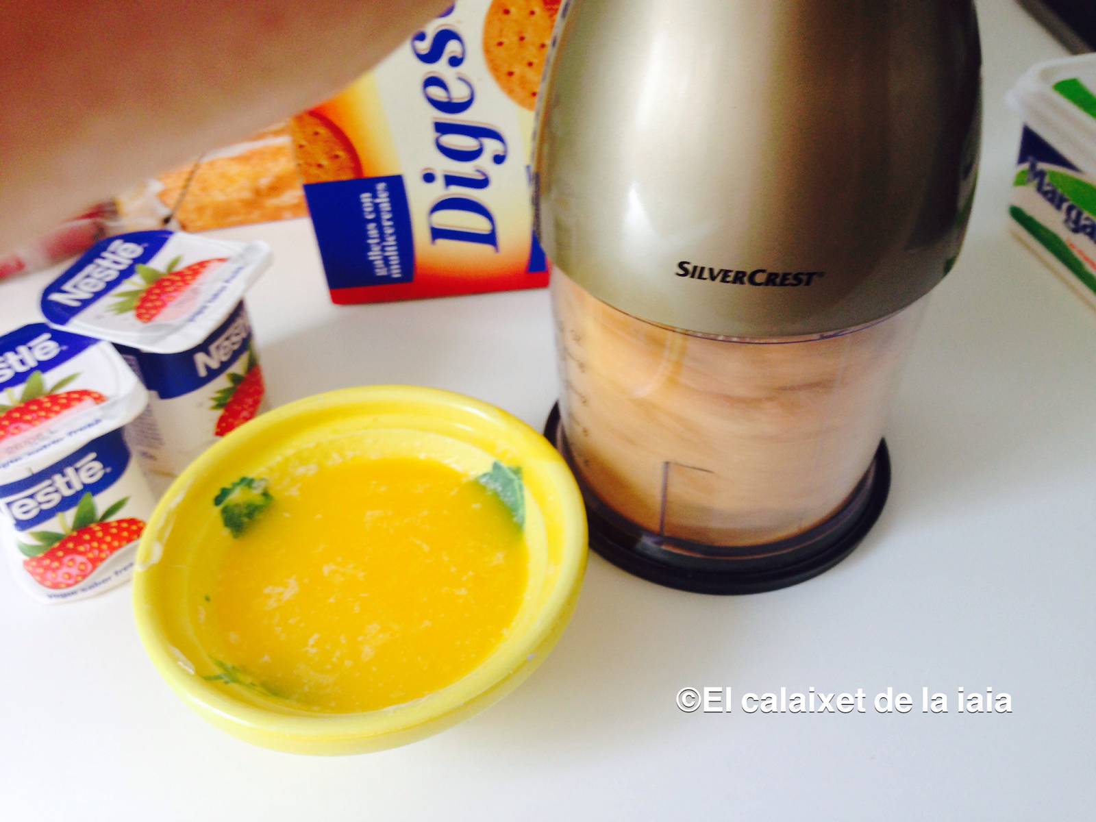 colocaremos la masa de galleta aprisionando bien para que quede el fondo cubierto y lo mas uniforme posible, dejaremos enfriar en el frigo para que se ponga dura la base, mientras preparamos la mezcla