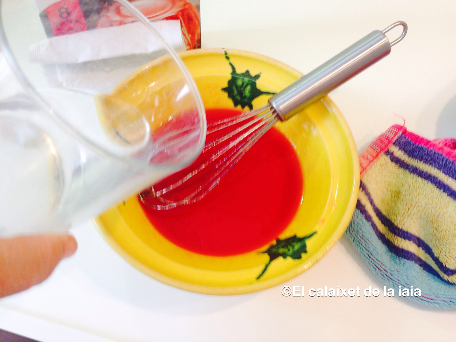 prepararemos la gelatina poniendo a hervir 100ml de agua y volcando en un bol