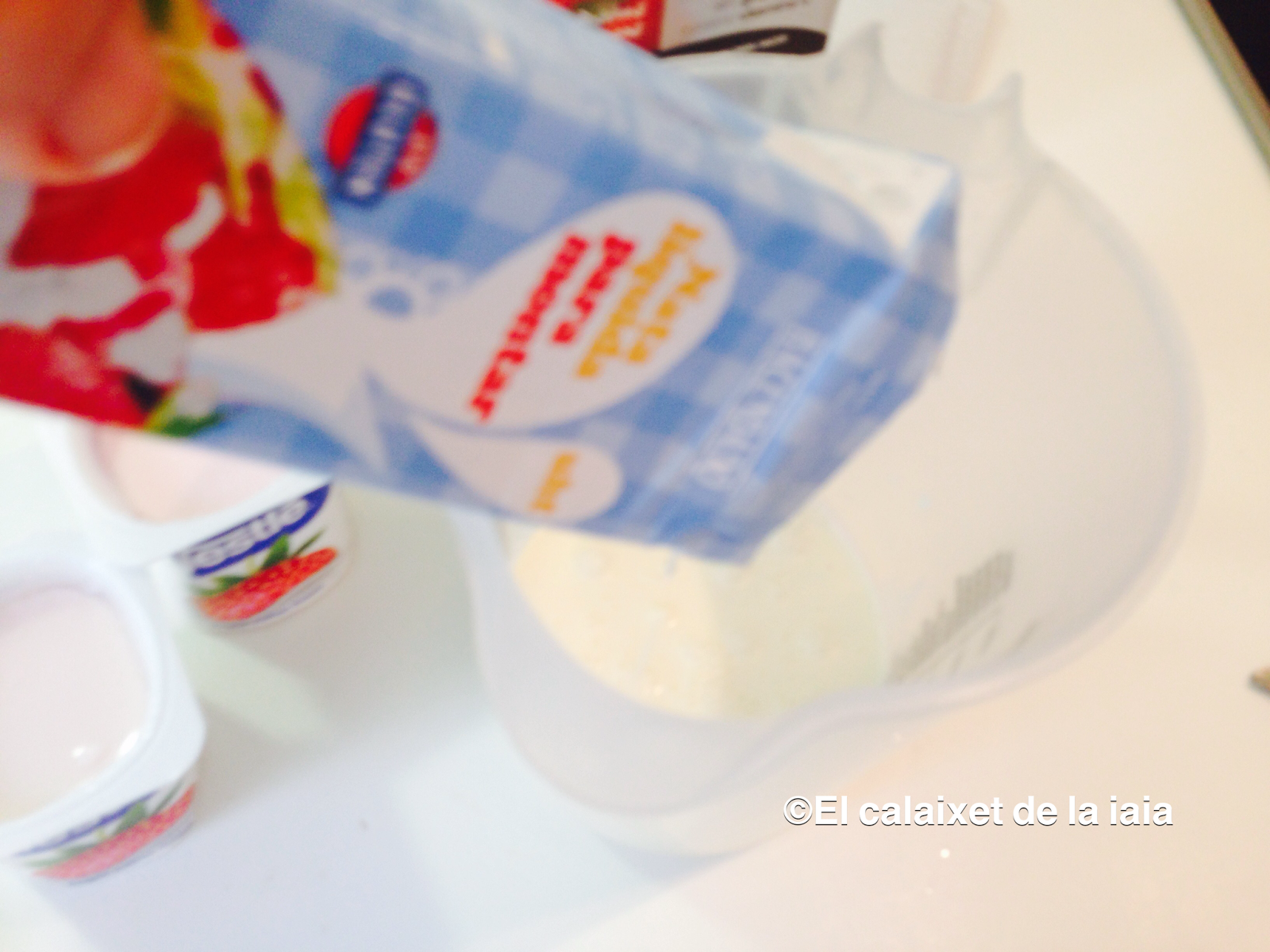 añadimos tres cucharadas de azúcar los dos yogures de fresa ,75g de leche condensada y batiremos