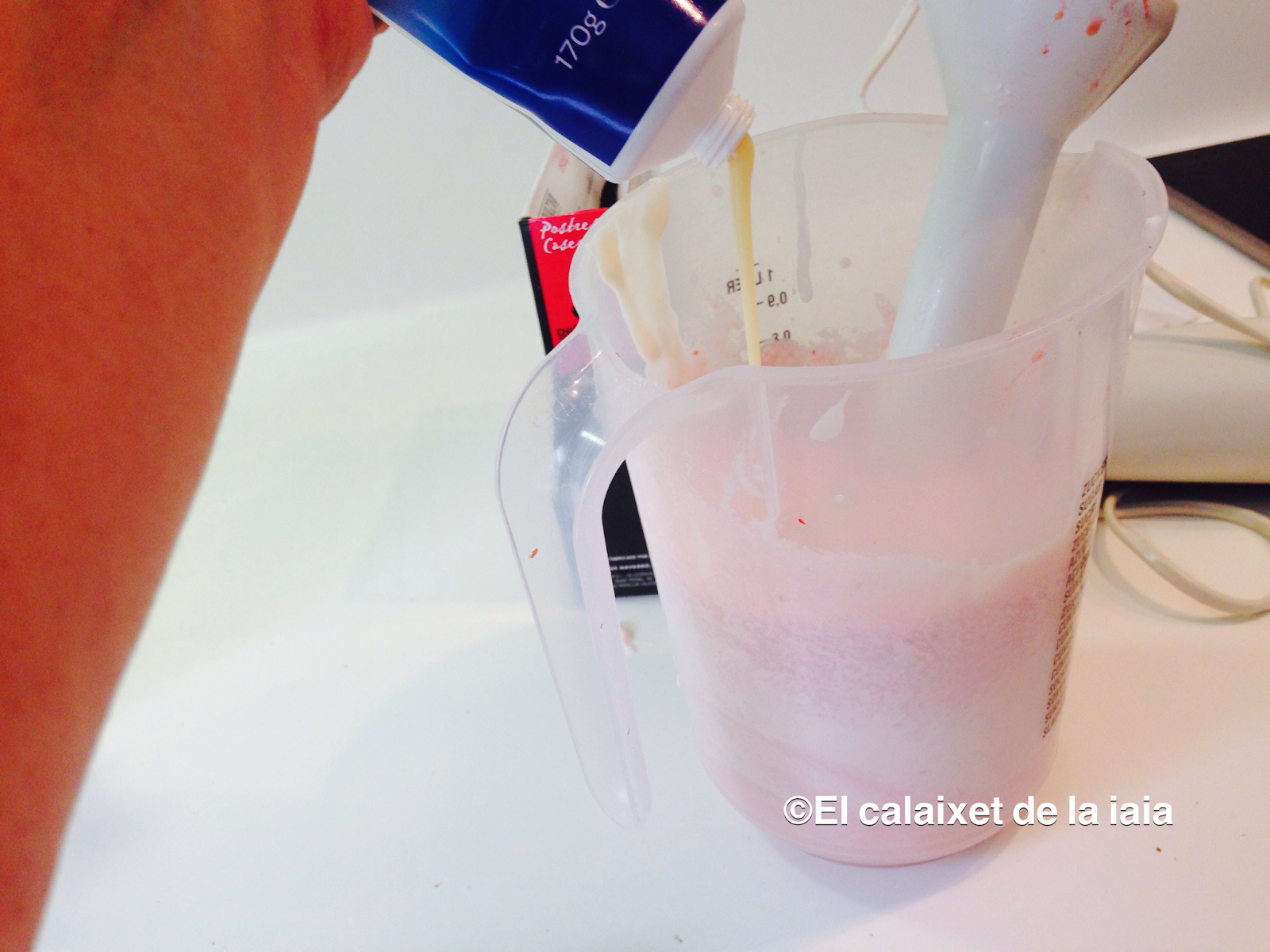 pondremos la nata o crema de leche en el vaso de batir y batiremos con las varillas