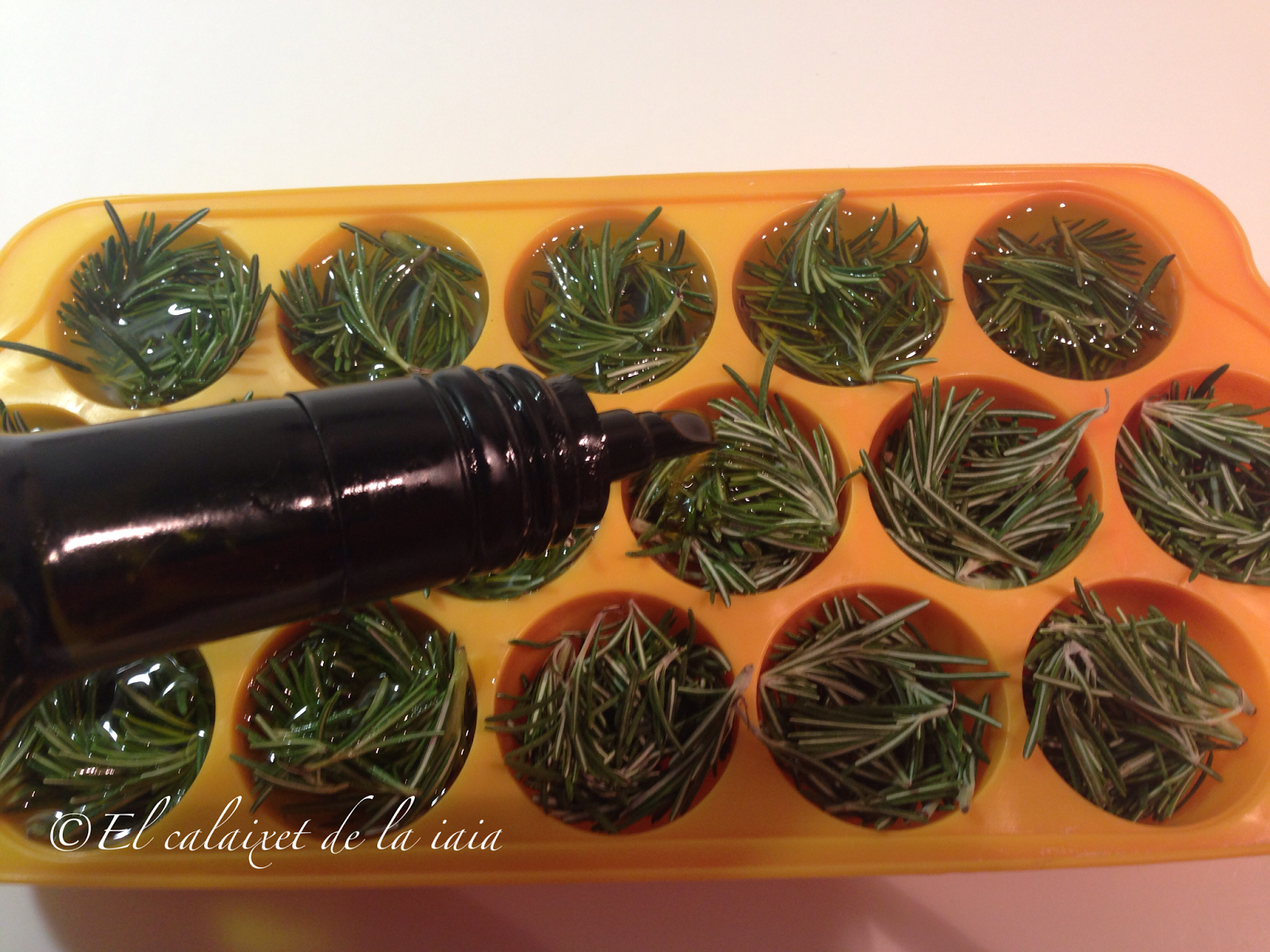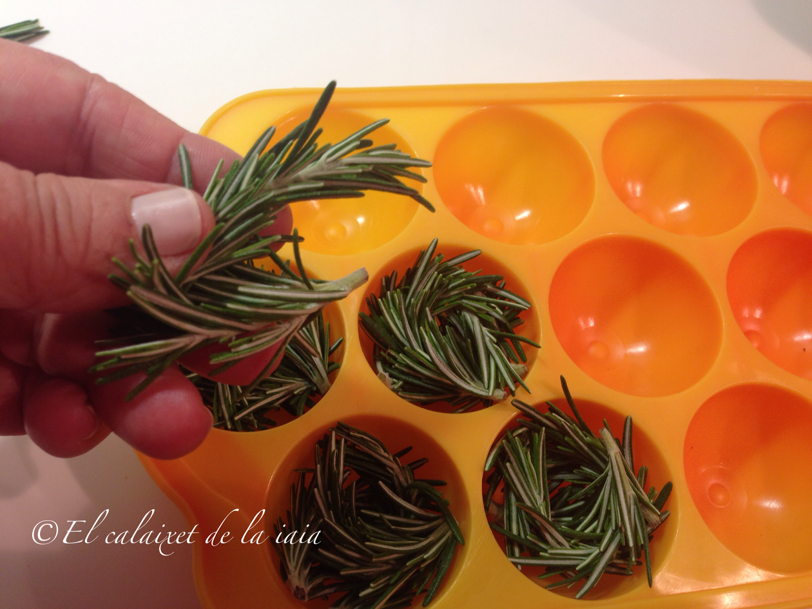 Lavaremos y secaremos bien las hierbas seleccionadas y las iremos ponendo en los huecos de las cubiteras