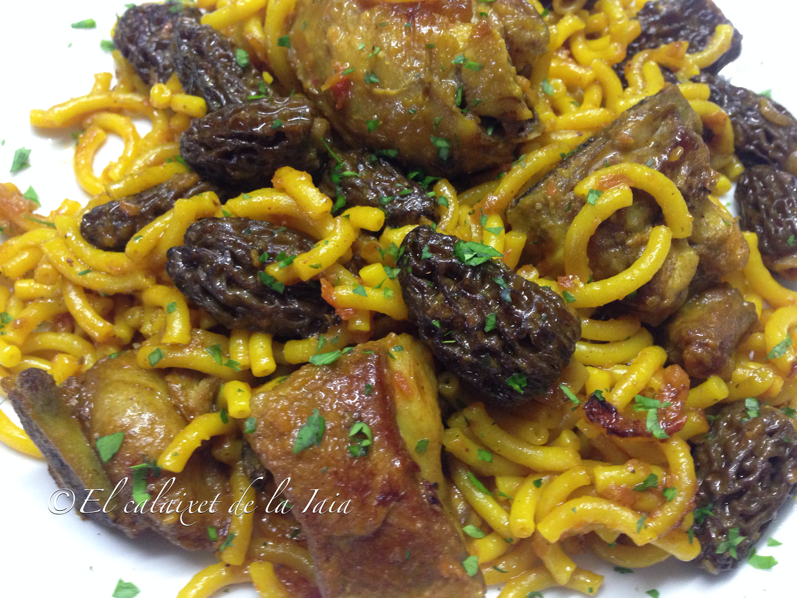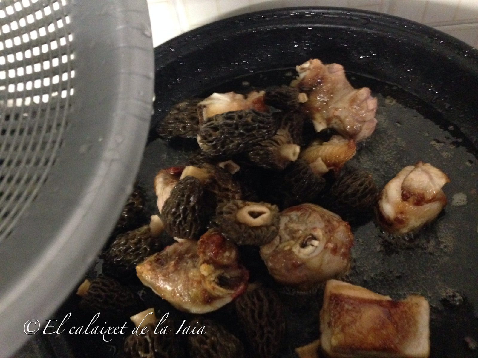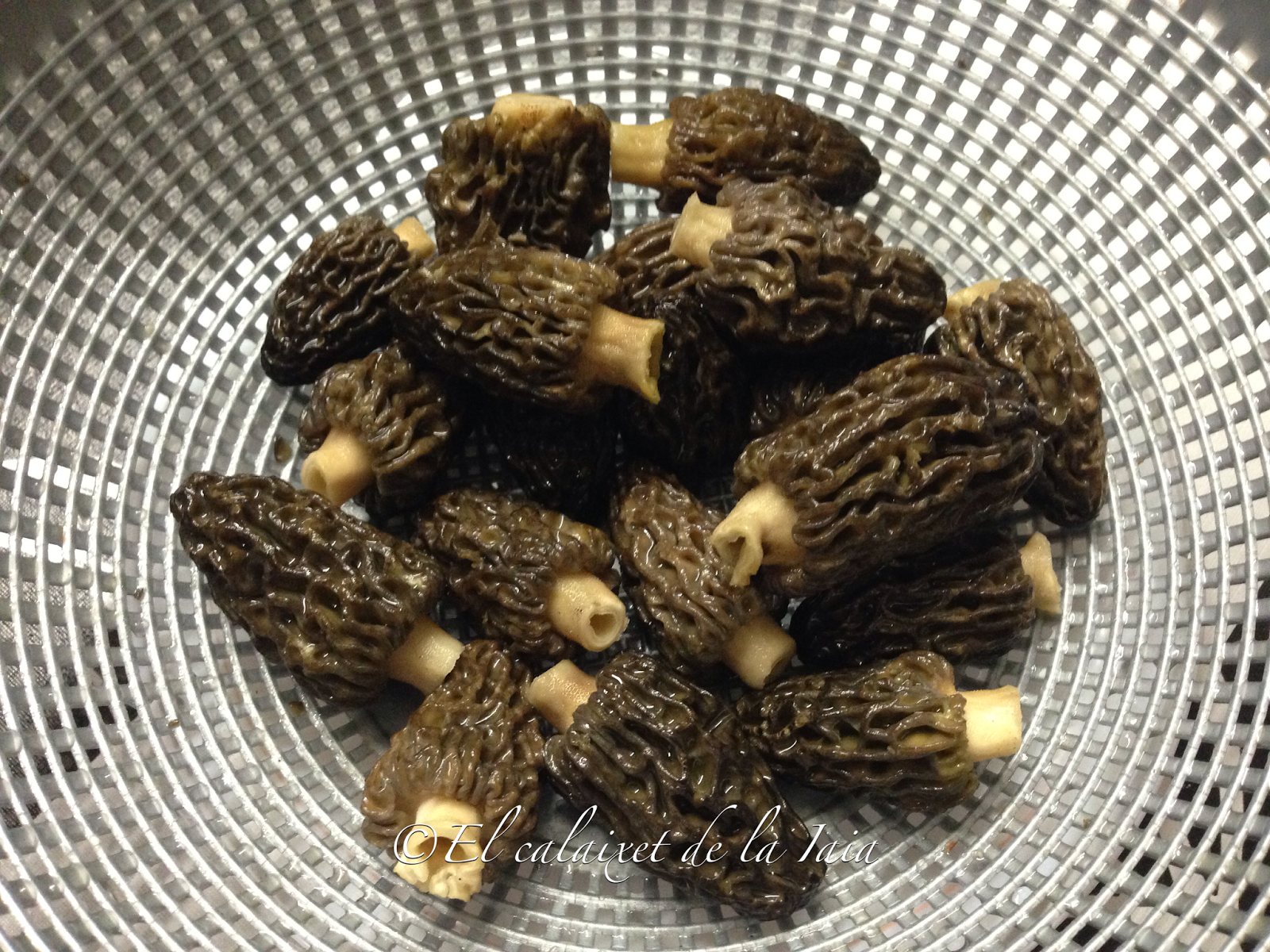 Cuando estamos en el pueblo y es temporada de setas, mi chico se niega a venderlas, incluso ahora que las compran aquí a 18€ el kilo… imaginaros si las pagan así en origen, que difíciles y escasas son de encontrar, aunque de repente, te encuentras un grupo grande y llenas el cestito, no es lo normal. Nosotros vamos a buscarlas por afición, y por disfrutar del bosque y solemos secarlas, algunas las molemos, otras las guardamos deshidratadas y otras las regalamos frescas a amigos y familiares, si bajamos pronto a Valencia, y ésto nos produce más satisfacción, ya que no somos de los que van como esquilmadores, en busca de setas. Mas bien nos gusta coger, las que podemos comer y disfrutar. Es por éso que suelo inventar platos para comerlas, principalmente las colmenillas, ya que son las setas que a mi, y a mi chico, particularmente mas nos gustan.