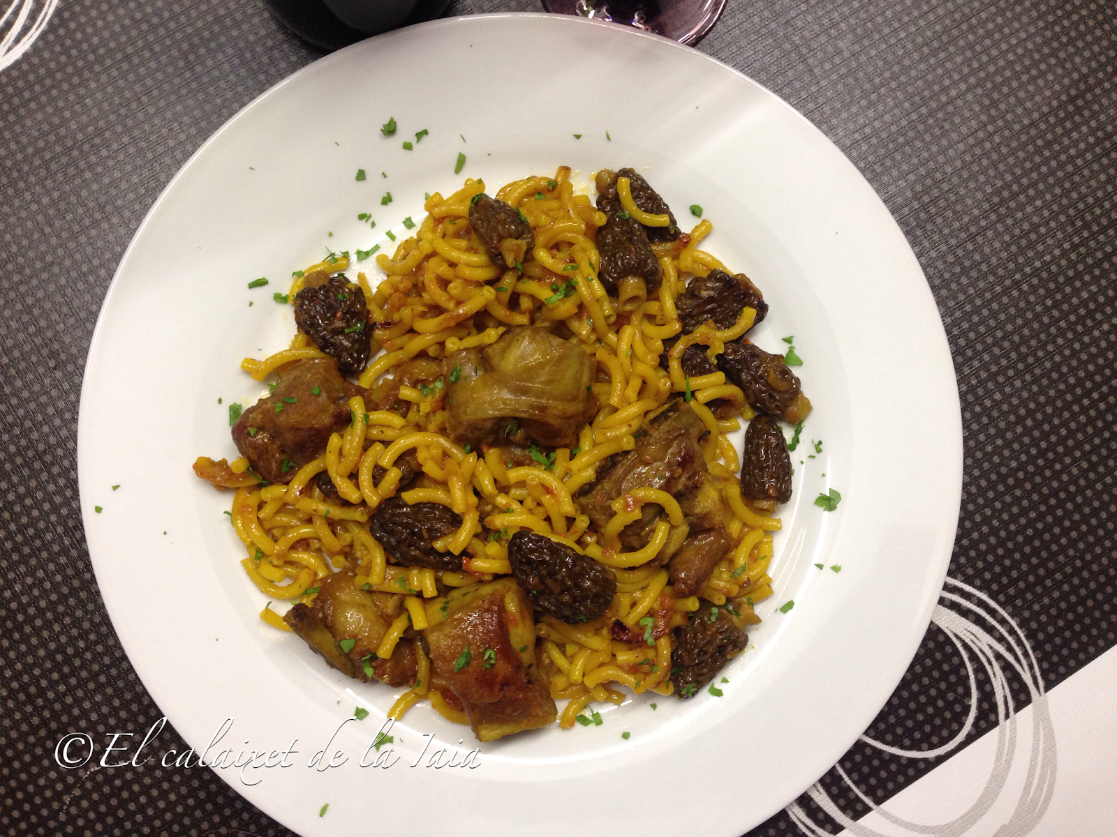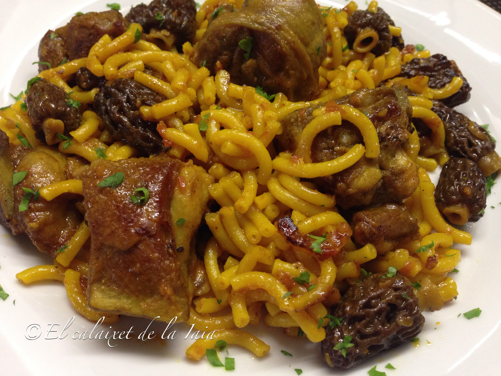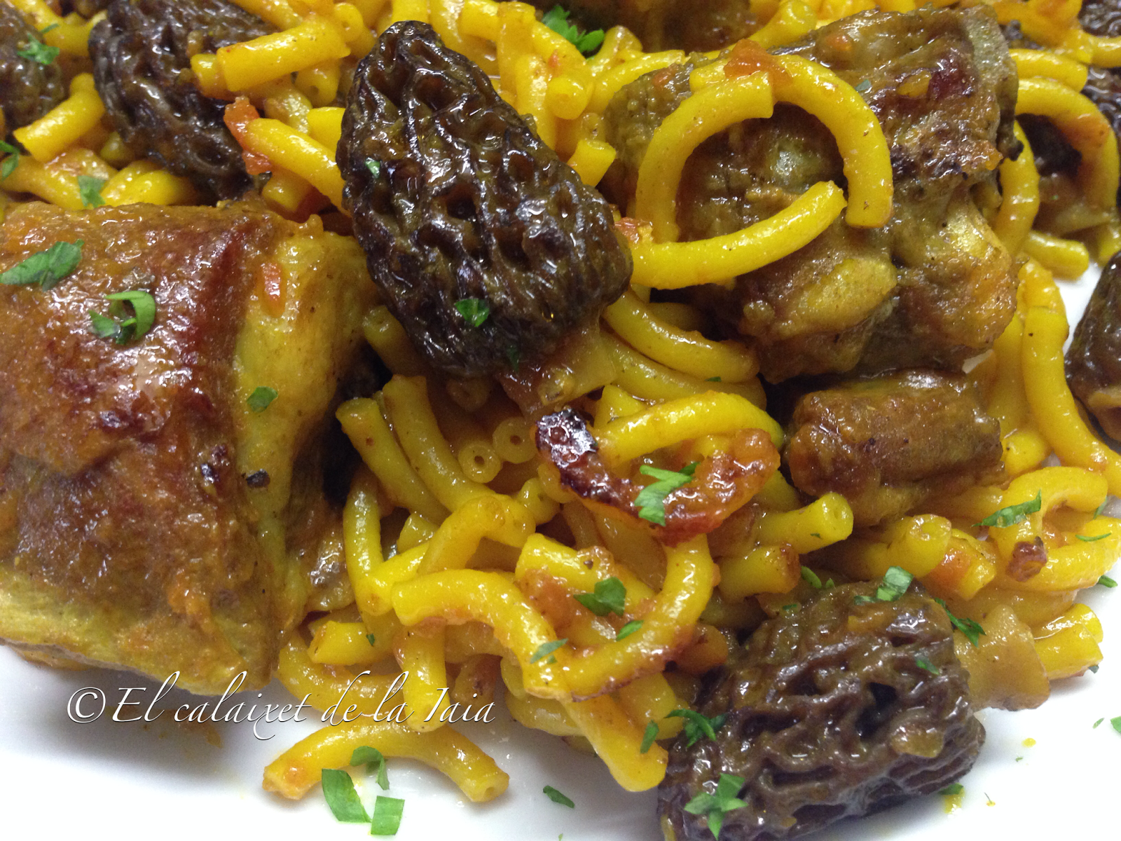 Cuando estamos en el pueblo y es temporada de setas, mi chico se niega a venderlas, incluso ahora que las compran aquí a 18€ el kilo… imaginaros si las pagan así en origen, que difíciles y escasas son de encontrar, aunque de repente, te encuentras un grupo grande y llenas el cestito, no es lo normal. Nosotros vamos a buscarlas por afición, y por disfrutar del bosque y solemos secarlas, algunas las molemos, otras las guardamos deshidratadas y otras las regalamos frescas a amigos y familiares, si bajamos pronto a Valencia, y ésto nos produce más satisfacción, ya que no somos de los que van como esquilmadores, en busca de setas. Mas bien nos gusta coger, las que podemos comer y disfrutar. Es por éso que suelo inventar platos para comerlas, principalmente las colmenillas, ya que son las setas que a mi, y a mi chico, particularmente mas nos gustan.