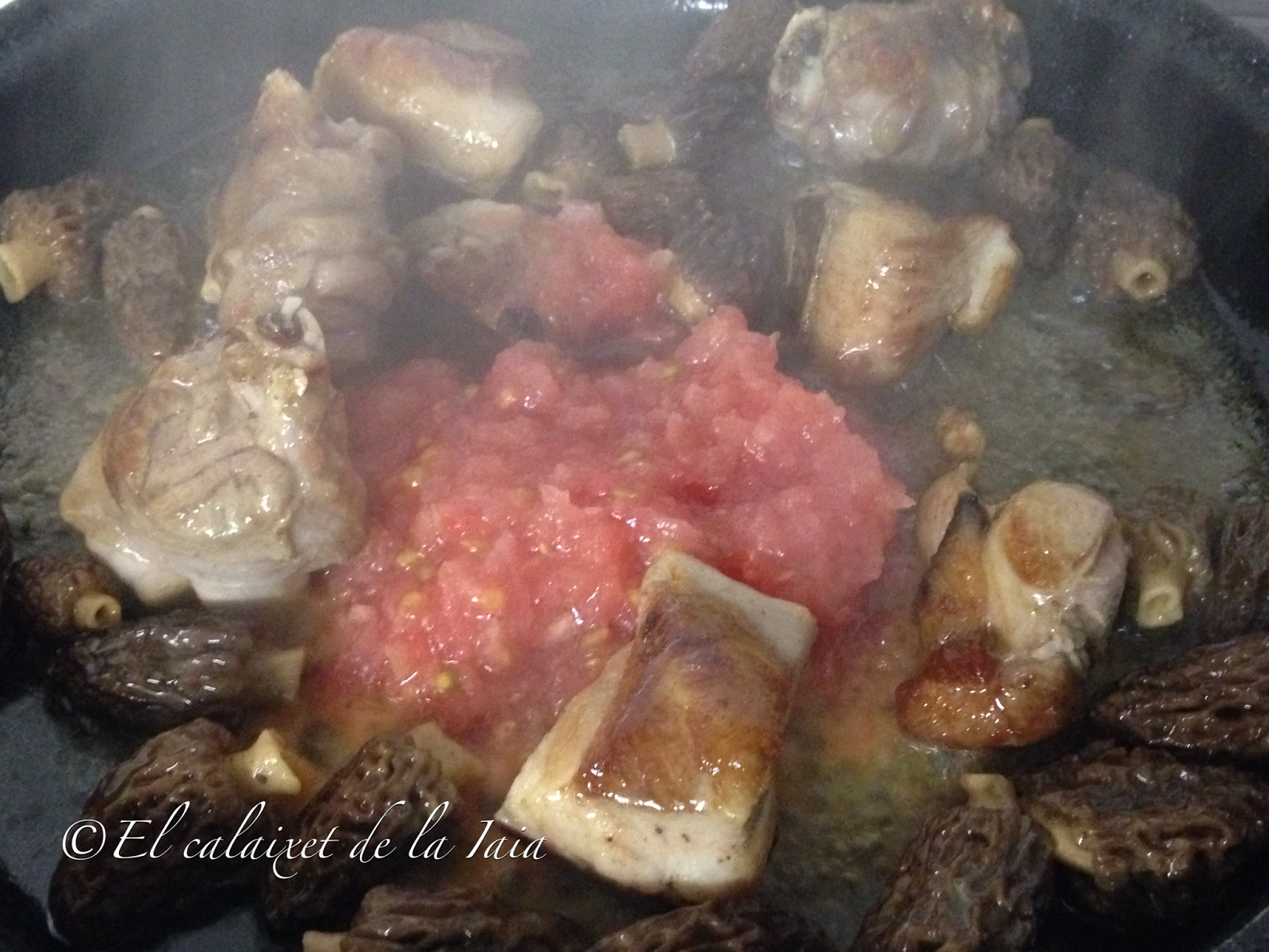 En éste caso, tenía una garreta y unos trozos de pecho de cordero en el congelador (aquí no hay tienda ni comercio alguno y hemos tirar de arcón congelador siempre) y se me ha ocurrido ésta receta para dos, que se podría hacer con cualquier clase de setas, incluso con champiñones cultivados, aunque os recomiendo ésta seta, que como es cara aún, no es necesario gastar mucho, con poquitas es suficiente y dejan un excelente sabor, ya que la colmenilla es una auténtica delicatessen.
